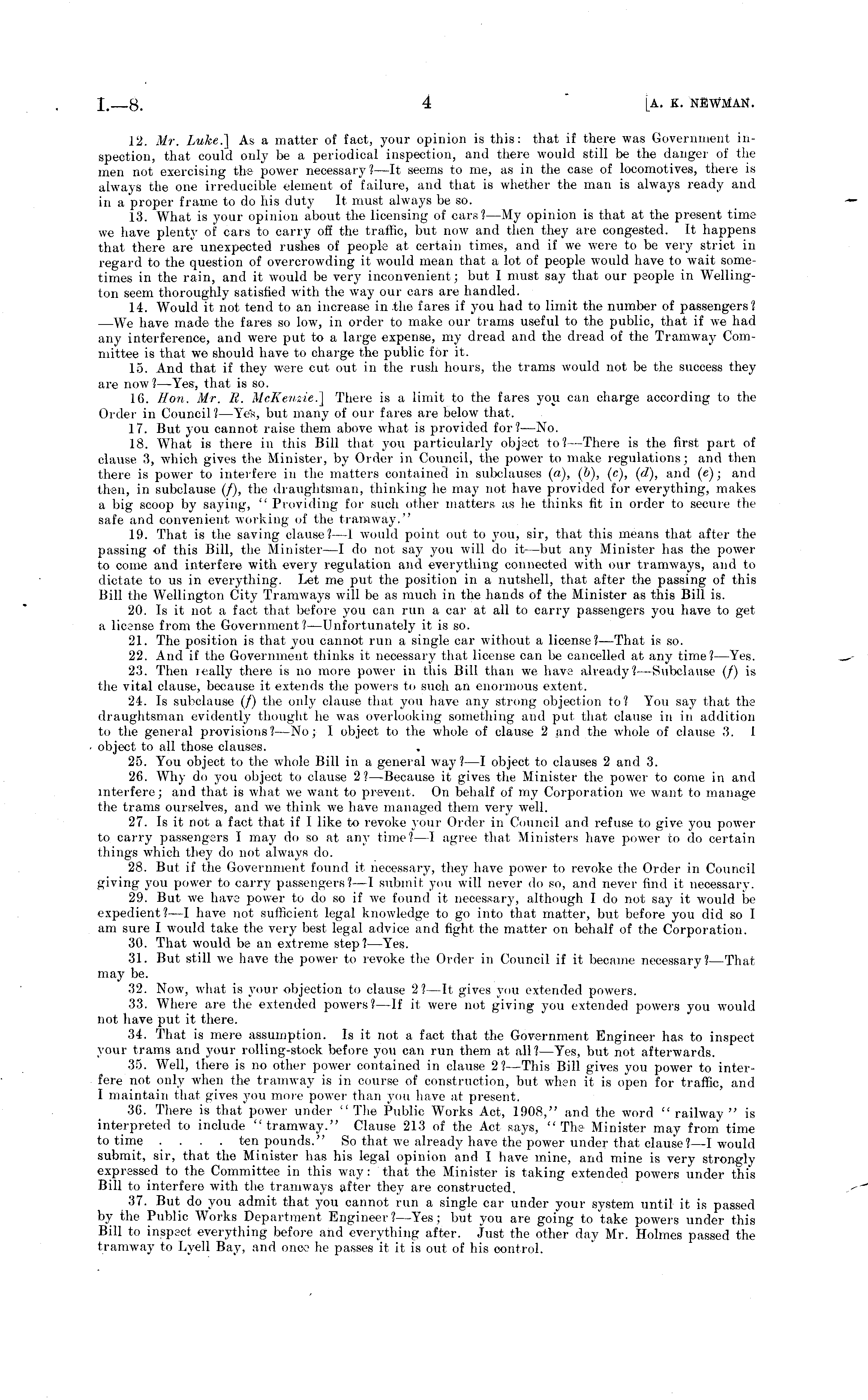 12. Mr. Luke.] As a matter of fact, your opinion is this: that if there was Government inspection, that could only be a periodical inspection, and there would still be the danger of the men not exercising the power necessary? —It seems to me, as in the case of locomotives, there is always the one irreducible element of failure, and that is whether the man is always ready and in a proper frame to do his duty It must always be so. 13. What is your opinion about the licensing of cars?—My opinion is that at the present time we have plenty of cars to carry off the traffic, but now and then they are congested. It happens that there are" unexpected rushes of people at certain times, and if we were to be very strict in regard to the question of overcrowding it would mean that a lot of people would have to wait sometimes in the rain, and it would be very inconvenient; but I must say that our people in Wellington seem thoroughly satisfied witli the way our cars are handled. 14. Would it not tend to an increase in the fares if you had to limit the number of passengers? —We have made the fares so low, in order to make our trams useful to the public, that if we had any interference, and were put to a large expense, my dread and the dread of the Tramway Committee is that we should have to charge the public for it. 15. And that if they were cut out in the rush hours, the trams would not be the success they are now? —Yes, that is so. IG. Hon. Mr. It. McKeinie.] There is a limit to the fares you can charge according to the Order in Council? —Yes, but many of our fares are below that. 17. But you cannot raise them above what is provided for?— No. 18. What is there in this Bill that you particularly object to?— There is the first part of clause .'i, which gives the Minister, by Order in Council, the power to make regulations; and then there is power to interfere in the matters contained in subclauses (a), (0), (c), (<7), and (c) ; and then, in subclause (/), the draughtsman, thinking he may not have provided for everything, makes a big scoop by saying, " Providing for such other matters as he thinks lit in order to secure the safe and convenient working of the tramway." 19. That is the saving clause?—l would point out. to you, sir, that this means that alter the passing of this Bill, the Minister —I do not say you will do it—but any Minister has the power to come and interfere with every regulation and everything connected with our tramways, and to dictate to us in everything. Let me put the position in a nutshell, that after the passing of this Bill the Wellington City Tramways wall be as much in the hands of the Minister as this Bill is. 20. Is it not a fact that before you can run a car at all to carry passengers you have to get a license from the Government? —Unfortunately it is so. 21. The position is that you cannot run a single car without a license?— That is so. 22. And if the Government thinks it necessary that license can be cancelled at any time?— Yes. 23. Then really there is no more power in this Bill than we have already?—Subclause (/) is the vital clause, because it extends the powers to such an enormous extent. 24. Is subclause (/) the only clause that you have any strong objection to? You say that the draughtsman evidently thought he was overlooking something and put that clause in in addition to the general provisions?—No; I object to the whole of clause 2 and the whole of clause 3. 1 object to all those clauses. 25. You object to the whole Bill in a general way J—l object to clauses 2 and 3. 26. Why do you object to clause 2? — Because it gives the Minister the power to come in and interfere; and that is what we want to prevent. On behalf of my Corporation we want to manage the trams ourselves, and we think we have managed them very well. 27. Is it not a fact that if I like to revoke your Order in Council and refuse to give you power to carry passengers I may do so at any time?—l agree that Ministers have power to do certain things which they do not always do. 28. But if the Government found it necessary, they have power to revoke the Order in Council giving you power to carry passengers?—l submit you will never do so, and never find it necessary. 29. But we have power to do so if we found it necessary, although 1 do not say it would be expedient?—l have not sufficient legal knowledge to go into that matter, but before you did so I am sure I would take the very best legal advice and fight the matter on behalf of the Corporation. 30. That would be an extreme step?— Yes. 31. But still we have the power to revoke the Order in Council if it became necessary?— Thai may be. 32. Now, what is your objection to clause 21—It gives you extended powers. 33. Where are the extended powers?—lf it were not giving you extended powers you would not have put it there. 34. That is mere assumption. Is it not a fact that the Government Engineer has to inspect your trams and your rolling-stock before you can run them at all? —Yes, but not afterwards. 35. Well, there is no other power contained in clause 2?- This Hill gives you power to interfere not only when the tramway is in course of construction, but when it is open for traffic, and I maintain that gives yon more power than you have at present. 36. There is that power under " The Public Works Act, 1908," and the word " railway " is interpreted to include "tramway." Clause 213 of the Act says, "The Minister may from time to time .... ten pounds." So that we already have the power under that clause J—l would submit, sir, that the Minister has his legal opinion and I have mine, and mine is very strongly expressed to the Committee in this way: that the Minister is taking extended powers under this Bill to interfere with the tramways after they are constructed. 37. But do you admit that you cannot run a single car under your system until it is passed by the Public Works Department Engineer?— Yes; but you are
