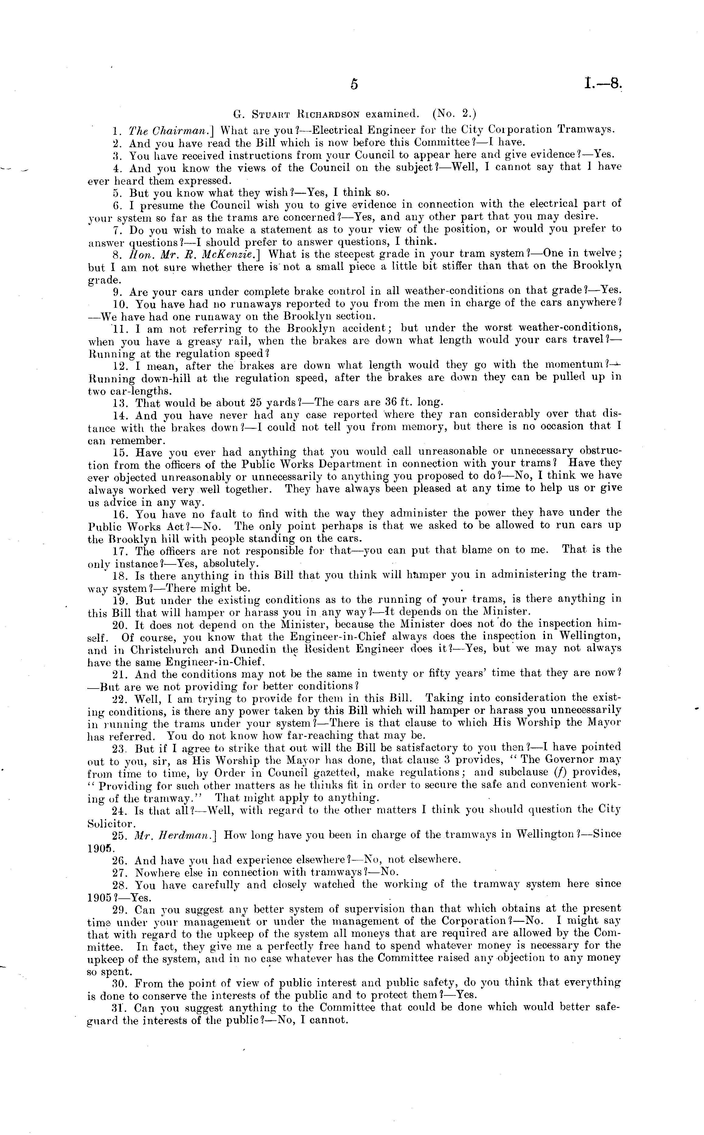 G. Stuart Richardson examined. (No. 2.) 1. The Chairman.] What are you? —Electrical Engineer for the City Corporation Tramways. 2. And you have read the Bill which is now before this Committee? 1 have. 3. You have received instructions from your Council to appear here and give evidence? —Yes. 4. And you know the views of the Council on the subject?— Well, I cannot say that I have ever heard them expressed. 5. But you know what they wish? —Yes, I think so. 6. I presume the Council wish you to give evidence in connection with the electrical part of your system so far as the trams are concerned? —Yes, and any other part that you may desire. 7. Do you wish to make a statement as to your view of the position, or would you prefer to answer questions? —I should prefer to answer questions, I think. 8. Hon. Mr. B. McKenzie.] What is the steepest grade in your tram system?— One in twelve; but I am not sure whether there is not a small piece a little bit stiffer than that on the Brooklyn grade. 9. Are your cars under complete brake control in all weather-conditions on that grade?— Yes. 10. You have had no runaways reported to you from the men in charge of the cars anywhere? —We have had one runaway on the Brooklyn section. 11. I am not referring to the Brooklyn accident; but under the worst weather-conditions, when you have a greasy rail, when the brakes are down what length would your cars travel? — Running at the regulation speed? 12. I mean, after the brakes are down what length would they go with the momentum 1 Running down-hill at the regulation speed, after the brakes are down they can be pulled up in 1 wo car-lengths. 13. That would be about 25 yards? —The cars are 36 ft. long. 14. And you have never had any case reported where they ran considerably over that distance with the brakes down? —I could* not tell you from memory, but there is no occasion that I can remember. 15. Have you ever had anything that you would call unreasonable or unnecessary obstruction from the officers of the Public Works Department in connection with your trams ? Have they ever objected unreasonably or unnecessarily to anything you proposed to do? —No, I think we have always worked very well together. They have always been pleased at any time to help us or give us advice in any way. 16. You have no fault to find with the way they administer the power they have under the Public Works Act?— No. The only point perhaps is that we asked to be allowed to run cars up the Brooklyn hill with people standing on the cars. 17. The officers are not responsible for that—you can put that blame on to me. That is the. only instance?— Yes, absolutely. 18. Is there anything in this Bill that you think will hamper you in administering the tramway system?— There might be. 19. But under the existing conditions as to the running of your trains, is there anything in this 15ill that will hamper or harass you in any way?—lt depends on the Minister. 20. It does not depend on the Minister, because the Minister does not do the inspection himself. Of course, you know that the Engineer-in-Chief always does the inspection in Wellington, and in Christchurch and Dunedin the Resident Engineer does it?— Yes, but we may not always have the same Engineer-in-Chief. 21. And the conditions may not be the same in twenty or fifty years' time that they are now? —But are we not providing for better conditions? 22. Well, lam trying to provide for them in this Bill. Taking into consideration the existing conditions, is there any power taken by this Bill which will hamper or harass you unnecessarily in running the trams under your system? —There is that clause to which His Worship the Mayor has referred. You do not know how far-reaching that may be. 23. But if I agree to strike that out will the Bill be satisfactory to you then?—l have pointed out to you, sir, as His Worship the Mayor has done, that clause •"> provides, " The Governor may from time to time, by Order in Council gazetted, make regulations; and subclause (/) provides, " Providing for such other matters as he thinks lit in order to secure the safe and convenient working of the tramway." That might apply to anything. 24. Is that all?— Well, with regard to the other matters 1 think you should question the City Solicitor. 25. Mr. Herdman.] How long have you been in charge of the tramways in Wellington?— Since 1905. 26. And have you had experience elsewhere? —No, not elsewhere. 27. Nowhere else in connection with tramways? —No. 28. You have carefully and closely watched the working of the tramway system here since 1905?— Yes. 29. Can you suggest any better system of supervision than that which obtains at the present time under your management or under the management of the Corporation?— No. I might say that with regard to the upkeep of the system all moneys that are required are allowed by the Committee. In fact, they give me a perfectly free hand to spend whatever money is necessary for the upkeep of the system, and in no case whatever has the Committee raised any objection to any money so spent. 30. From the point of view of public interest and public safety, do you think that everything is done to conserve the interests of the public and to protect them? —Yes. 31. Can you suggest anything to the Committee that could be done which would better safeguard the interests of the public?—No, I cannot.