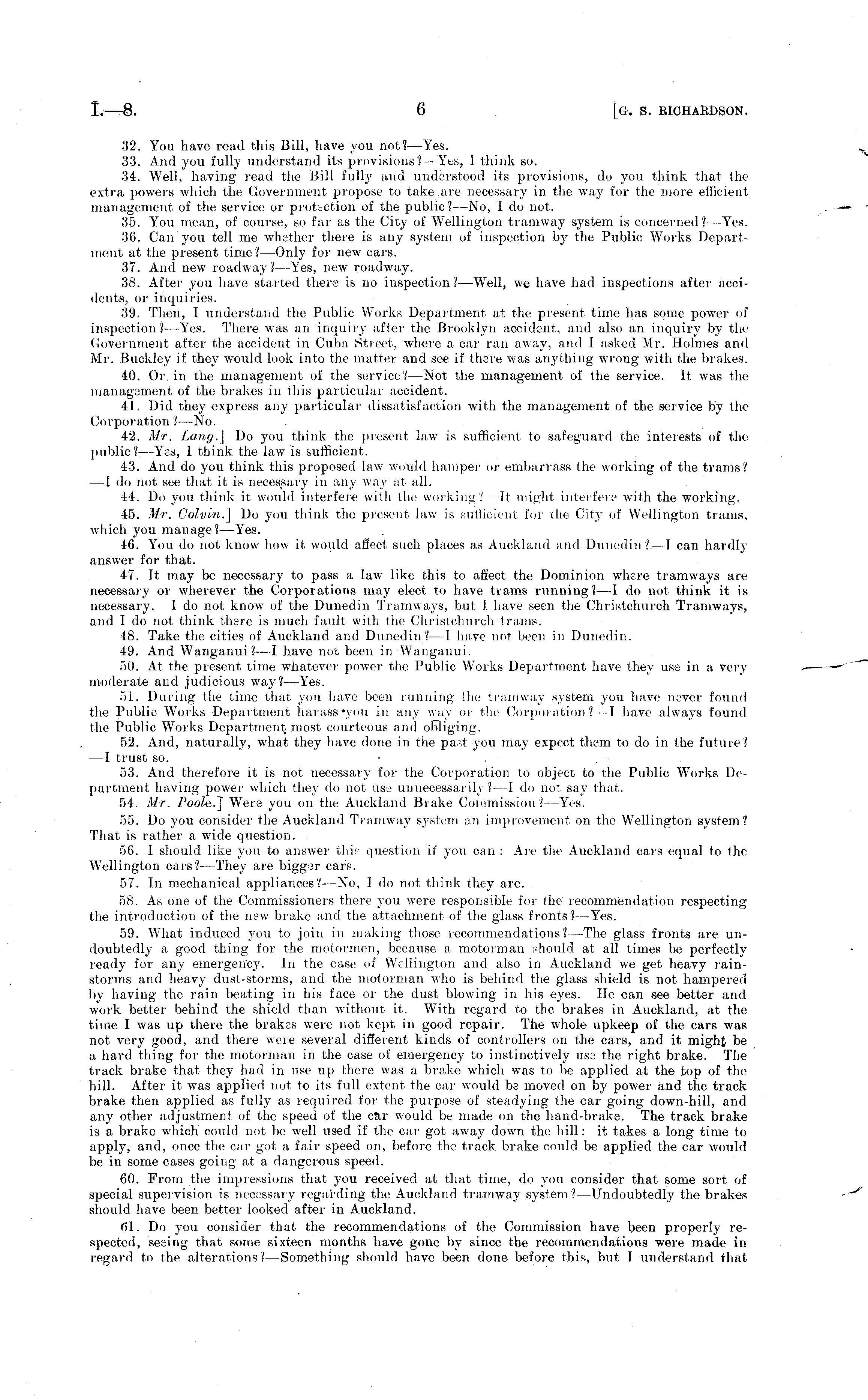 32. You have read this Bill, have you not? —Yes. 33. And you fully understand its provisions? —Kes, I think so. 34. Well, having read the Bill fully and understood its provisions, do you think that the extra powers which the Government propose to take are necessary in the way for the more efficient management of the service or protection of the public?—No, I do not. 35. You mean, of course, so far as the City of Wellington tramway system is concerned .' Yes. 36. Can you tell me whether there is any system of inspection by the Public Works Department at the present time? — Only for new ears. 37. Ami new roadway?— Yes, new roadway. 38. After you have started there is no inspection?— Well, we have had inspections after accidents, or inquiries. 39. Then, 1 understand the Public Works Department at the present time has some power of inspection?— Yes. There was an inquiry after the Brooklyn accident, and also an inquiry by the Government after the accident in Cuba Street, where a car ran away, and I asked Mr. Holmes ami Mr. Buokley if they would look into the matter and see if there was anything wrong with the brakes. H). Or in the management of the service? —Not the management of the service. It was the management of the brakes in this particular accident. 41. Did they express any particular dissatisfaction with the management of the service by the (lorporafcion ?—No. 42. Mr. Lang.] Do you think the present iaw is sufficient to safeguard the interests of the public?— Yes, I think the law is sufficient. 43. And do you think this proposed law would hamper or embarrass the working of the trams? - I do not see that it is necessary in any way at all. 11. Do you think it would interfere with the working? It might interfere with the working. 15. Mr. Colvin.] Do you think the present law is sufficient for the City of Wellington trams, which you manage?— Yes. Hi. You do not know how it would affect such places as Auckland and Dunedin ?—I can hardly answer for that. 47. It may be necessary to pass a law like this to affect the Dominion where tramways are necessary or wherever the Corporations may elect to have trams running/—I do not think it is accessary. Ido not know of the Dunedin Tramways, hut I have seen the Christchurch Tramways, and I do not think there is much fault with the Christchurch trams. -18. Take the cities of Auckland and Dunedin?- 1 have not been in Dunedin. lit. And Wanganui?—] have uot been in Wanganui. 50. At the present time whatever power the Public Works Department have they use in a ver\ moderate and judicious way?— Yes. 51. During the time that you have been running the tramwaj system you have never found the Public Works Department harass-you in any way or the Corpora! ion ?— I have always found the Public Works Department; most courteous and obliging. 52. .And, naturally, what they have done in the past yon ma\ expect them to do in the future? —I trust so. 53. And therefore it is not necessary for the Corporation to object to the Public Works De partment having power which they do not use unnecessarily?— I do nol say that. 51. .1//. Poole.] Were you on the Auckland Brake Commission ! ■■- Yes. 55. Do you consider the Auckland Tramway system an improvement on the Wellington system? Thai is rather a wide question. 56. I should like you to answer this question if yon can : Arc the Auckland cars equal to the Wellington cars?— They are bigger cars. 57. In mechanical appliances? No, Ido not think they are. 58. As one of the Commissioners there yon were responsible for the recommendation respecting the introduction of the new brake and the attachment of the glass fronts?— Yes. 59. What induced you to join in making those recommendations?-—The glass fronts are undoubtedly a good thing for the motormen, because a motorman should at all times be perfectly ready for any emergency. In the case of Wellington and also in Auckland w-e get heavy rainstorms and heavy dust-storms, and the motorman who is behind the glass shield is not hampered by having the rain beating in his face or the dust blowing in his eyes. lie can see better and work better behind the shield than without it. With regard to the brakes in Auckland, at the time I was up there the brakes were not kept in good repair. The whole upkeep of the cars was not very good, and there were several different kinds of controllers on the cars, and it might be a hard tiling for the motorman in the case of emergency to instinctively use the right brake. The track brake that they had in use up there was a brake which was to be applied at the top of the hill. After it was applied not to its full extent the car would be moved on by power and the track brake then applied as fully as required for the purpose of steadying the car going down-hill, and any other adjustment of the speed of the car would be made on the hand-brake. The track brake is a brake which could not be well used if the car got away down the hill: it lakes a long time to apply, and, once the car got a fair Speed on, before the track brake could be applied the car would be in some cases going at a dangerous speed. 60. From the impressions that you received at that time, do you consider that some sort, of special supervision is necessary regarding the Auckland tramway system? Undoubtedly the brakes should have been better looked after in Auckland. 61. Do you consider that the recommendations of the Commission have been properly respected, seeing that some sixteen months have gone by since the recommendations were made in regard to the alterations?— Something should have been done before this, but I understand that
