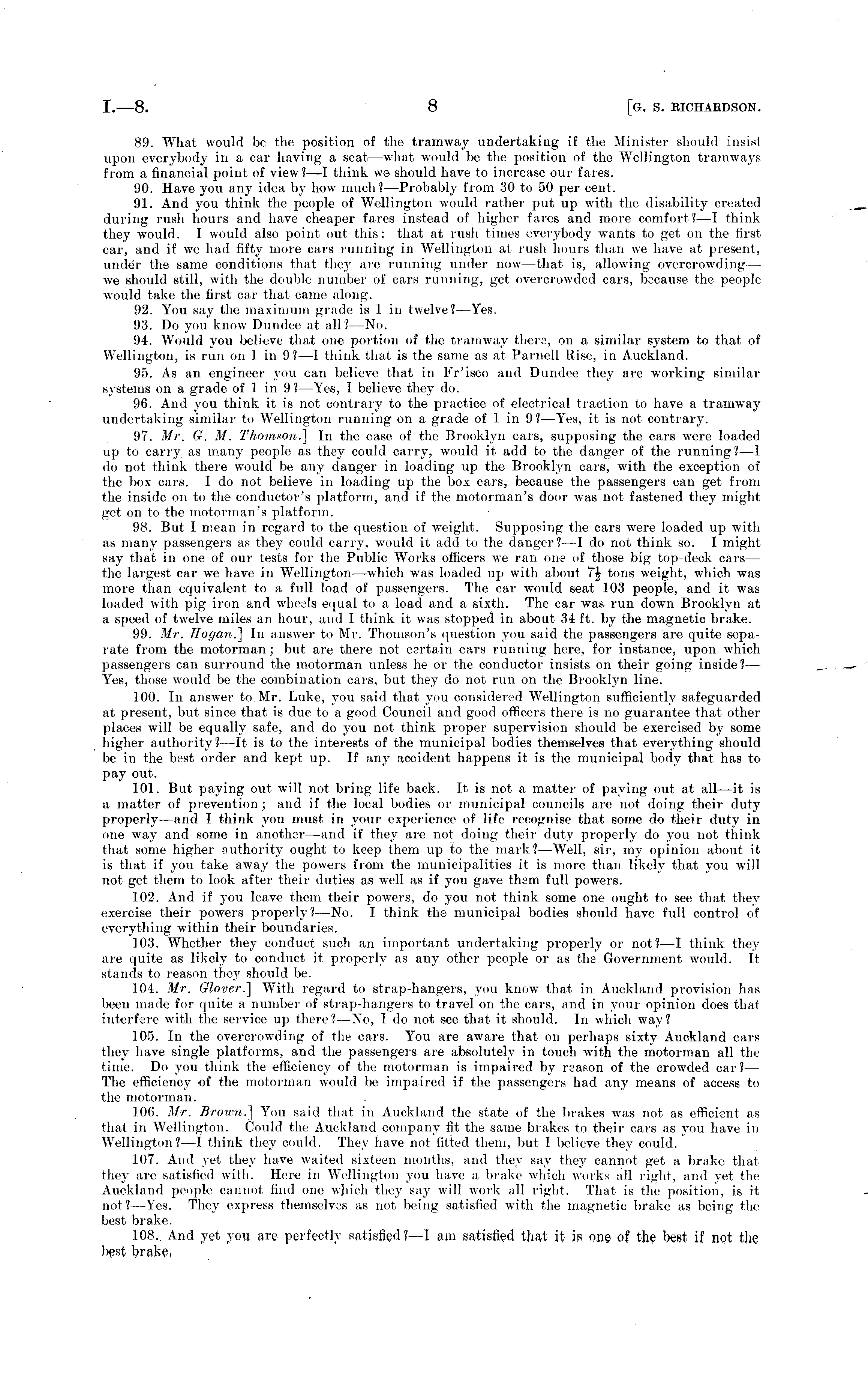 89. What would be the position of the tramway undertaking if the Minister should insist upon everybody in a car having a seat —what would be the position of the Wellington tramways from a financial point of view? —I think we should have to increase our fares. 90. Have you any idea by how much? —Probably from 30 to 50 per cent. 91. And you think the people of Wellington would rather put up with the disability created during rush hours and have cheaper fares instead of higher fares and more comfort?—l think they would. I would also point out this: that at rush times everybody wants to get on the first car, and if we had fifty more oars running in Wellington at rush hours than we have at present, under the same conditions that they are running under now that is, allowing overcrowding we should still, with the double number of cars running-, get overcrowded cars, because the people would take the first car that came along. 92. You say the maximum grade is 1 in twelve?— Yes. 93. Do you know Dundee at all? -No. 94. Would you believe that oik- portion of the tramway there, on a similar system to that of Wellington, is run on lin 9?— l think that is the same as at Parnell llise, in Auckland. 95. As an engineer you can believe that in Frisco and Dundee they are working similar systems on a grade of 1 in 9?— Yes, I believe they do. 96. And you think it is not contrary to the practice of electrical traction to have a tramway undertaking similar to Wellington running on a grade of 1 in 9?— Yes, it is not contrary. 97. Mr. G. M. Thomson.] In the case of the Brooklyn cars, supposing the cars were loaded up to carry as many people as they could carry, would it add to the danger of the running?—l do not think there would be any danger in loading up the Brooklyn cars, with the exception of the box cars. I do not believe in loading up the box cars, because the passengers can get from the inside on to the conductor's platform, and if the motorman's door was not fastened they might get on to the motorman's platform. 98. But I mean in regard to the question of weight. Supposing the cars were loaded up with as many passengers as they could carry, would it add to the danger?—l do not think so. I might say that in one of our tests for the Public Works officers we ran one of those big top-deck cars— the largest car we have in Wellington—which was loaded up with about T\ tons weight, which was more than equivalent to a full load of passengers. The car would seat 103 people, and it was loaded with pig iron and wheels equal to a load and a sixth. The oar was run down Brooklyn at a speed of twelve miles an hour, and I think it was stopped in about .'i4 ft. by the magnetic brake. 99. Mr. Hogan.] In answer to Mr. Thomson's question you said the passengers are quite sepa rate from the motorman; but are there not certain cars running here, for instance, upon which passengers can surround the motorman unless he or the conductor insists on their going inside?— Yes, those would be the combination cars, but they do not run on the Brooklyn line. 100. In answer to Mr. Luke, you said that you considered Wellington sufficiently safeguarded at present, but since that is due to a good Council and good officers there is no guarantee that other places will be equally safe, and do you not think proper supervision should be exercised by some higher authority?—lt is to the interests of the municipal bodies themselves that everything should be in the best order and kept up. If any accident happens it is the municipal body that has to pay out. 101. But paying out will not bring life back. It is not a matter of paying out at all —it is a matter of prevention ; and if the local bodies or municipal councils are not doing their duty properly—and I think you must in your experience of life recognise that some do their duty in one way and some in another —and if they are not doing their duty properly do you not think that some higher authority ought to keep them up to the mark? —Well, sir, my opinion about it is that if you take away the powers from the municipalities it is more than likely that you will not get them to look after their duties as well as if you gave them full powers. 102. And if you leave them their powers, do you not think some one ought to see that they exercise their powers properly? —No. I think the municipal bodies should have full control of everything within their boundaries. 103. Whether they conduct such an important undertaking properly or not?—l think they are quite as likely to conduct it properly as any other people or as the Government would. It stands to reason they should be. 104. Mr. Glover.] With regard to strait-hangers, you know that in Auckland provision has been made for quite a number of strap-hangers to travel on the cars, and in your opinion does that interfere with the service up there?—No, Ido not see that it should. In which way? 105. In the overcrowding of the cars. You are aware that on perhaps sixty Auckland cars they have single platforms, and the passengers are absolutely in touch with the motorman all the time. Do you think the efficiency of the motorman is impaired by reason of the crowded car?— The efficiency of the motorman would be impaired if the passengers had any means of access to the motorman. 106. Mr. Brown.] You said that in Auckland the state of the brakes was not as efficient as that in Wellington. Could the Auckland company fit the same brakes to their cars as yon have in Wellington?—l think they could. They have not fitted them, but I believe they could. 107. And vet they have waited sixteen months, and they say they cannot get a brake that they are satisfied with. Here in Wellington you have a brake which works all right, and vet the Auckland people cannot find one which they say will work all right. That is the position, is it not ?—Yes. They express themselves as not being satisfied with the magnetic brake as being the best bra