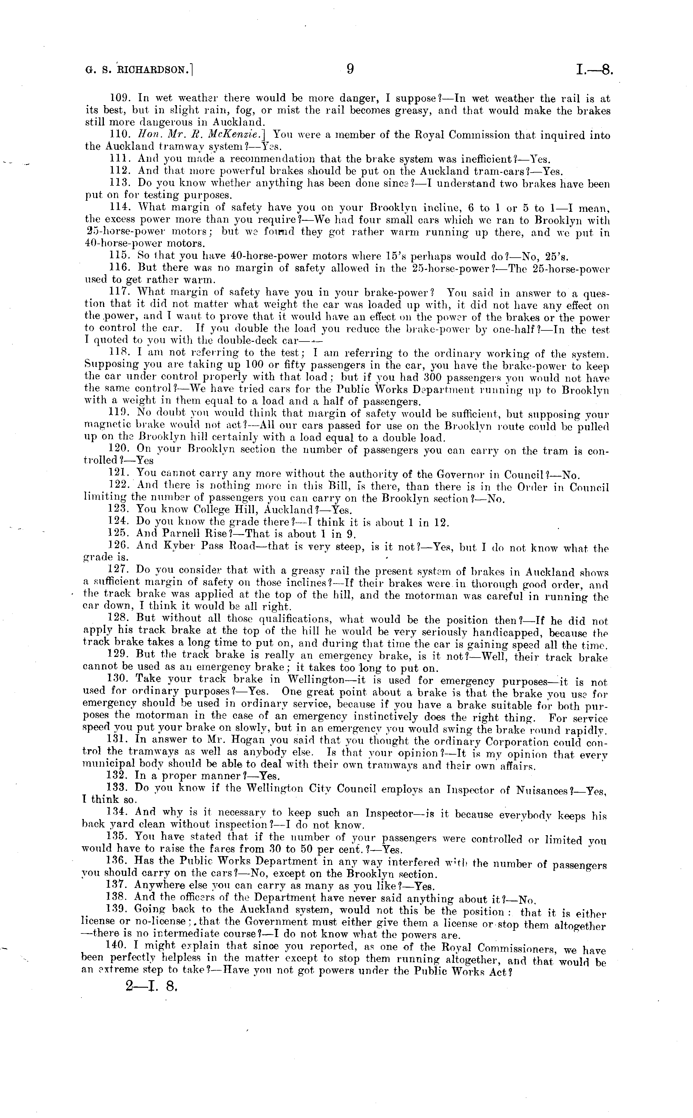 109. In wet weather there would be more danger, I suppose?—ln wet weather the rail is at its best, but in slight rain, fog, or mist the rail becomes greasy, and that would make the brakes still more dangerous in Auckland. 110. Hon. Mr. B. McKenzie.] You were a member of the Royal Commission that inquired into the Auckland tramway system?— Yes. 111. And you made a recommendation that the brake system was inefficient?— Yes. 112. And that more powerful brakes should be put on the Auckland tram-cars?— Yes. 113. Do you know whether anything has been done since?—l understand two brakes have been put on for testing purposes. 114. What margin of safety have you on your Brooklyn incline, 6 to 1 or 5 to I—l mean, the excess power more than you require?—We had four small cars which we ran to Brooklyn with 25-horse-powor motors; but we fomid they got rather warm running up there, and wo put in 40-horse-power motors. 115. So that you have 40-horse-power motors where 15's perhaps would do?—No, 25's. 116. But there was no margin of safety allowed in the 25-horse-power?—The 25-horse-powcr used to get rather warm. 117. What margin of safety have you in your brake-power? You said in answer to a question that it did not matter what weight the car was loaded up with, it did not have any effect on the .power, and I want to prove that it would have an effect on the power of the brakes or the power to control the car. If you double the load you reduce the brake-power by one-half?—ln the test I quoted to you with the double-deck car —— 118. I am not referring to the test; 1 am referring to the ordinary working of the system. Supposing you are taking up 100 or fifty passengers in the car, you have the brake-power to keep the car under control properly with that load ; but if you had 300 passengers you would not have the same control? —We have tried cars for the Public Works Department running up to Brooklyn with a. weight in them equal to a load and a half of passengers. 119. No doubt you would think that margin of safety would be sufficient, but supposing your magnetic brake would not act?— All our cars passed for use on the Brooklyn route could be pulled up on the Brooklyn hill certainly with a load equal to a double load. 120. On your Brooklyn section the number of passengers you can carry on the tram is controlled?— Yes 121. You cannot carry any more without the authority of the Governor in Council?— No. _ 122. And there is nothing more in this Bill, is there, than there is in the Order in Council limiting the number of passengers you can carry on the Brooklyn section? -No 123. You know College Hill, Auckland?— Yes. 124. Do you know the grade there I —l think it is about lin 12. 125. Ami Parnell Rise?— That is about 1 in 9. 126. And Kyber Pass Road -that is very steep, is it not?— Yes, but T do not know what the grade is. 127. Do you consider that with a greasy rail the present system of brakes in Auckland shows a sufficient margin of safety on those inclines?—lf their brakes wore in thorough good order, and the track brake was applied at the top of the hill, and the motorman was careful in running the car down, I think it would be all right. 128 ; But without all those qualifications, what would be the position then?—lf he did not apply his track brake at the top of the hill he would be very seriously handicapped, because the track brake takes a long time to put on, and during that time'the car is gaining speed all the time. 129. But the track brake is really an emergency brake, is it not?— Well, their track brake cannot be used as an emergency brake ; it takes too long to put on. 130. Take your track brake in Wellington—it is used for emergency purposes—it is not used for ordinary purposes?— Yes. One great point about a brake is that the brake you use for emergency should be used in ordinary service, because if you have a brake suitable for both purposes the motorman in the case of an emergency instinctively does the right thing. For service speed you put your brake on slowly, but in an emergency you would swing the brake round rapidly. 131. In answer to Mr. Hogan you said that you thought the ordinary Corporation could control the tramways as well as anybody else. Is that your opinion?—lt is niv opinion that every municipal body should be able to deal with their own tramways and their own affairs. 132. In a proper manner?— Yes. 133. Do you know if the Wellington City Council employs an Inspector of Nuisances? Yes, I think so. 134. And why is it necessary to keep such an Inspector—is it because everybody keeps his back- yard clean without inspection?—T do not know. 135. You have stated that if the number of your passengers were controlled or limited you would have to raise the fares from 30 to 50 per cent.?— Yes. 136. Has the Public Works Department in any way interfered w ; th the number of passengers you should carry on the cars?—No, except on the Brooklyn section. 137. Anywhere else you can carry as many as you like?— Yes. 138. And the officers of the Department have never said anything about it? No. 139. Going back to the Auckland system, would not this be the position : that it is either license or no-license : .that the Government must cither give them a license or stop them altogether —there is no intermediate course? —I do not know what the powers are. 140. I might explain that since you reported, as one of the Royal Commissioners, we have been perfectly helpless in the matter except to stop them running altogether, and that'would be an extreme step to take?— Have you not got powers under the Public Works Act? 2—l. 8.