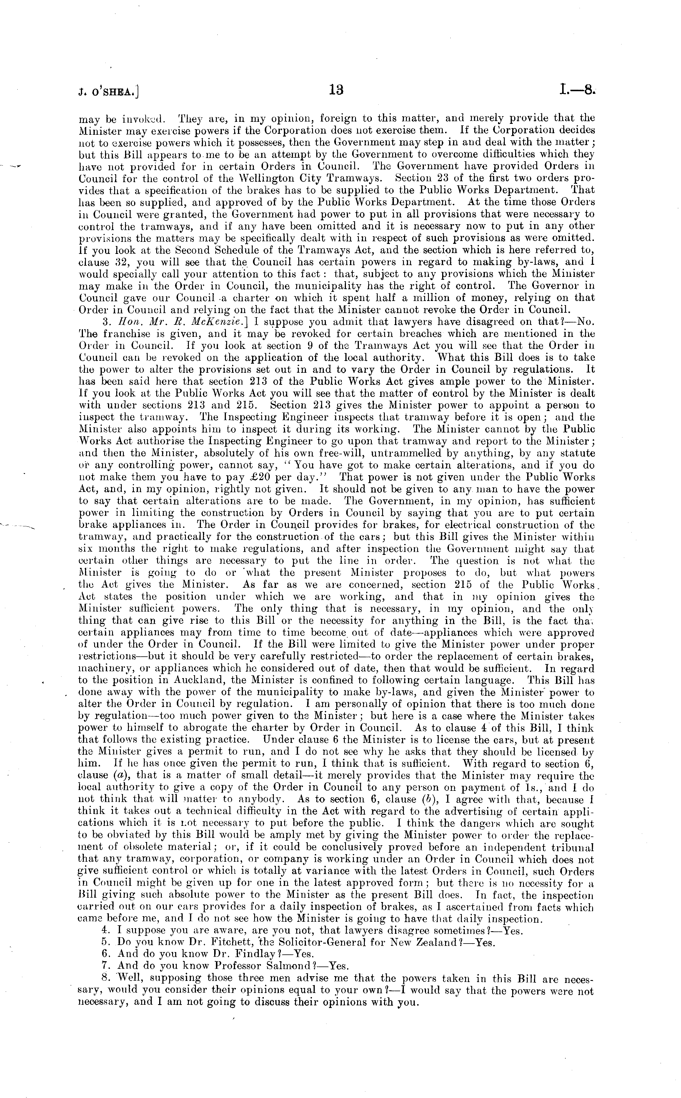 may be invoked. They are, in my opinion, foreign to this matter, and merely provide that the Minister may exercise powers if the Corporation does not exercise them. If the Corporation decides not to exercise powers which it possesses, then the Government may step in and deal with the matter; but this Bill appears to me to be an attempt by the Government to overcome difficulties which they have not provided for in certain Orders in Council. The Government have provided Orders in Council for the control of the Wellington City Tramways. Section 23 of the first two orders provides that a specification of the brakes has to be supplied to the Public Works Department. That has been so supplied, and approved of by the Public Works Department. At the time those Orders in Council were granted, the Government had power to put in all provisions that were necessary to control the tramways, and if any have been omitted and it is necessary now to put in any other provisions the matters may be specifically dealt with in respect of such provisions as were omitted. If you look at the Second Schedule of the Tramways Act, and the section wdiich is here referred to, clause 32, you will see that the Council has certain powers in regard to making by-laws, and 1 would specially call your attention to this fact : that, subject to any provisions which the Minister may make in the Order in Council, the municipality has the right of control. The Governor in Council gave our Council a charter on which it spent half a million of money, relying on that Order in Council and relying on the fact that the Minister cannot revoke the Order in Council. 3. Hon. Mr. B. McKenzie.] I suppose you admit that lawyers have disagreed on that? —No. The franchise is given, and it may be revoked for certain breaches which are mentioned in the Order in Council. If you look at section 9of the Tramways Act you will see that the Order in Council can be revoked on the application of the local authority. What this Bill does is to take the power to alter the provisions set out in and to vary the Order in Council by regulations. It has been said here that section 213 of the Public Works Act gives ample power to the Minister. If you look at the Public Works Act you will see that the matter of control by the Minister is dealt with under sections 213 and 215. Section 213 gives the Minister power to appoint a person to inspect the tramway. The Inspecting Engineer inspects that tramway before it is open; and the Minister also appoints him to inspect it during its working. The Minister cannot by the Public Works Act authorise the Inspecting Engineer to go upon that tramway and report to the Minister; and then the Minister, absolutely of his own free-will, untrammelled by anything, by any statute or any controlling power, cannot say, " You have got to make certain alterations, and if you do not make them you have to pay £20 per day." That power is not given under the Public Works Act, and, in my opinion, rightly not given. It should not be given to any man to have the power to say that certain alterations are to be made. The Government, in my opinion, has sufficient power in limiting the construction by Orders in Council by saying that you are to put certain brake appliances in. The Order in Council provides for brakes, for electrical construction of the tramway, and practically for the construction of the cars; but this Bill gives the Minister within six months the right to make regulations, and after inspection the Government might say that certain other things are necessary to put the line in order. The question is not what the Minister is going to do or 'what the present Minister proposes to do, but what powers the Act gives the Minister. As far as we are concerned, section 215 of the Public Works Act states the position under which we are working, and that in my opinion gives the Minister sufficient powers. The only thing that is necessary, in my opinion, and the only thing that can give rise to this Bill or the necessity for anything in the Bill, is the fact tha, certain appliances may from time to time become out of date —appliances which were approved of under the Order in Council. If the Bill were limited to give the Minister power under proper restrictions —but it should be very carefully restricted —to order the replacement of certain brakes, machinery, or appliances which lie considered out of date, then that would be sufficient. In regard to the position in Auckland, the Minister is confined to following certain language. This Bill has done away with the power of the municipality to make by-laws, and given the Minister' power to alter the Order in Council by regulation. lam personally of opinion that there is too much done by regulation—too much power given to the Minister; but here is a case where the Minister takes power to himself to abrogate the charter by Order in Council. As to clause 4of this Bill, 1 think that follows the existing practice. Under clause 6 the Minister is to license the cars, but at present the Minister gives a permit to run, and I do not see why he asks that they should be licensed by him. If he has once given the permit to run, I think that is sufficient. With regard to section 6, clause (a), that is a matter of small detail—it merely provides that the Minister may require the local authority to give a copy of the Order in Council to any person on payment of Is., and I do not think that will matter to anybody. As to section 6, clause (b), I agree with that, because I think it takes out a technical difficulty in the Act with regard to the advertising of certain applications which it is i.ot necessary to put before the public. I think the dangers which arc sought to be obviated by this Bill would be amply met by giving the Minister power to order the replace ment of obsolete material; or, if it could be conclusively proved before an independent tribunal that any tramway, corporation, or company is work