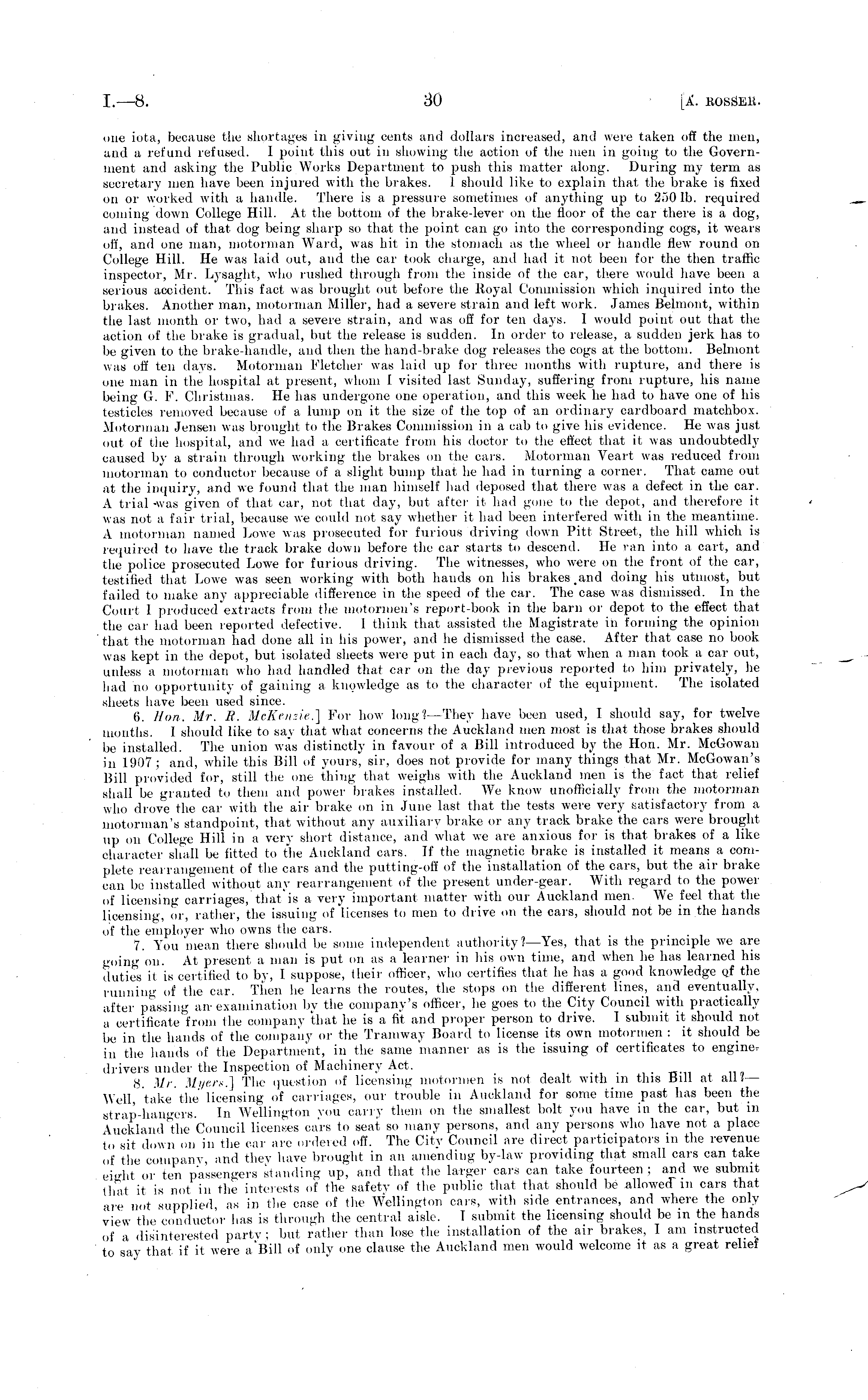 one iota, because the shortages in giving cents and dollars increased, and were taken off the men, and a refund refused. 1 point this out in showing the action of the men in going to the Government and asking the Public Works Department to push this matter along. During my term as secretary men have been injured with the brakes. 1 should like to explain that the brake is fixed on or worked with a handle. There is a pressure sometimes of anything up to 250 Ib. required coming down College Hill. At the bottom of the brake-lever on the floor of the car there is a dog, and instead of that dog being sharp so that the point can go into the corresponding , cogs, it wears off, and one man, motorman Ward, was hit in the stomach as the wheel or handle flew round on College Hill. He was laid out, and the car took charge, and had it not been for the then traffic inspector, Mr. Lysaght, who rushed through from the inside of the car, there would have been a serious accident. This fact was brought out before the Royal Commission which inquired into the brakes. Another man, motorman Miller, had a severe strain and left work. James Belmont, within the last month or two, had a severe strain, and was off for ten days. 1 would point out that the action of the brake is gradual, but the release is sudden. In order to release, a sudden jerk has to be given to the brake-handle, and then the hand-brake dog releases the cogs at the bottom. Belmont was off ten days. Motorman Fletcher was laid up for three months with rupture, and there is one man in the hospital at present, whom I visited last Sunday, suffering from rupture, his name being G. F. Christmas. He has undergone one operation, and this week he had to have one of his testicles removed because of a lump on it the size of the top of an ordinary cardboard matchbox. Motorman Jensen was brought to the Brakes Commission in a cab to give his evidence. lie was just out of the hospital, and we had a certificate from his doctor to the effect that it was undoubtedly caused by a strain through working the brakes on the cars. Motorman Veart was reduced from motorman to conductor because of a slight bump that he had in turning a corner. That came out at the inquiry, and we found that the man himself had deposed that there was a defect in the car. A trial-was given of that car, not that day, but after it had gone to the depot, and therefore it was not a fair trial, because we could not say whether it had been interfered with in the meantime. A motorman named Lowe was prosecuted for furious driving down Pitt Street, the hill which is required to have the track brake down before the car starts to descend. He ran into a cart, and the police prosecuted Lowe for furious driving. The witnesses, who were on the front of the car, testified that Lowe was seen working with both hands on his brakes,and doing his utmost, but failed to make any appreciable difference in the speed of the car. The case was dismissed. In the Court I produced extracts from the motormen's report-book in the barn or depot to the effect that the car had been reported defective. 1 think that assisted the Magistrate in forming the opinion that the motorman had done all in his power, and he dismissed the case. After that case no book was kept in the depot, but isolated sheets were put in each day, so that when a man took a car out, unless a motorman who had handled that car on the day previous reported to him privately, he had no opportunity of gaining a knowledge as to the character of the equipment. The isolated sheets have been used since. G. Eon. Mr. li. McKenzie.] For how long?— They have been used, I should say, for twelve months. I should like to say that what concerns the Auckland men most is that those brakes should be installed. The union was distinctly in favour of a Bill introduced by the Hon. Mr. MeGowau in 1 i>o7 ; and, while this Bill of yours, sir, does not provide for many things that Mr. McGowan's Bill provided for, still the oik thing that weighs with the Auckland men is the fact that relief shall be granted to them and power brakes installed. We know unofficially from the motorman who drove the car with the air brake on in June last that the tests were very satisfactory from a motorman's standpoint, that without any auxiliary brake or any track brake the cars were brought up on College Hill in a very short distance, and what we are anxious for is that brakes of a like character shall be fitted to the Auckland cars. If the magnetic brake is installed it means a complete rearrangement of the cars and the putting-off of the installation of the cars, but the air brake can be installed without any rearrangement of the present under-gear. With regard to the power of licensing carriages, that is a very important matter with our Auckland men. We feel that the licensing, or, rather, the issuing of'licenses to men to drive on the cars, should not be in the hands of the employer who owns the cars. 7. You mean there should be some independent authority ?—Yes, that is the principle we are going on. At present a man is put on as a learner in his own time, and when he has learned his duties it is certified to by, 1 suppose, their officer, who certifies that he lias a good knowledge of the running of the car. Then he learns the routes, the stops on the different lines, and eventually, after passing an examination by the company's officer, he goes to the City Council with practically a certificate from the company that he is a fit and proper person to drive. I submit it should not be in the hands of the company or the Tramway Board to license its own motormen : it should be in the hands of the Department, in the same manner as is the issuing of certificates to engine, drivers under the Inspection of Machinery Act. _ _ 8 Mr. Myers.'] The question of licensing motormen is not dealt with in this Bill at all/ — Well, take the licensing of carriages, our trouble in Auckland for some time past has been th
