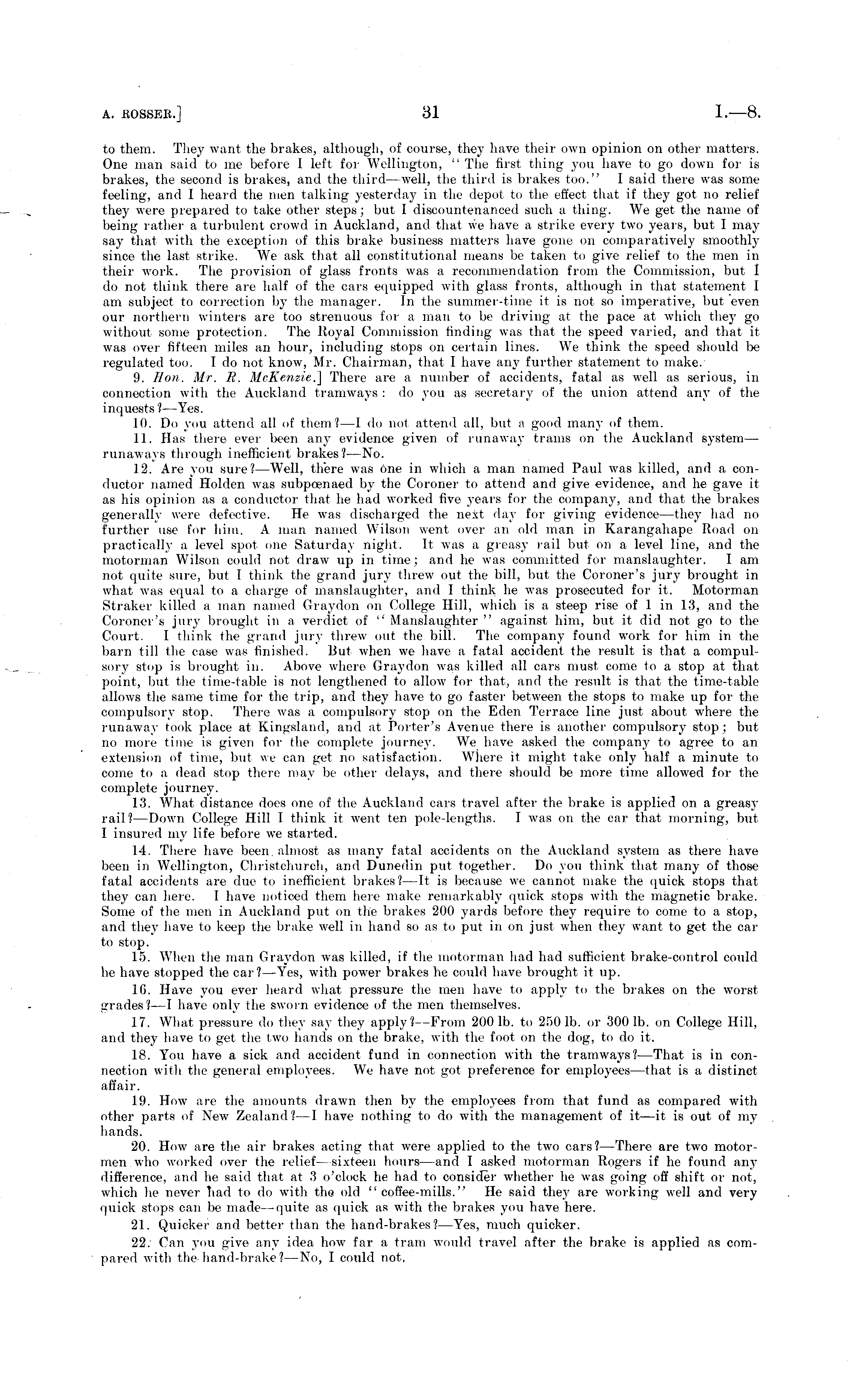 to them. They want the brakes, although, of course, they have their own opinion on other matters. One man said to me before I left for Wellington, " The first thing you have to go down for is brakes, the second is brakes, and the third-well, the third is brakes too." I said there was some feeling, and I heard the men talking yesterday in the depot to the effect that if they got no relief they were prepared to take other steps; but 1 discountenanced such a thing. We get the name of being rather a turbulent crowd in Auckland, and that we have a strike every two years, but I may say that with the exception of this brake business matters have gone on comparatively smoothly since the last strike. We ask that all constitutional means be taken to give relief to the men in their work. The provision of glass fronts was a recommendation from the Commission, but I do not think there are half of the cars equipped with glass fronts, although in that statement I am subject to correction by the manager. In the summer-time it is not so imperative, but even our northern winters are too strenuous for a man to be driving at the pace at which they go without some protection. The Royal Commission finding was that the speed varied, and that it was over fifteen miles an hour, including stops on certain lines. We think the speed should be regulated too. Ido not know, Mr. Chairman, that I have any further statement to make. 9. Hon. Mr. B. McKenzie.] There are a number of accidents, fatal as well as serious, in connection with the Auckland tramways : do you as secretary of the union attend any of the inquests? —Yes. 10. Do you attend all of them?—l do not attend all, but a good many of them. 11. Has there ever lx>en any evidence given of runaway trams on the Auckland system — runaways through inefficient brakes?— No. 12. Are you sure?—W T ell, there was one in which a man named Paul was killed, and a conductor named Holden was subpoenaed by the Coroner to attend and give evidence, and he gave it as his opinion as a conductor that he had worked five years for the company, and that the brakes generally were defective. He was discharged the next day for giving evidence —they had no further use for him. A man named Wilson went over an old man in Karangahape Road on practically a level spot one Saturday night. It was a greasy rail but on a level line, and the motorman Wilson could not draw up in time ; and he was committed for manslaughter. lam not quite sure, but I think the grand jury threw out the bill, but the Coroner's jury brought in what was equal to a charge of manslaughter, and I think he was prosecuted for it. Motorman Straker killed a man named Graydon on College Hill, which is a steep rise of 1 in 13, and the Coroner's jury brought in a verdict of "Manslaughter" against him, but it did not go to the Court. I think the grand jury threw out the bill. The company found work for him in the barn till the case was finished. But when we have a fatal accident the result is that a compulsory stop is brought in. Above where Graydon was killed all cars must come to a stop at that point, but the time-table is not lengthened to allow for that, and the result is that the time-table allows the same time for the trip, and they have to go faster between the stops to make up for the compulsory stop. There was a compulsory stop on the Eden Terrace line just about where the runaway took place at Kingsland, and at Porter's Avenue there is another compulsory stop; but no more time is given for the complete journey. We have asked the company to agree to an extension of time, but we can get no satisfaction. Where it might take only half a minute to come to a dead stop there may be other delays, and there should lie more time allowed for the complete journey. 13. What distance does one of the Auckland cars travel after the brake is applied on a greasy rail?— Down College Hill I think it went ten pole-lengths. I was on the car that morning, but I insured my life before we started. 14. There have been, almost as many fatal accidents on the Auckland system as there have been in Wellington, Christchurch, and Dunedin put together. Do you think that many of those fatal accidents are due to inefficient brakes?—lt is because we cannot make the quick stops that they can here. I have noticed them here make remarkably quick stops with the magnetic brake. Some of the men in Auckland put on the brakes 200 yards before they require to come to a stop, and they have to keep the brake well in hand so as to put in on just when they want to get the car to stop. 15. When the man Graydon was killed, if the motorman had had sufficient brake-control could he have stopped the car?— Yes, with power brakes he could have brought it up. 10. Have you ever heard what pressure the men have to apply to the brakes on the worst grades?—l have only the sworn evidence of the men themselves. 17. What pressure do they say they apply?— From 2001b. to 250 Ib. or 300 Ib. on College Hill, and they have to get the two hands on the brake, with the foot on the dog, to do it. 18. You have a sick and accident fund in connection with the tramways?— That is in connection with the general employees. We have not got preference for employees—that is a distinct affair. 19. How are the amounts drawn then by the employees from that fund as compared with other parts of New Zealand? —I have nothing to do with the management of it—it is out of my hands. 20. How are the air brakes acting that were applied to the two cars?— There are two motormen who worked over the relief—sixteen hours—and I asked motorman Rogers if he found any difference, and he said that at 3 o'clock he had to consiifor whether he was going off shift or not, which he never had to do with the old "coffee-mills." He said they are working well and very quick stops can be made—quite as quick as with the brakes you have here. 21. Quicker and better than the hand-brakes? —Yes, much qui