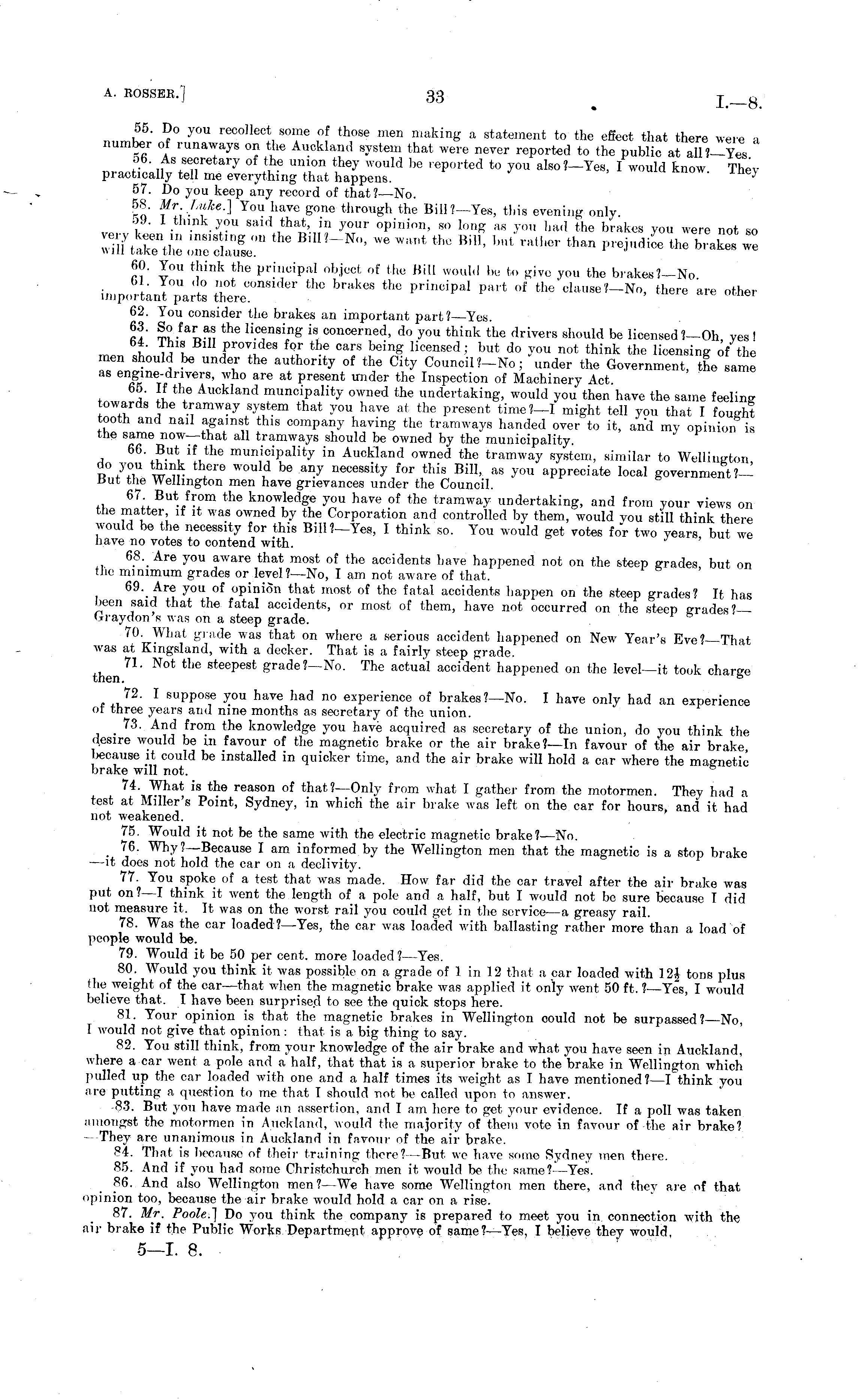 JS6. Do you recollect some of those men making a statement to the effect that there were a number of runaways on the Auckland system that were never reported to the public at all?-Yes 56. As secretary of the union they would be reported to you also?— Yes, I would know They practically tell me everything that happens. } 57. Do you keep any record of that?— No. 58. Mr Luke.] You have gone through the Rill? Yes, this evening only -..). I think you said that in your opinion, so long as you had the brakes you were not so t,,c B,Uf Ni " we n:,ui the Bm ''"' , rather than ™» d ™ - 60. You think the principal object of the Bill would be to give you the brakes?-No W " tI,C bFakeS <hC " m " ;lM Part " f ° laUBe? N °' *-c ar, other 62. Y r ou consider the brakes an important part?— Yes. 63. So far as the licensing is concerned, do you think the drivers should be licensed ?-Oh yes ! t' ill P rOTI ,« IeB for th * cars being licensed; but do you not think the licensing of the men should be under the authority of the City Council ?-No; under the Government, the same as engine-drivers, who are at present under the Inspection of Machinery Act 65. If the Auckland muncipality owned the undertaking, would you then have the same feeling towards the tramway system that you have at the present time?—l might tell you that I fought tooth and nail against this company having the tramways handed over to it, and my opinion is the same now—that all tramways should be owned by the municipality. 66. But if the municipality in Auckland owned the tramway system, similar to Wellington '.'"AT wn- 161I 61 ' 6 W ° Ul , d b6 any necessit y for th ™ Bill, as you appreciate local government ?-' Hut the Wellington men have grievances under the Council. 67 But from the knowledge you have of the tramway undertaking, and from your views on the matter, if it was owned by the Corporation and controlled by them, would you still think there would be the necessity for this Bill?— Yes, I think so. You would get votes for two years but we have no votes to contend with. 68. Are you aware that most of the accidents have happened not on the steep grades but on Hie minimum grades or level?—No, lam not aware of that. 69. Are you of opinion that most of the fatal accidents happen on the steep grades? It has been said that the fatal accidents, or most of them, have not occurred on the steep grades?— Graydon s was on a steep grade. 70. What, grade was that on where a serious accident happened on New Year's Eve?— That was at Kmgsland, with a decker. That is a fairly steep grade. 71. Not the steepest grade?— No. The actual accident, happened on the level—it took charge then. b 72. I suppose you have had no experience of brakes?— No. I have only had an experience of three years and nine months as secretary of the union. _ 73. And from the knowledge you have acquired as secretary of the union, do you think the desire would be m favour of the magnetic brake or the air brake?—ln favour of the air brake l>ecause it could be installed in quicker time, and the air brake will hold a car where the magnetic brake will not. 74. What is the reason of that?— Only from what I gather from the motormen. They had a (est at Miller's Point, Sydney, in which the air brake was left on the car for hours, and it had not weakened. 75. Would it not be the same with the electric magnetic brake? —No. _ 76. Why?— Because I am informed by the Wellington men that the magnetic is a stop brake —it does not hold the car on a declivity. 77. You spoke of a test that was made. How far did the car travel after the air brake was put on?—I think it went the length of a pole and a half, but I would not be sure because T did not measure it. Tt was on the worst rail you could get in the service—a greasy rail. 78. Was the car loaded?— Yes, the car was loaded with ballasting rather more than a load of people would be. 79. Would it be 50 per cent, more loaded ?—Yes. 80. Would you think it was possible on a grade of 1 in 12 that a car loaded with 12J tons plus the weight of the car—that when the magnetic brake was applied it only went 50 ft. ?—Yes, I would believe that. I have been surprised to see the quick stops here. 81. Your opinion is that the magnetic brakes in Wellington could not be surpassed?—No, I would not give that opinion : that is a big thing to say. 82. You still think, from your knowledge of the air brake and what you have seen in Auckland, where a car went a pole and a half, that that is a superior brake to the brake in Wellington which pulled up the car loaded with one and a half times its weight as I have mentioned?—l think you are putting a question to me that T should not be called upon to answer. 83. But you have made an assertion, and T am here to get your evidence. Tf a poll was taken amongst the motormen in Auckland, would the majority of them vote in favour of the air brake? - They are unanimous in Auckland in favour of the air brake 84. That is because of their training there?— But we have some Sydney men there. 85. And if you had some Christchurch men it would be the same?— Yes. 86. And also Wellington men?—We have some Wellington men there, and they are of that opinion too, because the air brake would hold a car on a rise. 87. Mr. Poole.] Do you think the company is prepared to meet you in connection with the air brake if the Public Works Department approve of same?— Yes, I believe they would. s—l. 8.