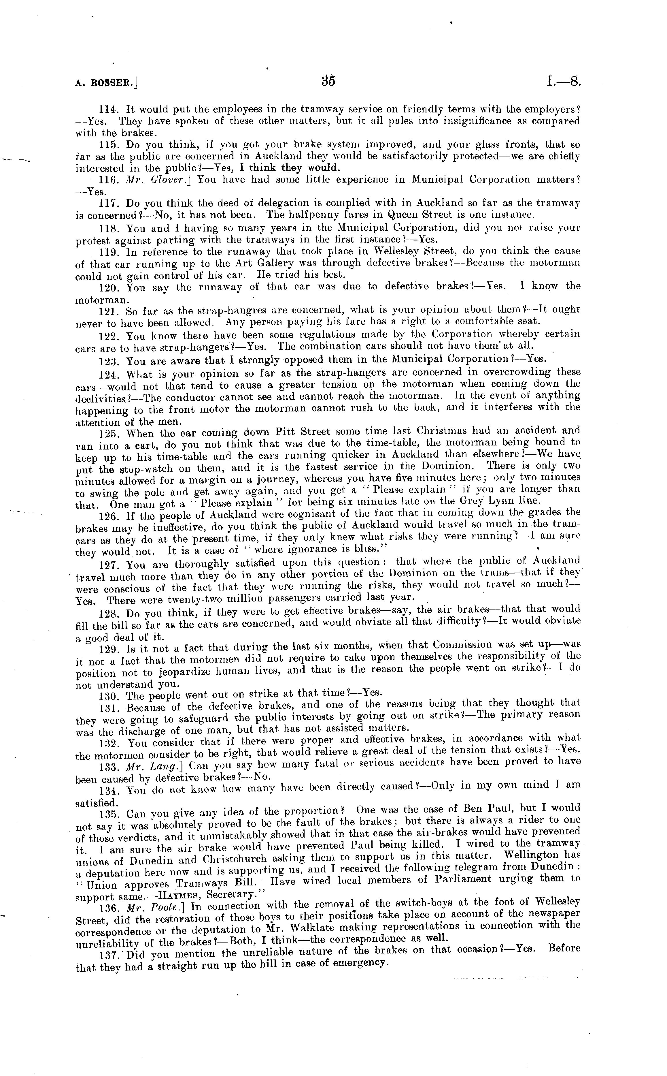 114. It would put the employees in the tramway service on friendly terms with the employers? —Yes. They have spoken of these other matters, but it all pales into insignificance as compared with the brakes. 115. Do you think, if you got, your brake system improved, and your glass fronts, that so far as the public are concerned in Auckland they would be satisfactorily protected—we are chiefly interested in the public?— Yes, I think they would. 116. Mr. Glover.] You have had some little experience in Municipal Corporation matters? —Yes. 117. Do you think the deed of delegation is complied with in Auckland so far as the tramway is concerned? —No, it has not been. The halfpenny fares in Queen Street is one instance. 118. You and I having so many years in the Municipal Corporation, did you not raise your protest against parting with the tramways in the first instance? —Yes. 119. In reference to the runaway that took place in Wellesley Street, do you think the cause of that car running up to the Art Gallery was through defective brakes? —Because the motorman could not gain control of his car. He tried his best. 120. You say the runaway of that car was due to defective brakes?— Yes. I know the motorman. 121. So far as the strap-hangres are concerned, what is your opinion about them? —It ought never to have been allowed. Any person paying his fare has a right to a comfortable seat. 122. You know there have been some regulations made by the Corporation whereby certain cars are to have strap-hangers? —Yes. The combination cars should not have thein'at all. 123. You are aware that I strongly opposed them in the Municipal Corporation?— Yes. 124. What is your opinion so far as the strap-hangers are concerned in overcrowding these cars would not that tend to cause a greater tension on the motorman when coming down the declivities? The conductor cannot see and cannot reach the motorman. In the event of anything happening to the front motor the motorman cannot rush to the back, and it interferes with the attention of the men. 125. When the car coming down Pitt Street some time last Christmas had an accident and ran into a cart, do you not think that was due to the time-table, the motorman being bound to keep up to his time-table and the cars running quicker in Auckland than elsewhere ?—We have put the stop-watch on them, and it is the fastest service in the Dominion. There is only two minutes allowed for a margin on a journey, whereas you have five minutes here; only two minutes to swing the pole and get away again, and you get a " Please explain " if you are longer than that. One man got a " Please explain " for being six minutes late on the Grey Lynn line. 126. If the people of Auckland were cognisant of the fact that in coming down the grades the brakes may be ineffective, do you think the public of Auckland would travel so much in the tramoars as they do at the present time, if they only knew risks they were running"?—l am sure they would not. It is a case of " where ignorance is bliss." 127. You are thoroughly satisfied upon this question: that where the public of Auckland travel much more than they do in any other portion of the Dominion on the trams -that if they were conscious of the fact that they were running the risks, they would not travel so much?— Yes. There were twenty-two million passengers carried last year. 128 Do you think, if they were to get effective brakes—say, the air brakes—that that would fill the bill so far as the cars are concerned, and would obviate all that difficulty?—lt would obviate a good deal of it. ~,,,-• 129 Is it not a fact that during the last six months, when that Commission was set up—was it not a fact that the motormen did not require to take upon themselves the responsibility of the position not to jeopardize human lives, and that is the reason the people went on strike?—l do not understand you. 130 The people went out on strike at that time! —Yes. 131 Because of the defective brakes, and one of the reasons being that they thought that they were going to safeguard the public interests by going out on strike?— The primary reason was the discharge of one man, but that has not assisted matters. 132 You consider that if there were proper and effective brakes, in accordance with what the motormen consider to be right, that would relieve a great deal of the tension that exists?— Yes. 133. Mr. Lang] Can you say how many fatal or serious accidents have been proved to have been caused by defective brakes?— No. , 134. You" do not know how many have lieen directly caused?— Only in my own mind I am satisfied. rf proportion?— One was the case of Ben Paul, but I would not say 'it was'absolutely proved to be the fault of the brakes ; but there is always a rider to one of those verdicts and it unmistakably showed that in that case the air-brakes would have prevented it lam su.e the air brake would'have prevented Paul being killed. I wired to the tramway unions of Dunedin and Christchurch asking them to support us in this matter. Wellington has deputation here now and is supporting us, and I received the following telegram from Dunedin : " Union approves Tramways Bill. Have wired local members of Parliament urging them to support same.--H.YMBB, q( Wfillesley Street' did the restoration of those boys to their positions take place on account of the newspaper correspondence or the deputation to Mr. Walklate making representations m connection with the unreliability of the brakes?— Both, I think—the correspondence as well 137 Did you mention the unreliable nature of the brakes on that occasion ?-Yes. Before that they had a straight run up the hill in case of emergency.