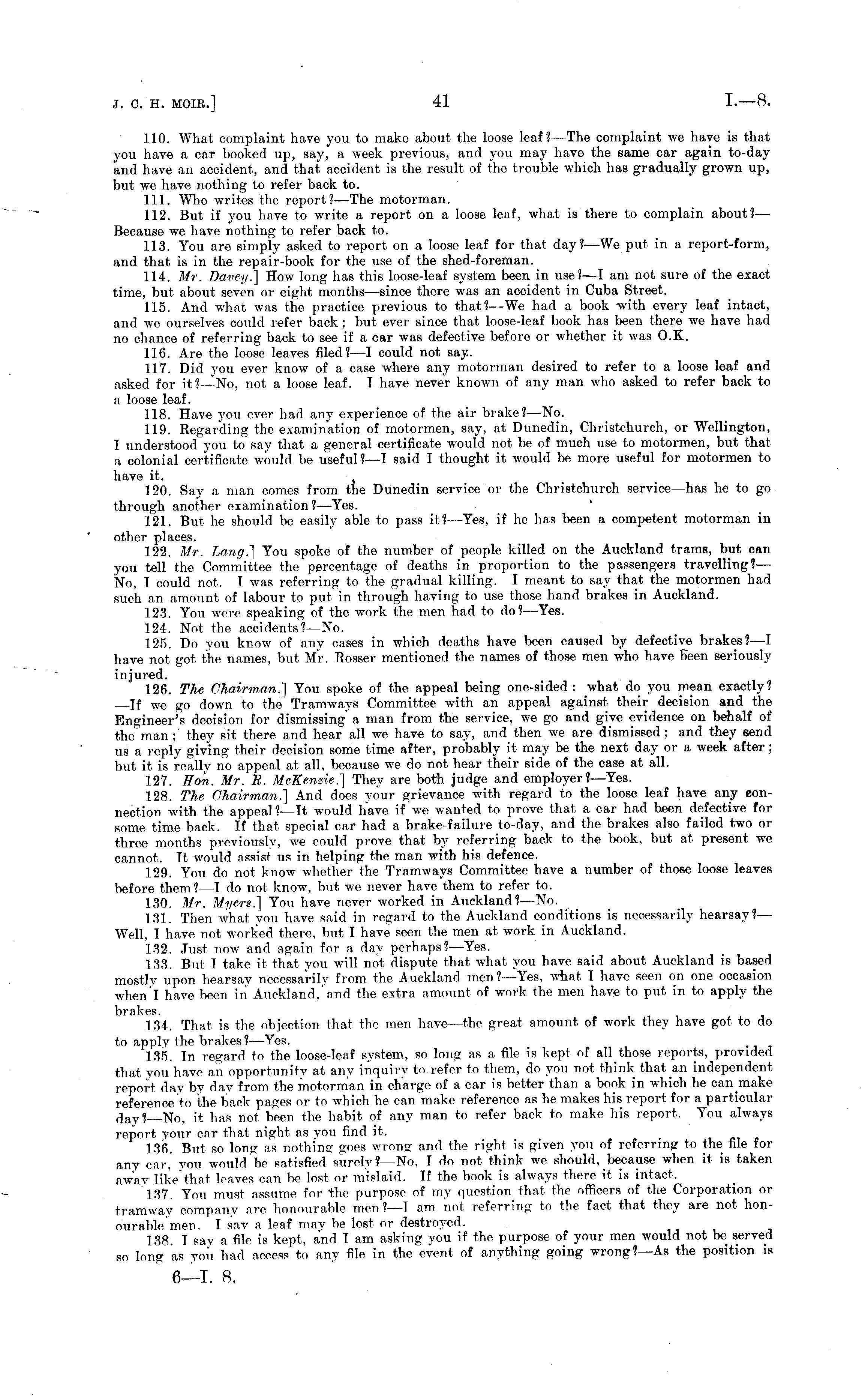 110. What complaint have you to make about the loose leaf? —The complaint we have is that you have a car booked up, say, a week previous, and you may have the same car again to-day and have an accident, and that accident is the result of the trouble which has gradually grown up, but we have nothing to refer back to. 111. Who writes the report?— The motorman. 112. But if you have to write a report on a loose leaf, what is there to complain about? — Because we have nothing to refer back to. 113. You are simply asked to report on a loose leaf for that day?—We put in a report-form, and that is in the repair-book for the use of the shed-foreman. 114. Mr. Davey] How long has this loose-leaf system been in use? —I am not sure of the exact time, but about seven or eight months —since there was an accident in Cuba Street. 115. And what was the practice previous to that? —We had a book with every leaf intact, and we ourselves could refer back; but ever since that loose-leaf book has been there we have had no chance of referring back to see if a car was defective before or whether it was O.K. 116. Are the loose leaves filed? —I could not say. 117. Did you ever know of a case where any motorman desired to refer to a loose leaf and asked for it?—No, not a loose leaf. I have never known of any man who asked to refer back to a loose leaf. 118. Have you ever had any experience of the air brake? —No. 119. Regarding the examination of motormen, say, at Dunedin, Christchurch, or Wellington, I understood you to say that a general certificate would not be of much use to motormen, but that a colonial certificate would be useful? —I said I thought it would be more useful for motormen to have it. 120. Say a man comes from the Dunedin service or the Christchurch service—has he to go through another examination ? —Yes. 121. But he should be easily able to pass it? —Yes, if he has been a competent motorman in other places. 122. Mr. Lang] You spoke of the number of people killed on the Auckland trams, but can you tell the Committee the percentage of deaths in proportion to the passengers travelling?— No, I could not. I was referring to the gradual killing. I meant to say that the motormen had such an amount of labour to put in through having to use those hand brakes in Auckland. 123. You were speaking of the work the men had to do? —Yes. 124. Not the accidents?— No. 125. Do you know of any cases in which deaths have been caused by defective brakes?—l have not got, the names, but Mr. R.osser mentioned the names of those men who have been seriously injured. 126. The Chairman] You spoke of the appeal being one-sided : what do you mean exactly? Tf we go down to the Tramways Committee with an appeal against their decision and the Engineer's decision for dismissing' a man from the service, we go and give evidence on behalf of the man ; they sit there and hear all we have to say, and then we are dismissed; and they send us a reply giving their decision some time after, probably it may be the next day or a week after; but it is really no appeal at all, because we do not hear their side of the case at all. 127. Hon. Mr. B. McKenzie] They are both judge and employer?— Yes. 128. The Chairman] And does your grievance with regard to the loose leaf have any connection with the appeal? —Tt w 7 ould have if we wanted to prove that a car had been defective for some time back. If that special car had a brake-failure to-day, and the brakes also failed two or three months previously, we could prove that by referring back to the book, but at present we cannot. Tt would assist us in helping the man with his defence. 129. You do not know whether the Tramways Committee have a number of those loose leaves before them? —I do not know, but, we never have them to refer to. 130. Mr. Myers] Yon have never worked in Auckland? —No. 131. Then what you have said in regard to the Auckland conditions is necessarily hearsay?— Well, I have not worked there, but T have seen the men at work in Auckland. 132. Just now and again for a day perhaps? —Yes. 133. But T take it that you will not dispute that what you have said about Auckland is based mostly upon hearsay necessarily from the Auckland men? —Yes, what I have seen on one occasion when'l have been in' Auckland.'and the extra amount of work the men have to put in to apply the brakes. 134. That is the objection that the men hay great amount of work they have got to do to apply the brakes ?—Yes. 135. Tn regard to the loose-leaf system, so long as a file is kept of all those reports, provided that, you have an opportunity at any inquiry to refer to them, do you not think that an independent report day by day from the motorman in charge of a car is better than a book in which he can make reference to the back pages or to which he can make reference as he makes his report for a particular day? No, it has not been the habit of any man to refer back to make his report. You always report your car that night as you find it. 136. But so long as nothing goes wrong and the right is given you of referring to the file for any car, you would be satisfied surely?—No, Tdo not think we should, because when it is taken away like"that leaves can be lost or mislaid. Tf the book is always there if is intact. 137. You must assume for the purpose of my question that the officers of the Corporation or tramway company are honourable men ?—T am not referring to the fact that they are not honourable men. T say a loaf may be lost or destroyed. 138. T say a file is kept, and T am asking you if the purpose of your men would not be served so long as you bad access to any file in the event of anything going wrong?—As the position is 6—T. 8.
