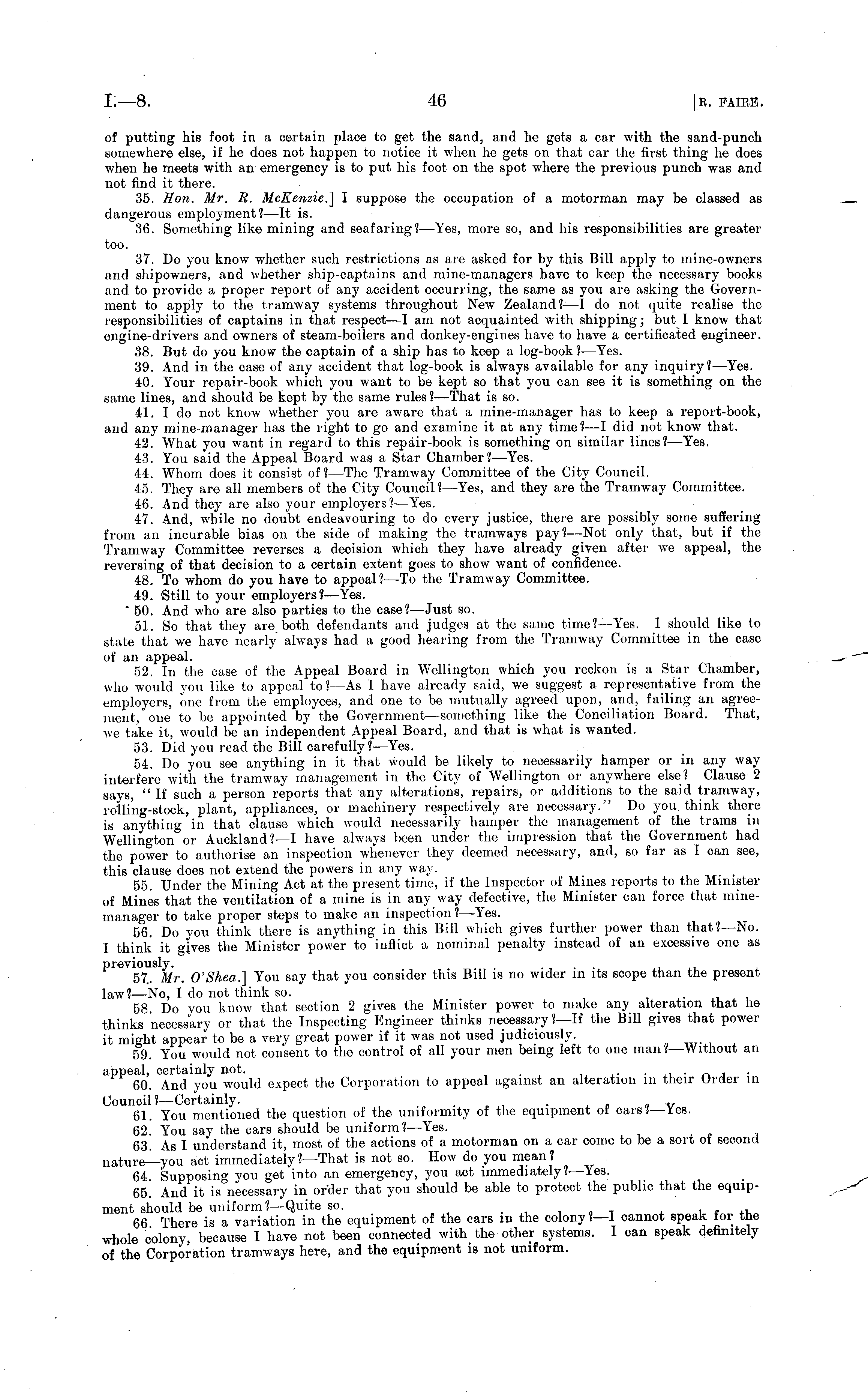 of putting his foot in a certain place to get the sand, and he gets a car with the sand-punch somewhere else, if he does not happen to notice it when he gets on that car the first thing he does when he meets with an emergency is to put his foot on the spot where the previous punch was and not find it there. 35. Hon. Mr. B. McKenzie] I suppose the occupation of a motorman may be classed as dangerous employment?—lt is. 36. Something like mining and seafaring?— Yes, more so, and his responsibilities are greater too. 37. Do you know whether such restrictions as are asked for by this Bill apply to mine-owners and shipowners, and whether ship-captains and mine-managers have to keep the necessary books and to provide a proper report of any accident occurring, the same as you are asking the Government to apply to the tramway systems throughout New Zealand ?—I do not quite realise the responsibilities of captains in that respect—l am not acquainted with shipping; but I know that engine-drivers and owners of steam-boilers and donkey-engines have to have a certificated engineer. 38. But do you know the captain of a ship has to keep a log-book?— Yes. 39. And in the case of any accident that log-book is always available for any inquiry? —Yes. 40. Your repair-book which you want to be kept so that you can see it is something on the same lines, and should be kept by the same rules? —That is so. 41. I do not know whether you are aware that a mine-manager has to keep a report-book, and any mine-manager has the right to go and examine it at any time? —I did not know that. 42. What you want in regard to this repair-book is something on similar lines? —Yes. 43. You said the Appeal Board was a Star Chamber? —Yes. 44. Whom does it consist of?— The Tramway Committee of the City Council. 45. They are all members of the City Council? —Yes, and they are the Tramway Committee. 46. And they are also your employers?— Yes. 47. And, wdiile no doubt endeavouring to do every justice, there are possibly some suffering from an incurable bias on the side of making the tramways pay?— Not only that, but if the Tramway Committee reverses a decision which they have already given after we appeal, the reversing of that decision to a certain extent goes to show want of confidence 48. To whom do you have to appeal?—To the Tramway Committee. 49. Still to your employers? —Yes. " 50. And who are also parties to the case? —Just so. 51. So that they are. both defendants and judges at the same time?-Yes. I should like to state that we have nearly always had a good hearing from the Tramway Committee in the case of an appeal. 52. In the case of the Appeal Board in Wellington which you reckon is a Star Chamber, who would you like to appeal to? —As I have already said, we suggest a representative from the employers, one from the employees, and one to be mutually agreed upon, and, failing an agreement, one to be appointed by the Government —something like the Conciliation Board. That, we take it, would be an independent Appeal Board, and that is what is wanted. 53. Did you read the Bill carefully ?—Yes. 54. Do you see anything in it that would be likely to necessarily hamper or in any way interfere with the tramway management in the City of Wellington or anywhere else? Clause 2 says, " If such a person reports that any alterations, repairs, or additions to the said tramway, rolling-stock, plant, appliances, or machinery respectively are necessary." Do you think there is anything in that clause which would necessarily hamper the management of the trams in Wellington or Auckland?—l have always l>cen under the impression that the Government had the power to authorise an inspection whenever they deemed necessary, and, so far as I can see, this clause does not extend the powers in any way. 55. Under the Mining Act at the present time, if the Inspector of Mines reports to the Minister of Mines that the ventilation of a mine is in any way defective, the Minister can force that minemanager to take proper steps to make an inspection? —Yes. 56. Do you think there is anything in this Bill which gives further power than that?— No. I think it gives the Minister power to inflict a nominal penalty instead of an excessive one as previously. .... ~ 57. Mr. O'Shea] You say that you consider this Bill is no wider in its scope than the present law? —No, I do not think so. 58. Do you know that section 2 gives the Minister power to make any alteration that he thinks necessary or that the Inspecting Engineer thinks necessary ?—lf the Bill gives that power it might appear to be a very great power if it was not used judiciously. 59. You would not consent to the control of all your men being left to one man?— Without an appeal, certainly not. . . . 60. And you would expect the Corporation to appeal against an alteration in their Urder in Council?— Certainly. . , , '-6 61. You mentioned the question of the uniformity of the equipment of cars J—Yes. 62. You say the cars should be uniform? —Yes. 63. As I understand it, most of the actions of a motorman on a car come to be a sort ot second nature—you act immediately?— That is not so. How do you mean? 64. Supposing you get into an emergency, you act immediately? —Yes. 65. And it is necessary in order that you should be able to protect the public that the equipment should be uniform?— Quite so. 66 There is a variation in the equipment of the cars in the colony?—I cannot speak tor the whole colony, because I have not been connected with the other systems. I can speak definitely of the Corporation tramways here, and the equipment is not uniform.