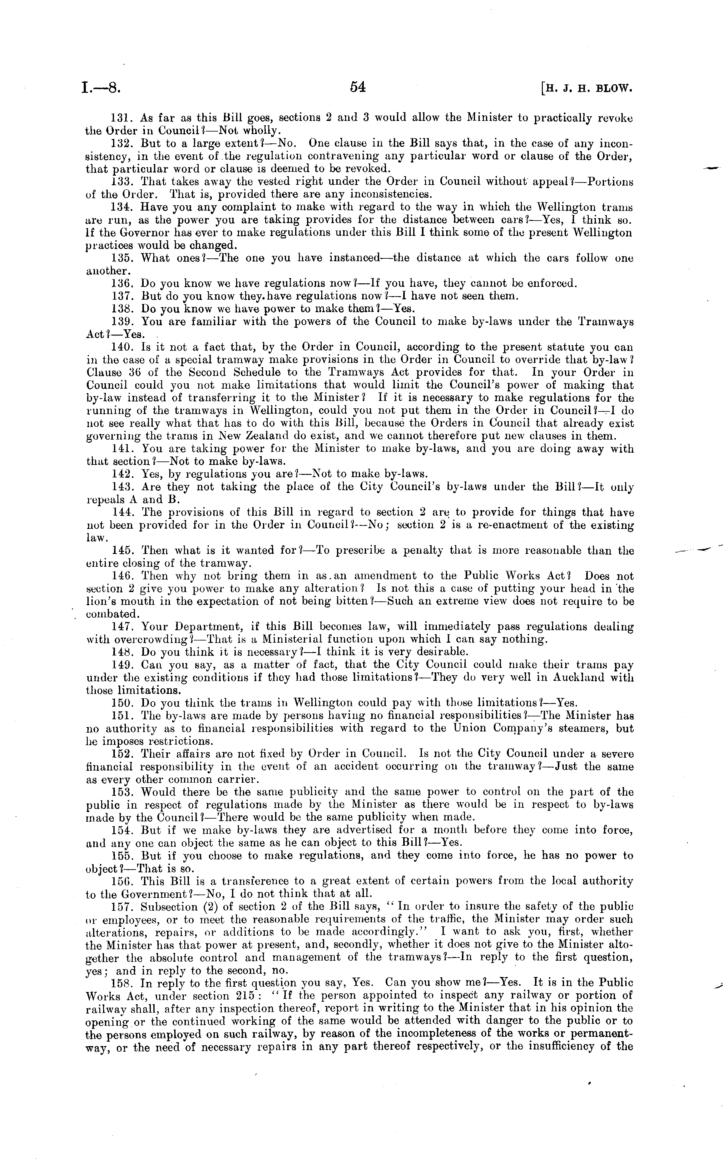 131. As far as this Bill goes, sections 2 and 3 would allow the Minister to practically revoke the Order in Council? —Not wholly. 132. But to a large extent?— No. One clause in the Bill says that, in the case of any inconsistency, in the event of the regulation contravening any particular word or clause of the Order, that particular word or clause is deemed to be revoked. 133. That takes away the vested right under the Order in Council without appeal?— Portions of the Order. That is, provided there are any inconsistencies. 134. Have you any complaint to make with regard to the way in which the Wellington trams are run, as the power you are taking provides for the distance between cars?— Yes, 1 think so. If the Governor has ever to make regulations under this Bill I think some of the present Wellington practices would be changed. 135. What ones? —The one you have instanced —the distance at which the cars follow one another. 136. Do you know w 7 e have regulations now?—lf you have, they cannot be enforced. 137. But do you know they.have regulations now? —I have not seen them. 138. Do you know we have power to make them?— Yes. 139. You are familiar with the powers of the Council to make by-laws under the Tramways Act?— Yes. 140. Is it not a fact that, by the Order in Council, according to the present statute you can in tho case of a special tramway make provisions in the Order in Council to override that by-law ? Clause 36 of the Second Schedule to the Tramways Act provides for that. In your Order in Council could you not make limitations that would limit the Council's power of making that by-law instead of transferring it to the Minister ? If it is necessary to make regulations for the running of the tramways in Wellington, could you not put them in the Order in Council ?—I do not see really what that has to do with this Bill, because the Orders in Council that already exist governing the trams in New Zealand do exist, and we cannot therefore put new clauses in them. 141. You are taking power for the Minister to make by-laws, and you are doing away with that section ? —Not to make by-laws. 142. Yes, by regulations you are? —Not to make by-laws. 143. Are they not taking the place of the City Council's by-laws under the Bill?—It only repeals A and B. 144. The provisions of this Bill in regard to section 2 are to provide for things that have not been provided for in the Order in Council? —No; section 2 is a re-enactment of the existing law. 145. Then what is it wanted for? —To prescribe a penalty that is more reasonable than the entire closing of the tramway. 146. Then why not bring them in as.an amendment to the Public Works Act? Does not section 2 give you power to make any alteration? Is not this a case of putting your head in the lion's mouth in the expectation of not being bitten? —Such an extreme view does not require to be combated. 147. Your Department, if this Bill becomes law, will immediately pass regulations dealing with overcrowding? —That is a Ministerial function upon which I can say nothing. 148. Do you think it is necessary?—l think it is very desirable. 149. Cau you say, as a matter of fact, that the City Council could make their trams pay under the existing conditions if they had those limitations?— They do very well in Auckland with those limitations. 150. Do you think the trams in Wellington could pay with those limitations?— Yes. 151. The by-laws are made by persons having no financial responsibilities?— The Minister has no authority as to financial responsibilities with regard to the Union Company's steamers, but ho imposes restrictions. 152. Their affairs are not fixed by Order in Council. Is not the City Council under a severe financial responsibility in the event of an accident occurring on the tramway?— Just the same as every other common carrier. 153. Would there be the same publicity and the same power to control on the part of the public in respect of regulations made by the Minister as there would be in respect to by-laws made by the Council? —There would be the same publicity when made. 154. But if we make by-laws they are advertised for a month before they come into force, and any one can object the same as he can object to this Bill?— Yes. 155. But if you choose to make regulations, and they come into force, he has no power to object? —That is so. 156. This Bill is a transference to a great extent of certain powers from the local authority to the Government? —No, I do not think that at all. 157. Subsection (2) of section 2 of the Bill says, " In order to insure the safety of the public or employees, or to meet the reasonable requirements of the traffic, the Minister may order such alterations, repairs, or additions to be made accordingly." I want to ask you, first, whether the Minister has that power at present, and, secondly, whether it does not give to the Minister altogether the absolute control and management of the tramways?—ln reply to the first question, yes; and in reply to the second, no. 158. In reply to the first question you say, Yes. Can you show me? —Yes. It is in the Public Works Act, under section 215 : "If the person appointed to inspect any railway or portion of railway shall, after any inspection thereof, report in writing to the Minister that in his opinion the opening or the continued working of the same would be attended with danger to the public or to the persons employed on such railway, by reason of the incompleteness of the works or permanentway, or the need of necessary repairs in any part thereof respectively, or the insufficiency of the