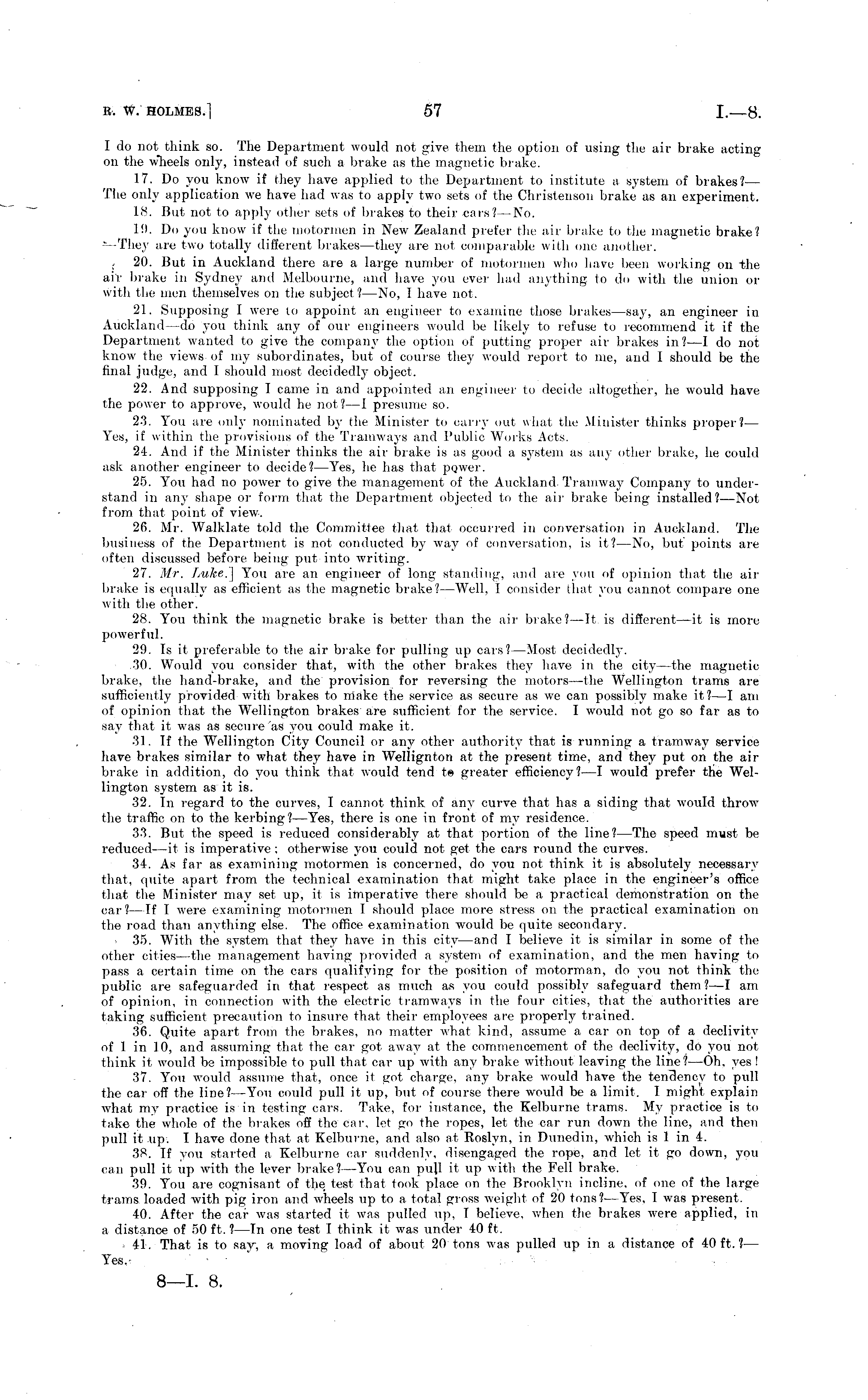 I do not think so. The Department Would not give them the option of using the air brake acting on the wlieels only, instead of such a brake as the magnetic brake. 17. Do you khoW if they have applied to the Department to institute a system of brakes?— The only application we have had was to apply two sets of the Christenson brake as an experiment. 18. But not to apply other sets of brakes to their cars? —No. L 9. Do you know if the motormen in New Zealand prefer the air brake to the magnetic brake? - They are two totally different brakes -they are not comparable with one another. 20. But in Auckland there are a large number of niotorinen who have been working on the air brake in Sydney and Melbourne, and have you ever had anything jo do with the union or with the men themselves on the subject?—No, I have not. 21. Supposing I were to appoint an engineer to examine those brakes—say, an engineer in Auckland—do you think any of our engineers would be likely to refuse to recommend it if the Department wanted to give the company the option of putting proper air brakes in?—l do not know the views of my subordinates, but of course they would report to me, and I should be the final judge, and I should most decidedly object. 22. And supposing I came in and appointed an engineer to decide altogether, he would have the power to approve, would he not? —I presume so. 23. Y x ou are only nominated by the Minister to carry out what the Minister thinks proper;— Yes, if within the provisions of the Tramways and Public Works Acts. 2 1. And if the Minister thinks the air brake is as good a system as any other brake, he could ask another engineer to decide?— Yes, he lias that power. 25. You had no power to give tin management of the Auckland Tramway Company to understand in any shape or form that the Department objected to the air brake being installed?— Not from that point of viexv. 26. Mr. Walklate told the Committee that that occurred in conversation in Auckland. The business of the Department is not conducted by way of conversation, is it .'- No, but points are often discussed before being put into writing. 27. Mr. Luke] You are an engineer of long standing, and are you of opinion that the air brake is equally as efficient as the magnetic brake?— Well, 1 consider that you cannot compare one with the other. 28. You think the magnetic brake is better than the air brake?—lt is different —it is more powerful. 29. Is it preferable to the air brake for pulling up ears? -Most decidedly. 30. Would you consider that, with the other brakes they have in the city—the magnetic brake, the hand-brake, and the provision for reversing the motors —the Wellington trams are sufficiently provided with brakes to make the service as secure as we can possibly make it?—l am of opinion that the Wellington brakes are sufficient for the service. I would not go so far as to say that it was as secure as you could make it. 31. If the Wellington City Council or any other authority that is running a tramway service have brakes similar to what they have in Wellignton at the present time, and they put on the air brake in addition, do you think that would tend t© greater efficiency?—l would prefer the Wellington system as it is. 32. In regard to the curves, I cannot think of any curve that has a siding that xvould throw the traffic on to the kerbing?—Yes, there is one in front of my residence. 33. But the speed is reduced considerably at that portion of the line?— The speed must be reduced —it is imperative ; otherwise you could not get the cars round the curves. 34. As far as examining motormen is concerned, do you not think it is absolutel} 7 necessary that, quite apart from the technical examination that might take place in the engineer's office that the Minister may set up, it is imperative there should be a practical demonstration on the car?—lf I were examining niotorinen I should place more stress on the practical examination on the road than anything else. The office examination would be quite secondary. 35. With the system that they have in this city—and I believe it is similar in some of the other cities—the management having provided a system of examination, and the men having to pass a certain time on the cars qualifying for the position of motorman, do you not think the public are safeguarded in that reaped as much as you could possibly safeguard them?—l am of opinion, in connection with the electric tramways in the four cities, that the authorities are taking sufficient precaution to insure that their employees are properly trained. 36. Quite apart from the brakes, no matter what kind, assume a car on top of a declivity of 1 in 10, and assuming that the oar got, away at the commencement of the declivity, do you not think it would be impossible to pull that car up with any brake without leaving the line?—Oh, yes! 37. You would assume that, once it got charge, any brake would have the tendency to pull the car off the line? —You could pull it up, but of course there xvould be a limit. I might explain what my practice is in testing cars. Take, for instance, the Kelburnc trams. My practice is to take the whole of the brakes off the car, lei go the ropes, let the car run down the line, and then pull it, up. I have done that at Kelburnc, and also at Roslyn, in Dunedin, which is 1 in 4. 38. If you started a Kelburne car suddenly, disengaged the rope, and let it go down, you can pull it up with the lever brake?— You can pull it up with the Fell brake. 39. You are cognisant of the test that took place on the Brooklyn incline, of one of tin' large trams loaded with pig iron and xvheels up to a total gross weight of 20 tons?— Yes, I was present. 40. After the car was started it was pulled up, I believe, when the brakes were applied, in a distance of 50 ft. ?—ln one test I think it was under 40 ft. 41. That is to say, a moving load of about 20 tons was pulled up in a distance of 4