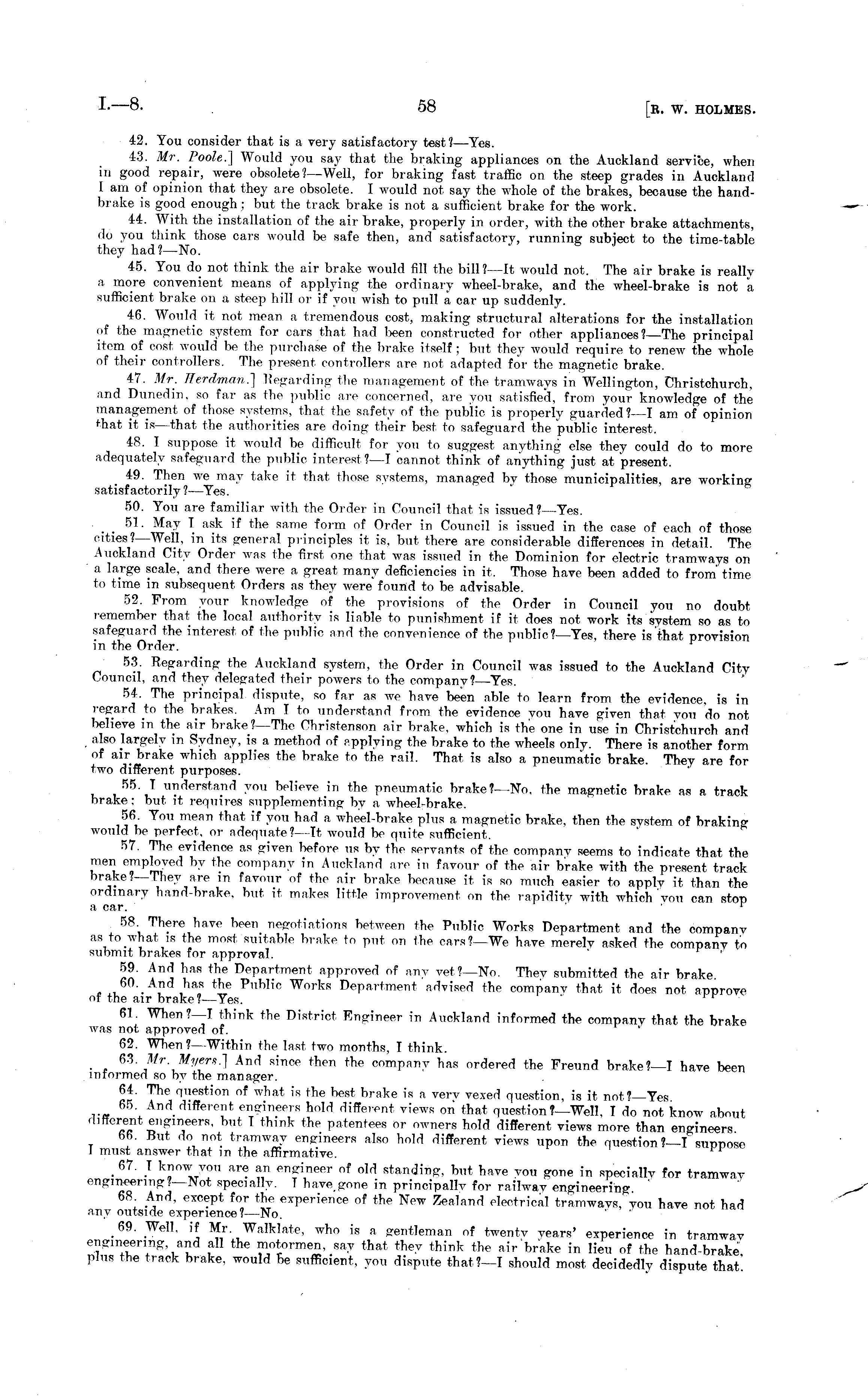 42. You consider that is a very satisfactory test?— Yes. 43. Mr. Poole] Would you say that the braking appliances on the Auckland service, when in good repair, xvere obsolete?— Well, for braking fast traffic on the steep grades in Auckland lam of opinion that they are obsolete. I would not say the whole of the brakes, because the handbrake is good enough; but the track brake is not a sufficient brake for the work. 44. With the installation of the air brake, properly in order, with the other brake attachments, do you think those cars would be safe then, and satisfactory, running subject to the time-table they had?— No. 45. You do not think the air brake would fill the bill? —It would not. The air brake is really a. more convenient means of applying the ordinary wheel-brake, and the wheel-brake is not a sufficient brake on a steep hill or if you wish to pull a car up suddenly. 46. Would it not mean a tremendous cost, making structural alterations for the installation of the magnetic system for cars that had I)een constructed for other appliances?— The principal item of cost xvould be the purchase of the brake itself ; but they would require to renew the whole of their controllers. The present controllers are not, adapted for the magnetic brake. 47. Mr. Herdman] Regarding the management of the tramways in Wellington, Christchurch, and Dunedin, so far as the public are concerned, are you satisfied, from your knowledge of the management of those systems, that the safety of the public is properly guarded?—l am of opinion that it is—that the authorities are doing their best to safeguard the public interest. 48. I suppose it would be difficult for you to suggest, anything else they could do to more adequately safeguard the public interest?—T cannot think of anything just at present. 49. Then we may take it that those systems, managed by those municipalities, are working satisfactorily ?—Yes. 50. You are familiar with the Order in Council that is issued?— Yes. 51. May I ask if the same form of Order in Council is issued in the case of each of those cities?— Well, in its general principles it is, but there are considerable differences in detail. The Auckland City Order xvas the first one that was issued in the Dominion for electric tramways on ' a large scale, and there were a great many deficiencies in it, Those have been added to from' time to time in subsequent Orders as they xvere found to be advisable. 52. From your knowledge of the provisions of the Order in Council you no doubt remember that the local authority is liable to punishment if it does not work its system so as to safeguard the interest of the public and the convenience of the public?— Yes, there is that provision in the Order. 53. Regarding the Auckland system, the Order in Council xvas issued to the Auckland City Council, and they delegated their poxvers to the company?— Yes. 54. The principal dispute, so far as we have been able to learn from the evidence, is in regard to the brakes. Am Tto understand from the evidence you have given that you do not believe in the air brake?— The Ohristenson air brake, which is the one in use in Christchurch and also largely m Sydney, is a method of applying the brake to the wheels only. There is another form of air brake which applies the brake to the rail. That is also a pneumatic brake. They are for two different purposes. 55. I understand you believe in the pneumatic brake?—No, the magnetic brake as a track brake: but it requires supplementing by a wheel-brake. 56. You mean that if you had a wheel-brake plus a magnetic brake, then the system of brakin" would be perfect, or adequate?—Tt xvould be quite sufficient, 57. The evidence as given before us by the servants of the company seems to indicate that the men employed by the company in Auckland are in favour of the air brake with the present track brake?— They are in favour of the air brake because it is so much easier to apply it than the ordinary hand-brake, but it makes little improvement on the rapidity with which 'you can stop a car. ' * 58. There have been negotiations between the Public Works Department and the company as to what is the most, suitable brake to put on the cars?—We have merely asked the company to submit brakes for approval. ' 59. And has the Department approved of any vet?— No. They submitted the air brake 60. And has the Public Works Department advised the company that it does not approve of the air brake?— Yes. " rr 61. When?—l think the District Engineer in Auckland informed the company that the brake was not approved of. 62. When?— Within the last two months, I think. _ 63. Mr. Myers] And since then the company has ordered the Freund brake?—T have been informed so by the manager. 64. The question of what is the best brake is a very vexed question, is it not?— Yes 65. And_ different engineers hold different views on that question ?—Well, T do not know about different engineers, but, I think the patentees or owners hold different views more than engineers 6b. But do not tramway engineers also hold different views upon the question ?—T suppose I must answer that in the affirmative. . 67 ' } k ?°\7™ are an engineer of old standing, but have you gone in specially for tramway engineering?— Not specially. T have gone in principally for railway engineering ' 68. And, except for the experience of the New Zealand electrical tramways, you have not had any outside experience?— No. 69 Well, if Mr Walklate, who is a gentleman of twenty years' experience in tramway engineering, and all the motormen, say that they think the air brake in lieu of the hand-brake, plus the track brake, would be sufficient, you dispute that?—l should most decidedly dispute that
