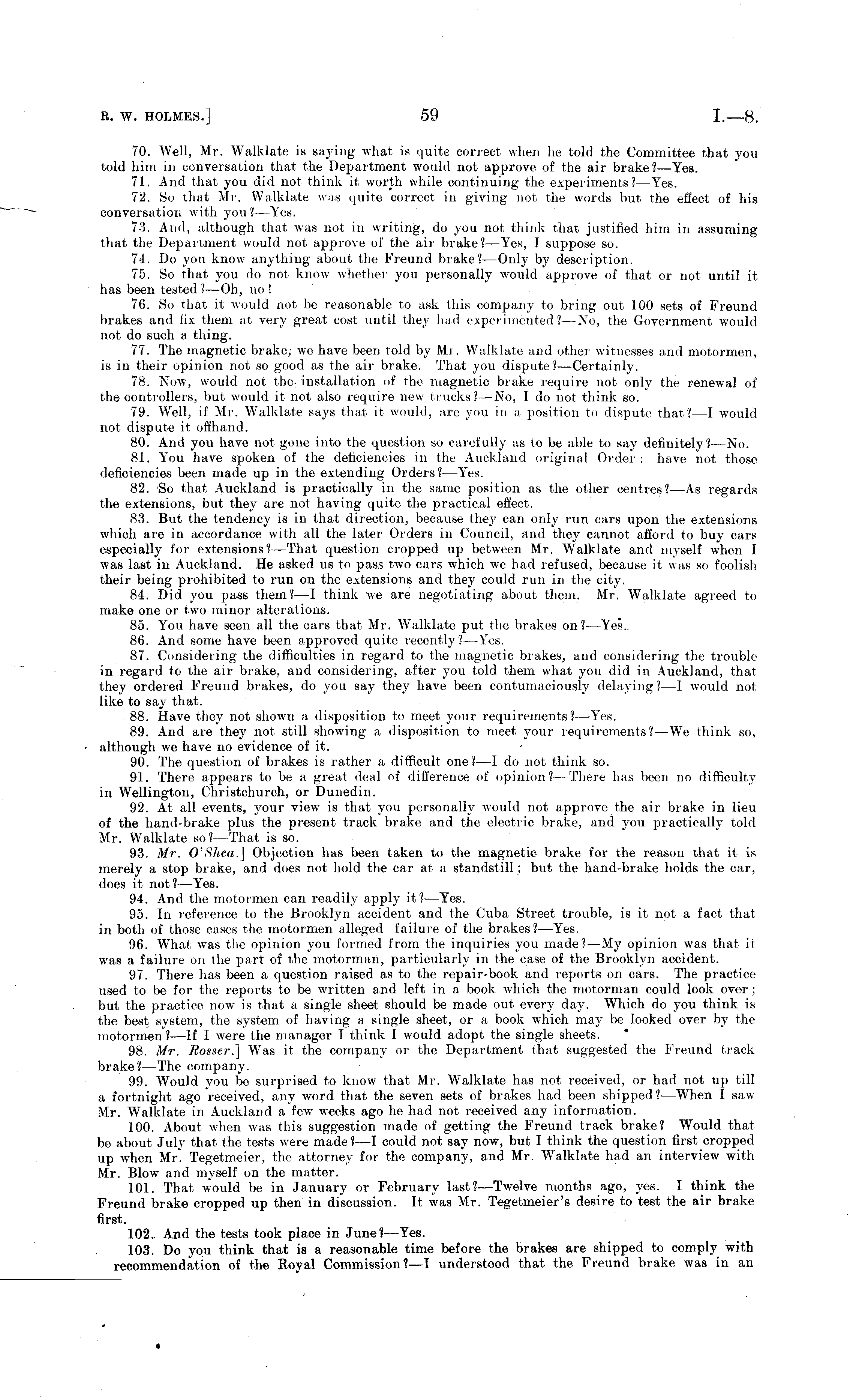 70. Well, Mr. Walklate is saying what is quite correct when he told the Committee that you told him in conversation that the Department would not approve of the air brake?— Yes. 71. And that you did not think it, worth while continuing the experiments?— Yes. 72. So that Mr. Walklate was quite correct in giving not the words but, the effect of his conversation with you?— Yes. 73. And, although that was not in writing, do you not think that justified him in assuming that the Department xvould not approve of the air brake? —Yes, I suppose so. 7-1. Do you know anything about the Freund brake?— Only by description. 75. So that you do not know whether you personally xvould approve of that or not until ithas been tested ?—Oh, no ! 76. So that it would not lie reasonable to ask this company to bring out 100 sets of Freund brakes and fix them at very great cost until they had experimented? No. the Government xvould not do such a thing. 77. The magnetic brake; we have been told by Mi . Walklate and other witnesses and motormen, is in their opinion not so good as the air brake. That you dispute?— Certainly. 78. Now, would not the installation of the magnetic brake require not only the renewal of the controllers, but would it not also require new trucks?—No, I do not think so. 79. Well, if Mr. Walklate says that it would, are you in a position to dispute that ?■■■—l would not dispute it offhand. 80. And you have not gone into the question so carefully as to be able to say definitely?— No. 81. You have spoken of the deficiencies in the Auckland original Order ; have not those deficiencies been made up in the extending Orders? —Yes. 82. So that Auckland is practically in the same position as the other centres?—As regards the extensions, but they are not having quite the practical effect. 83. But the tendency is in that direction, because they can only run cars upon the extensions which are in accordance with all the later Orders in Council, and they cannot afford to buy cars especially for extensions?— That question cropped up between Mr. Walklate and myself when 1 was last in Auckland. He asked us to pass two cars which we had refused, because it was so foolish their being prohibited to run on the extensions and they could run in the city. 84. Did you pass them?—l think we are negotiating about them. Mr. Walklate agreed to make one or two minor alterations. 85. You have seen all the cars that Mr. Walklate put the brakes on?— Yes.. 86. And some have been approved quite recently? Yes, 87. Considering the difficulties in regard to the magnetic brakes, and considering the trouble in regard to the air brake, and considering, after you told them what you did in Auckland, that they ordered Freund brakes, do x 7 ou say they have been contumaciously delaying?—l would not like to say that. 88. Have they not shown a disposition to meet your requirements?— Yes. 89. And are they not still showing a disposition to meet your requirements?—We think so, although we have no evidence of it. 90. The question of brakes is rather a difficult one?—l do not think so. 91. There appears to be a great deal of difference of opinion? There has been no difficulty in Wellington, Christchurch, or Dunedin. 92. At all events, your view 7 is that you personally would not approve the air brake in lieu of the hand-brake plus the present track brake and the electric brake, and you practically told Mr. Walklate so? —That is so. 93. Mr. O'Shea] Objection has been taken to the magnetic brake for the reason that it is merely a stop brake, and does not hold the car at a standstill; but the hand-brake holds the car, does it not? —Yes. 94. And the motormen can readily apply it? —Yes. 95. In reference to the Brooklyn accident and the Cuba Street trouble, is it not a fact that in both of those cases the motormen alleged failure of the brakes?— Yes. 96. What xvas the opinion you formed from the inquiries you made?—My opinion was that ii was a failure on the part of the motorman, particularly in the case of the Brooklyn accident. 97. There has been a question raised as to the repair-book and reports on cars. The practice used to lie for the reports to lie written and left in a book which the motorman could look over : but the practice now is that a single sheet should be made, out every day. Which do you think is the best system, the system of having a single sheet, or a book which may lie looked over by the motormen ?—lf I were the manager I think I would adopt the single sheets. 98. Mr. Roster] Was it the company or the Department that suggested the Freund track brake?— The company. 99. Would you be surprised to knoxv that Mr. Walklate has not received, or had not up till a fortnight ago received, any word that the seven sets of brakes had been shipped?— When I saw Mr. Walklate in Auckland a fexv weeks ago he had not received any information. 100. About when was this suggestion made of getting the Freund track brake? Would that be about July that the tests were made?—l could not say now, but I think the question first cropped up when Mr. Tegetmeier, the attorney for the company, and Mr. Walklate had an interview with Mr. Blow and myself on the matter. 101. That would be in January or February last? —Twelve months ago, yes. I think the Freund brake cropped up then in discussion. It was Mr. Tegetmeier's desire to test the air brake first. 102. And the tests took place in June? —Yes. 103. Do you think that is a reasonable time before the brakes are shipped to comply with recommendation of the Royal Commission ?—I understood that the Freund brake was in an <