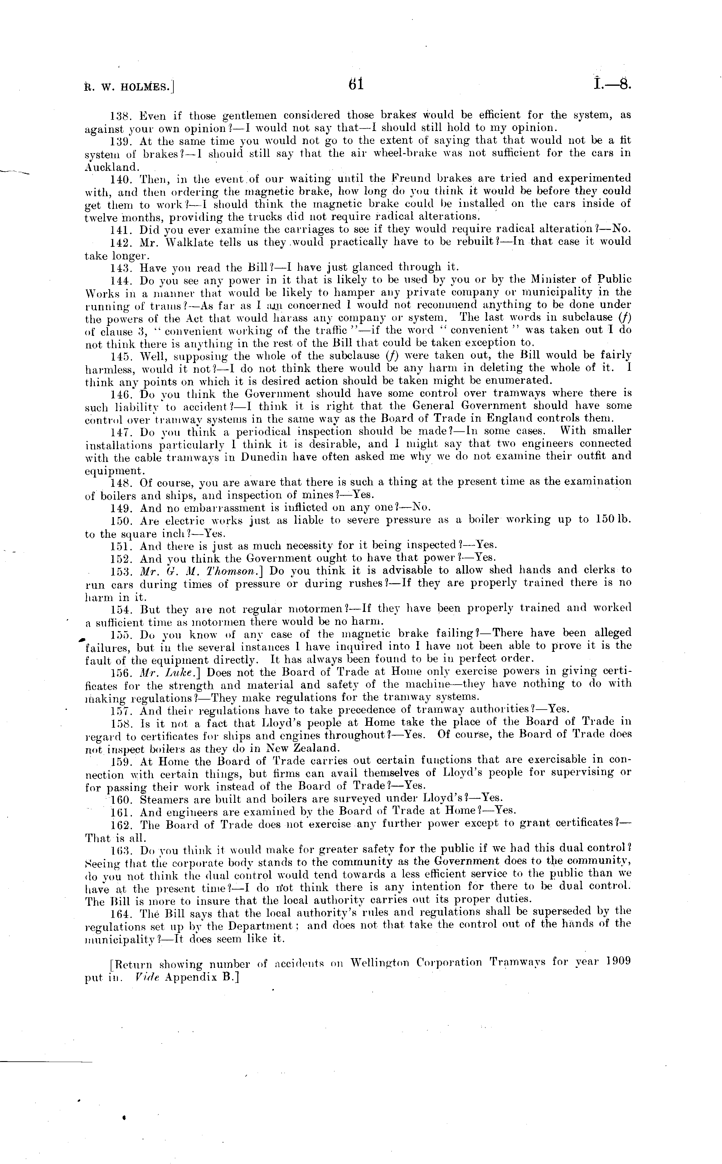 138. Even if those gentlemen considered those brakes would be efficient for the system, as against your own opinion?—l would not say that—l should still hold to my opinion. 139. At the same time you would not go to the extent of saying that that would not be a fit system of brakes? I should still say that the air wheel-brake was not sufficient for the cars in Auckland. 140. Then, in the event of our waiting until the Freund brakes are tried and experimented with, and then ordering the magnetic brake, how long do you think it xvould be before they could get them to work ?—I should think the magnetic brake could be installed on the cars inside of txvelve months, providing the trucks did not require radical alterations. 111. Did you ever examine the carriages to see if they would require radical alteration?— No. 142. Mr. Walklate tells us they would practically have to be rebuilt? —In that case it would take longer. 143. Have you read the Bill?— 1 have just glanced through it. 144. Do xoii see any power in it that is likely to be used by you or by the Minister of Public Works in a manner that would be likely to hamper any private company or municipality in the running of trains? -As far as I ajn concerned I would not recommend anything to be done under the powers of the Act that would harass any company or system. The last words in subclause (/) of clause 3, " convenient working of the traffic " —if the word " con\ 7 enient " xvas taken out Ido not think there is anything in the rest of the Bill that could be taken exception to. 145. Well, supposing the whole of the subclause (/) were taken out, the Bill would be fairly harmless, xvould it not?—l do not think there xvould lie any harm in deleting the whole of it. 1 think any points on which it is desired action should be taken might be enumerated. 146." Do you think the Government should hax 7 e some control over tramways where there is such liability to accident?—l think it is rigid that the General Government should have some control over tramway systems in the same way as the Board of Trade in England controls them. 147. Do you think a periodical inspection should he made? —In some cases. With smaller installations particularly I think it is desirable, and 1 might say that two engineers connected with the cable tramways in Dunedin have often asked me why we do not examine their outfit and equipment. 148. Of course, you are aware that there is such a thing at the present time as the examination of boilers and ships, and inspection of mines? — Yea. 149. And no embarrassment is inflicted on any one?— No. 150. Are electric works just as liable to severe pressure as a boiler working up to 1501b. to the square inch?— Yes. 151. And there is just as much necessity for it being inspected? —Yes. 152. And you think the Government ought to have that power? —Y T es. 153. Mr. '<,'. M. Thomson] Do you think it is advisable to allow shed hands and clerks to run cars during times of pressure or during rushes?—lf they are properly trained there is no harm in it. 154. But they are not regular inotornien? —If they have been properly trained and worked a sufficient time as motormen there would be no harm. 155. Do you know of any case of the magnetic brake failing? —There have been alleged failures, but in the several instances I have inquired into I have not been able to prove it is the fault of the equipment directly. It has always been found to be in perfect order. 156. Mr. Luke] Does not the Board of Trade at Home only exercise powers in giving certificates for the strength and material and safety of the machine—they have nothing to do with making regulations?— They make regulations for the tramway systems. 157. And their regulations have to take precedence of tramway authorities? —Yes. 158. Is it not a fact that Lloyd's people at Home take the place of the Board of Trade in regard to certificates for ships and engines throughout?—Y'es. Of course, the Board of Trade does not inspect boilers as they do in New Zealand. 159. At Home the Board of Trade carries out certain functions that are exercisable in connection with certain things, but firms can avail themselves of Lloyd's people for supervising or for passing their work instead of the Board of Trade?— Yes. 160. Steamers are built and boilers are surveyed under Lloyd's?— Yes. 161. And engineers are examined by the Board of Trade at Home?— Yes. 162. The Hoard of Trade does not exercise any further power except to grant certificates?— That is all. 163. Do you think it would make for greater safety for the public if xve had this dual control? Seeing that the corporate body stands to the community as the Government does to the community, do you not think the dual control would tend towards a less efficient service to the public than we have at the present time? —I do not think there is any intention for there to be dual control. The Bill is more to insure that the local authority carries out its proper duties. 164. The Bill says that the local authority's rules and regulations shall be superseded by the regulations set up by the Department : and does not that take the control out of the hands of the municipality?—lt does seem like it, [Return shoxving number of accidents on Wellington Corporation Tramways for year 1909 put in. Vide Appendix B.]
