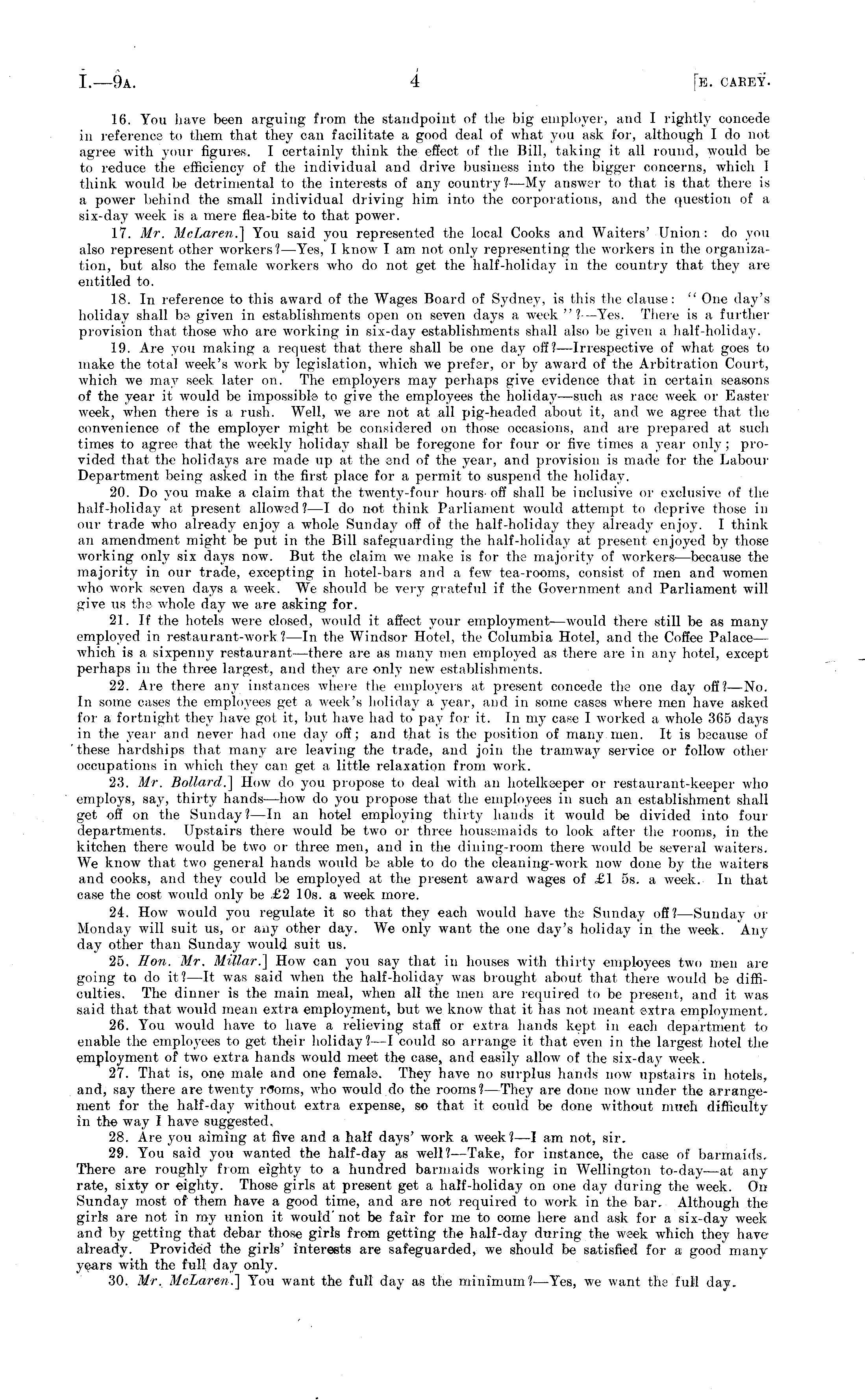 16. You have been arguing from the standpoint of the big employer, and I rightly concede in reference to them that they can facilitate a good deal of what you ask for, although I do not agree with your figures. 1 certainly think the effect of the Bill, taking it all round, would be to reduce the efficiency- of the individual and drive business into the bigger concerns, which 1 think would be detrimental to the interests of any country?—My answer to that is that there is a power behind the small individual driving him into the corporations, and the question of a six-day week is a mere flea-bite to that power. 17. Mr. McLaren.] You said you represented the local Cooks and Waiters' Union: do you also represent other workers? —Yes, I know I am not only representing the workers in the organization, but also the female workers who do not get the half-holiday in the country that they are entitled to. 18. In reference to this award of the Wages Board of Sydney, is this the clause: " One day's holiday shall be given in establishments open on seven days a week " ?-— Y r es. Then' is a further provision that those who are working in six-day establishments shall also be given a half-holiday. 19. Are you making a request that there shall be one day off?—lrrespective of what goes to make the total week's work by legislation, which we prefer, or by award of the Arbitration Court, which we may seek later on. The employers may perhaps give evidence that in certain seasons of the year it would be impossible to give the employees the holiday—such as race week or Easter week, when there is a rush. Well, we are not at all pig-headed about it, and we agree that the convenience of the employer might be considered on those occasions, and are prepared at such times to agree that the weekly holiday shall be foregone for four or five times a year only ; provided that the holidays are made up at the end of the year, and provision is made for the Labour Department being asked in the first place for a permit to suspend the holiday. 20. Do you make a claim that the twenty-four hours- off shall be inclusive or exclusive of the half-holiday at present allowed?—l do not think Parliament would attempt to deprive those in our trade who already enjoy a whole Sunday 7 off of the half-holiday they already enjoy. I think an amendment might be put in the Bill safeguarding the half-holiday at present enjoyed by those working only six days now. But the claim we make is for the majority of workers—because the majority in our trade, excepting in hotel-bars and a few tea-rooms, consist of men and women who work seven days a week. We should be very grateful if the Government and Parliament will give us the whole day we are asking for. 21. If the hotels were closed, would it affect your employment—would there still be as many employed in restaurant-work?—ln the Windsor Hotel, the Columbia Hotel, and the Coffee Palace— which is a sixpenny restaurant—there are as many men employed as there are in any hotel, except perhaps in the three largest, and they are only new establishments. 22. Are there any instances where the employers at present concede the one day off?— No. In some cases the employees get a week's holiday a year, and in some cases where men have asked for a fortnight they have got it, but have had to pay for it. In my case I worked a whole 365 da3 T s in the year and never had one day off; and that is the position of many men. It is because of these hardships that many are leaving the trade, and join the tramway service or follow other occupations in which they can get a little relaxation from work. 23. Mr. Bollard.] How do you propose to deal with an hotelkeeper or restaurant-keeper who employs, say, thirty hands—how do you propose that the employees in such ail establishment shall get off on the Sunday? —In an hotel employing thirty hands it would be divided into four departments. Upstairs there would be two or three housemaids to look after the rooms, in the kitchen there would be tyvo or three men, and in the dining-room there would be several waiters. We know that two general hands would be able to do the cleaning-work now done by the waiters and cooks, and they could be employed at the present award wages of £1 ss. a week. In that case the cost would only be £2 10s. a week more. 24. How would you regulate it so that they each would have the Sunday off?— Sunday or Monday will suit us, or any other day. We only want the one day's holiday in the week. Any day other than Sunday would suit us. 25. Hon. Mr. Millar.] How can you say that in houses with thirty employees two men are going to do it?—lt was said when the half-holiday was brought about that there would be difficulties. The dinner is the main meal, when all the men are required to be present, and it was said that that would mean extra employment, but we know that it has not meant extra employment. 26. You would have to have a relieving staff or extra hands kept in each department to enable the employees to get their holiday?—l could so arrange it that even in the largest hotel the employment of two extra hands would meet the case, and easily allow of the six-day week. 27. That is, one male and one female. They have no surplus hands now upstairs in hotels, and, say there are twenty rffoms, who would do the rooms? —They are done now under the arrangement for the half-day without extra expense, so that it could be done without much difficulty in the way I have suggested, 28. Are you aiming at five and a half days' work a week?—l am not, sir. 29. You said you wanted the half-day as well? —Take, for instance, the case of barmaids. There are roughly from eighty to a hundred barmaids working in Wellington to-day—at any rate, sixty or eighty. Those girls at present get a half-holiday on one day during the week. On Sunday most of them have a good time, and are not required to work in the bar. Although the girls are not in my union 