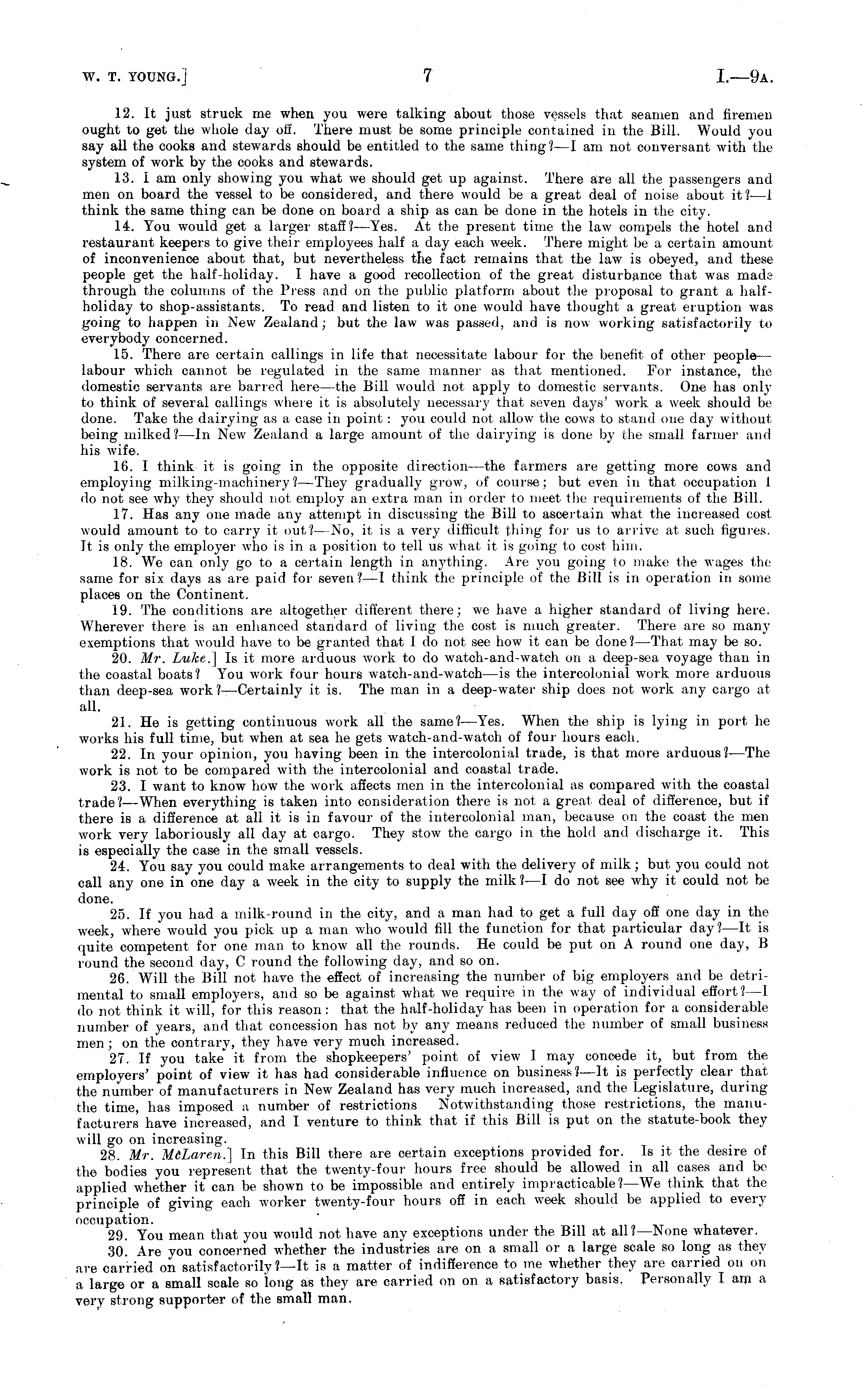 12. It just struck me when you were talking about those vessels that seamen and firemen ought to get the whole day off. There must be some principle contained in the Bill. Would you say all the cooks and stewards should be entitled to the same thing?—l am not conversant with the system of work by the cooks and stewards. 13. lam only showing you what we should get up against. There are all the passengers and men on board the vessel to be considered, and there would be a great deal of noise about it? —1 think the same thing can be done on board a ship as can be done in the hotels in the city. 14. You would get a larger staff?— Yes. At the present time the law compels the hotel and restaurant keepers to give their employees half a day each week. There might be a certain amount of inconvenience about that, but nevertheless the fact remains that the law is obeyed, and these people get the half-holiday. I have a good recollection of the great disturbance that was made through the columns of the Press and on the public platform about the proposal to grant a halfholiday to shop-assistants. To read and listen to it one would have thought a great eruption was going to happen in New Zealand; but the law- was passed, and is now working satisfactorily to everybody concerned. 15. There are certain callings in life that necessitate labour for the benefit of other people— labour which cannot be regulated in the same manner as that mentioned. For instance, the domestic servants are barred here—the Bill would not apply to domestic servants. One has only to think of several callings where it is absolutely necessary that seven days' work a week should be done. Take the dairying as a case in point : you could not allow the cows to stand one day without being milked?—ln New Zealand a large amount of the dairying is done b}' the small farmer ami his wife. 16. I think it is going in. the opposite direction—the farmers are getting more cows and employing milking-machinery ?—They gradually grow, of course; but even in that occupation 1 do not see why they should not employ an extra man in order to meet the requirements of the Bill. 17. Has any one made any attempt in discussing the Bill to ascertain what the increased cost would amount to to carry it out? —No, it is a very difficult thing for us to arrive at such figures. It is only the employer who is in a position to tell us what it is going to cos! him. 18. We can only go to a certain length in anything. Are you going to make the wages the same for six days as are paid for seven?—l think the principle of the Bill is in operation in some places on the Continent. 19. The conditions are altogether different there; we have a higher standard of living here. Wherever there is an enhanced standard of living the cost is much greater. There are so many exemptions that would have to be granted that 1 do not see how it can be done? —That may be so. 20. Mr. ljuke.] Is it more arduous work to do watch-and-watch on a deep-sea voyage than in the coasstal boats? You work four hours watch-and-watch—is the intercolonial work more arduous than deep-sea work? —Certainly it is. The man in a deep-water ship does not work any cargo at all. 21. He is getting continuous work all the same? —Yes. When the ship is lying in port he works his full time, but when at sea he gets watch-and-watch of four hours each. 22. In your opinion, you having been in the intercolonial trade, is that more arduous?— The work is not to be compared with the intercolonial and coastal trade. 23. I want to know how the work affects men in the intercolonial as compared with the coastal trade? —When everything is taken into consideration there is not a great deal of difference, but if there is a difference at all it is in favour of the intercolonial man, because on the coast the men work very laboriously all day at cargo. They stow the cargo in the hold and discharge it. This is especially the case in the small vessels. 24. You say you could make arrangements to deal with the delivery of milk; but you could not call any one in one day a week in the city to supply the milk? —I do not see why it could not be done. 25. If you had a milk-round in the city, and a man had to get a full day off one day in the week, where would you pick up a man who would fill the function for that particular day? —It is quite competent for one man to know all the rounds. He could be put on A round one day, B round the second day, C round the following day, and so on. 26. Will the Bill not have the effect of increasing the number of big employers and be detrimental to small employers, and so be against what we require in the way of individual effort?—l do not think it will, for this reason: that the half-holiday has been in operation for a considerable number of years, and that concession has not by any means reduced the number of small business men; on the contrary, they have very much increased. 27. If you take" it from the shopkeepers' point of view I may concede it, but from the employers' point of view it has had considerable influence on business? —It is perfectly clear that the number of manufacturers in New Zealand has very much increased, and the Legislature, during the time, has imposed a number of restrictions Notwithstanding those restrictions, the manufacturers have increased, and I venture to think that if this Bill is put on the statute-book they will go on increasing. 28. Mr. McLaren.] In this Bill there are certain exceptions provided for. Is it the desire of the bodies you represent that the twenty-four hours free should be allowed in all cases and be applied whether it can be shown to be impossible and entirely impracticable?—We think that the principle of giving each worker twenty-four hours off in each week should be applied to every occupation. 29. You mean that you would not have any exceptions under the Bill at all?— None whatever. 30. Are you concerned whether the indust