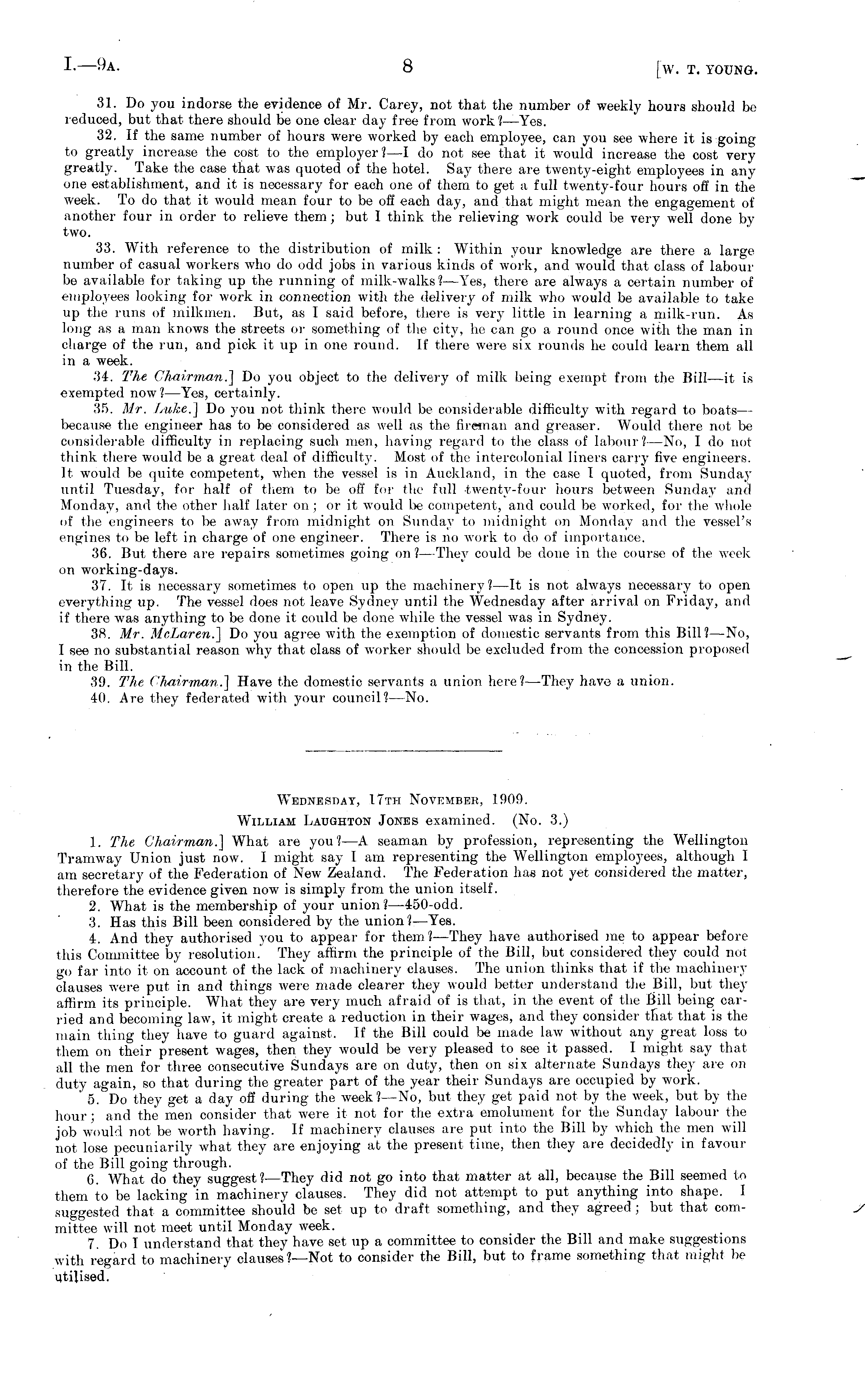 Wednesday, 17tii Novkmheh, 1900. William Laughton Jones examined. (No. 3.) 1. The Chairman.'] What are you? —A seaman by profession, representing the Wellington Tramway Union just now. I might say I am representing the Wellington employees, although I am secretary of the Federation of New Zealand. The Federation has not yet considered the matter, therefore the evidence given now is simply from the union itself. 2. What is the membership of your union?—450-odd. 3. Has this Hill been considered by the union? —Yes. 4. And they authorised you to appear for them? —They have authorised me to appear before this Committee by resolution.' They ailirm the principle of the Hill, but considered they could not go far into it on account of the lack of machinery clauses. The union thinks that if the machinery clauses were put in and things were made clearer they would better understand the Hill, but they affirm its principle. What they are very much afraid of is that, in the event of the Hill being carried and becoming law, it might create a reduction in their wages, and they consider that that is the main thing they have to guard against. If the Hill could be made law without any great loss to them on their present wages, then they would be very pleased to see it passed. I might say that all the men for three consecutive Sundays are on duty, then on six alternate Sundays they are on duty again, so that during the greater part of the year their Sundays are occupied by work. 5. Do they get a day off during the week?—No, but they get paid not by the week, but by the hour; and the men consider that were it not for the extra emolument for the Sunday labour the job w'ould not be worth having. If machinery clauses are put into the Hill by which the men will not lose pecuniarily what they are enjoying at the present time, then they are decidedly in favour of the Hill going through. G. What do they suggest? —They did not go into that matter at all, because the Bill seemed to them to be lacking in machinery clauses. They did not attempt to put anything into shape. I suggested that a committee should be set up to draft something, and they agreed ; but that committee will not meet until Monday week. 7. Do I understand that they have set up a committee to consider the Bill and make suggestions with regard to machinery clauses?—Not to consider the Hill, but to frame something that might be utilised.