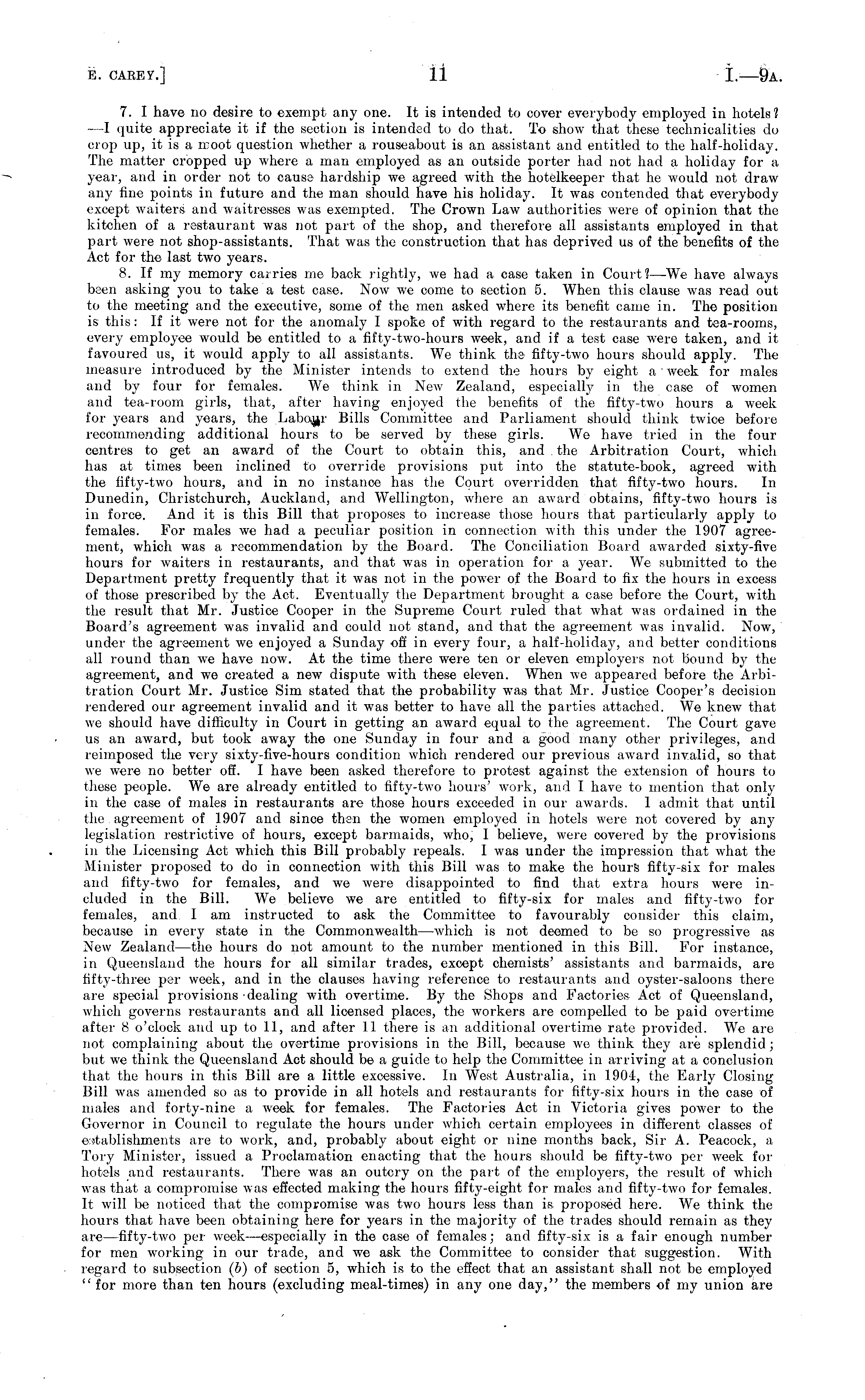 7. I have no desire to exempt any one. It is intended to cover everybody employed in hotels? —I quite appreciate it if the section is intended to do that. To show that these technicalities do ciop up, it is a moot question whether a rouseabout is an assistant and entitled to the half-holiday. The matter cropped up where a man employed as an outside porter had not had a holiday for a year, and in order not to cause hardship we agreed with the hotelkeeper that he would not draw any fine points in future and the man should have his holiday. It was contended that everybody except waiters and waitresses was exempted. The Crown Law authorities were of opinion that the kitchen of a restaurant was not part of the shop, and therefore all assistants employed in that part were not shop-assistants. That was the construction that has deprived us of the benefits of the Act for the last two years. 8. If my memory carries me back rightly, we had a case taken in Court?—We have always been asking you to take a test case. Now we come to section 5. When this clause was read out to the meeting and the executive, some of the men asked where its benefit came in. The position is this: If it were not for the anomaly I spoke of with regard to the restaurants and tea-rooms, every employee would be entitled to a fifty-two-hours week, and if a test case were taken, and it favoured us, it would apply to all assistants. We think the fifty-two hours should apply. The measure introduced by the Minister intends to extend the hours by eight a week for males and by four for females. We think in New Zealand, especially in the case of women and tea-room girls, that, after having enjoyed the benefits of the fifty-two hours a week for years and years, the Labour Bills Committee and Parliament should think twice before recommending additional hours to be served by these girls. We have tried in the four centres to get an award of the Court to obtain this, and the Arbitration Court, which has at times been inclined to override provisions put into the statute-book, agreed with the fifty-two hours, and in no instance has the Court overridden that fifty-two hours. In Dunedin, Christchurch, Auckland, and Wellington, yvhere an award obtains, fifty-two hours is in force. And it is this Bill that proposes to increase those hours that particularly apply to females. For males we had a peculiar position in connection with this under the 1907 agreement, which was a recommendation by the Board. The Conciliation Board awarded sixty-five hours for waiters in restaurants, and that was in operation for a year. We submitted to the Department pretty frequently that it was not in the power of the Board to fix the hours in excess of those prescribed by the Act. Eventually the Department brought a case before the Court, with the result that Mr. Justice Cooper in the Supreme Court ruled that what was ordained in the Board's agreement was invalid and could not stand, and that the agreement yvas invalid. Now, under the agreement we enjoyed a Sunday off in every four, a half-holiday, and better conditions all round than we have now. At the time there were ten or eleven employers not bound by the agreement, and we created a new dispute with these eleven. When we appeared before the Arbitration Court Mr. Justice Sim stated that the probability was that Mr. Justice Cooper's decision rendered our agreement invalid and it was better to have all the parties attached. We knew that we should have difficulty in Court in getting an award equal to the agreement. The Court gave us an award, but took away the one Sunday in four and a good many other privileges, and reimposed the very sixty-five-hours condition which rendered our previous award invalid, so that we were no better off. I have been asked therefore to protest against the extension of hours to these people. We are already entitled to fifty-two hours' work, and I have to mention that only in the case of males in restaurants are those hours exceeded in our awards. 1 admit that until the agreement of 1907 and since then the women employed in hotels yvere not covered by any legislation restrictive of hours, except barmaids, who, I believe, were covered by the provisions in the Licensing Act which this Bill probably repeals. I was under the impression that what the Minister proposed to do in connection with this Bill was to make the hours fifty-six for males and fifty-two for females, and wo were disappointed to find that extra hours were included in the Bill. We believe we are entitled to fifty-six for males and fifty-two for females, and I am instructed to ask the Committee to favourably consider this claim, because in every state in the Commonwealth—which is not deemed to be so progressive as New Zealand—the hours do not amount to the number mentioned in this Bill. For instance, in Queensland the hours for all similar trades, except chemists' assistants and barmaids, are fifty-three per week, and in the clauses having reference to restaurants and oyster-saloons there are special provisions-dealing with overtime. By the Shops and Factories Act of Queensland, which governs restaurants and all licensed places, the workers are compelled to be paid overtime after 8 o'clock and up to 11, and after 11 there is an additional overtime rate provided. We are not complaining about the overtime provisions in the Bill, because we think they are splendid; but we think the Queensland Act should be a guide to help the Committee in arriving at a conclusion that the hours in this Bill are a little excessive. In West Australia, in 1904, the Early ClosingBill was amended so as to provide in all hotels and restaurants for fifty-six hours in the case of males and forty-nine a week for females. The Factories Act in Victoria gives power to the Governor in Council to regulate the hours under which certain employees in different classes of establishments are to work, and, probably about eight or nine months back, Sir A. Peacoc