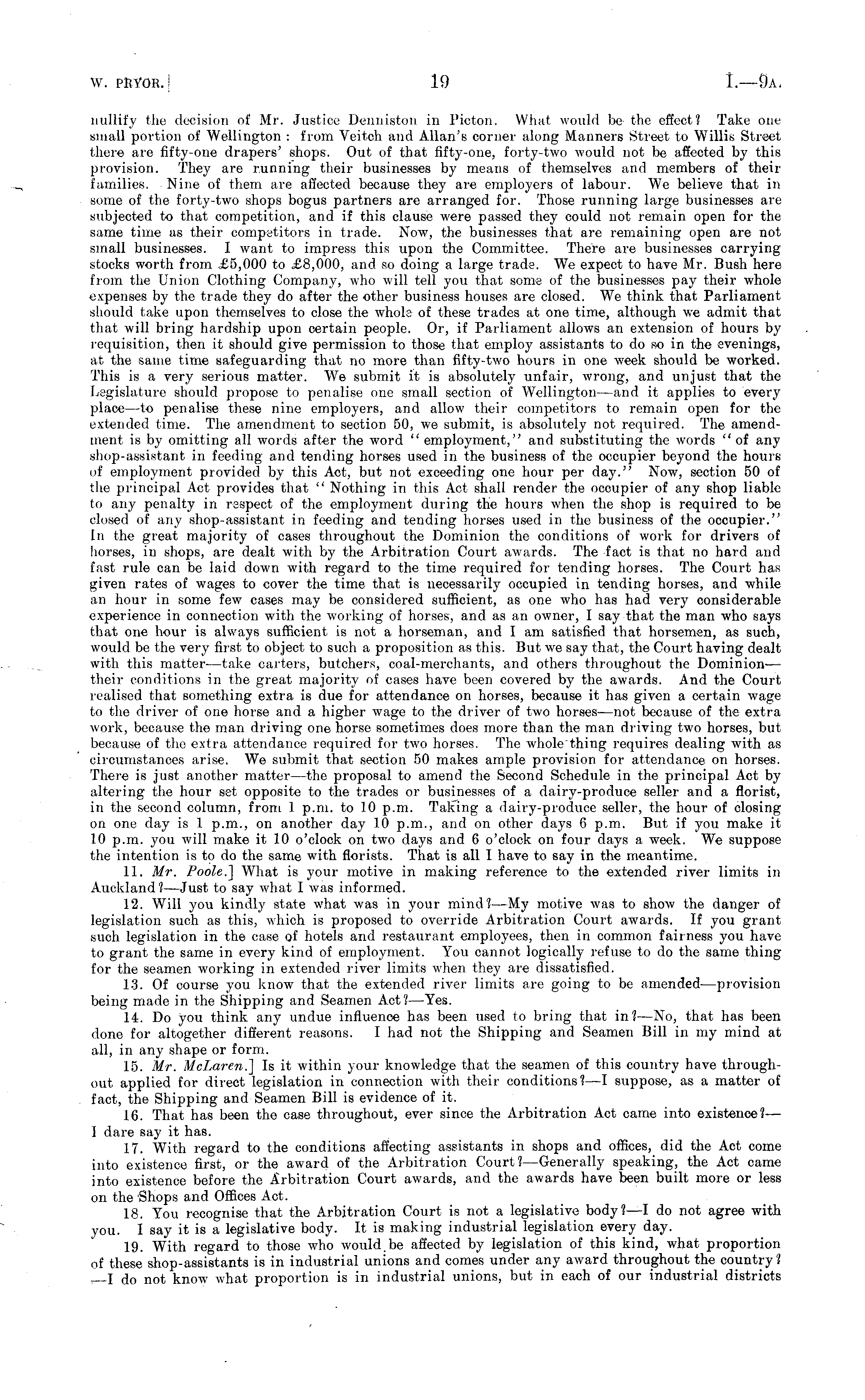 nullify the decision of Mr. Justice Denniston in Picton. What would be the effect? Take one small portion of Wellington : from Veitch and Allan's corner along Manners Street to Willis Street there are fifty-one drapers' shops. Out of that fifty-one, forty-two would not be affected by this provision. They are running their businesses by means of themselves and members of their families. Nine of them are affected because they are employers of labour. We believe that in some of the forty-two shops bogus partners are arranged for. Those running large businesses are subjected to that competition, and if this clause were passed they could not remain open for the same time as their competitors in trade. Now, the businesses that are remaining open are not small businesses. I want to impress this upon the Committee. There are businesses carrying stocks worth from £5,000 to £8,000, and so doing a large trade. We expect to have Mr. Bush here from the Union Clothing Company, who will tell you that some of the businesses pay their whole expenses by the trade they do after the other business houses are closed. We think that Parliament should take upon themselves to close the whole of these trades at one time, although yve admit that that will bring hardship upon certain people. Or, if Parliament allows an extension of hours by requisition, then it should give permission to those that employ assistants to do so in the evenings, at the same time safeguarding that no more than fifty-two hours in one week should be worked. This is a very serious matter. We submit it is absolutely unfair, wrong, and unjust that the Legislature should propose to penalise one small section of Wellington—and it applies to every place—to penalise these nine employers, and allow their competitors to remain open for the extended time. The amendment to section 50, we submit, is absolutely not required. The amendment is by omitting all words after the word " employment," and substituting the words " of any shop-assistant in feeding and tending horses used in the business of the occupier beyond the hours of employment provided by this Act, but not exceeding one hour per day." Now, section 50 of the principal Act provides that " Nothing in this Act shall render the occupier of any shop liable to any penalty in respect of the employment during the hours when the shop is required to be closed of any shop-assistant in feeding and tending horses used in the business of the occupier." In the great majority of cases throughout the Dominion the conditions of work for drivers of horses, in shops, are dealt with by the Arbitration Court ayvards. The fact is that no hard and fast rule can be laid down with regard to the time required for tending horses. The Court has given rates of wages to cover the time that is necessarily occupied in tending horses, and while an hour in some few cases may be considered sufficient, as one who has had very considerable experience in connection with the working of horses, and as an owner, I say that the man who says that one hour is always sufficient is not a horseman, and I am satisfied that horsemen, as such, would be the very first to object to such a proposition as this. But we say that, the Court having dealt with this matter —take carters, butchers, coal-merchants, and others throughout the Dominion — their conditions in the great majority of cases have been covered by the awards. And the Court realised that something extra is due for attendance on horses, because it has given a certain wage to the driver of one horse and a higher wage to the driver of two horses —not because of the extra work, because the man driving one horse sometimes does more than the man driving two horses, but because of the extra attendance required for two horses. The whole thing requires dealing with as circumstances arise. We submit that section 50 makes ample provision for attendance on horses. There is just another matter —the proposal to amend the Second Schedule in the principal Act by altering the hour set opposite to the trades or businesses of a dairy-produce seller and a florist, in the second column, from 1 p.m. to 10 p.m. Taking a dairy-produce seller, the hour of closing on one day is 1 p.m., on another day 10 p.m., and on other days 6 p.m. But if you make it 10 p.m. you will make it 10 o'clock on two days and 6 o'clock on four days a week. We suppose the intention is to do the same with florists. That is all I have to say in the meantime. 11. Mr. Poole.] What is your motive in making reference to the extended river limits in Auckland?— Just to say what I was informed. 12. Will you kindly state what was in your mind?—My motive was to show the danger of legislation such as this, which is proposed to override Arbitration Court ayvards. If you grant such legislation in the case of hotels and restaurant employees, then in common fairness you have to grant the same in every kind of employment. You cannot logically refuse to do the same thing for the seamen working in extended river limits when they are dissatisfied. 13. Of course you know that the extended river limits are going to be amended —provision being made in the Shipping and Seamen Act? —Yes. 14. Do you think any undue influence has been used to bring that in? —No, that has been done for altogether different reasons. I had not the Shipping and Seamen Bill in my mind at all, in any shape or form. 15. Mr. McLxiren.] Is it within your knowledge that the seamen of this country have throughout applied for direct legislation in connection with their conditions? —I suppose, as a matter of fact, the Shipping and Seamen Bill is evidence of it. 16. That has been the case throughout, ever since the Arbitration Act came into existence?— I dare say it has. 17. With regard to the conditions affecting assistants in shops and offices, did the Act come into existence first, or the award of the Arbitration Court? —Generally speaking, the Act came in