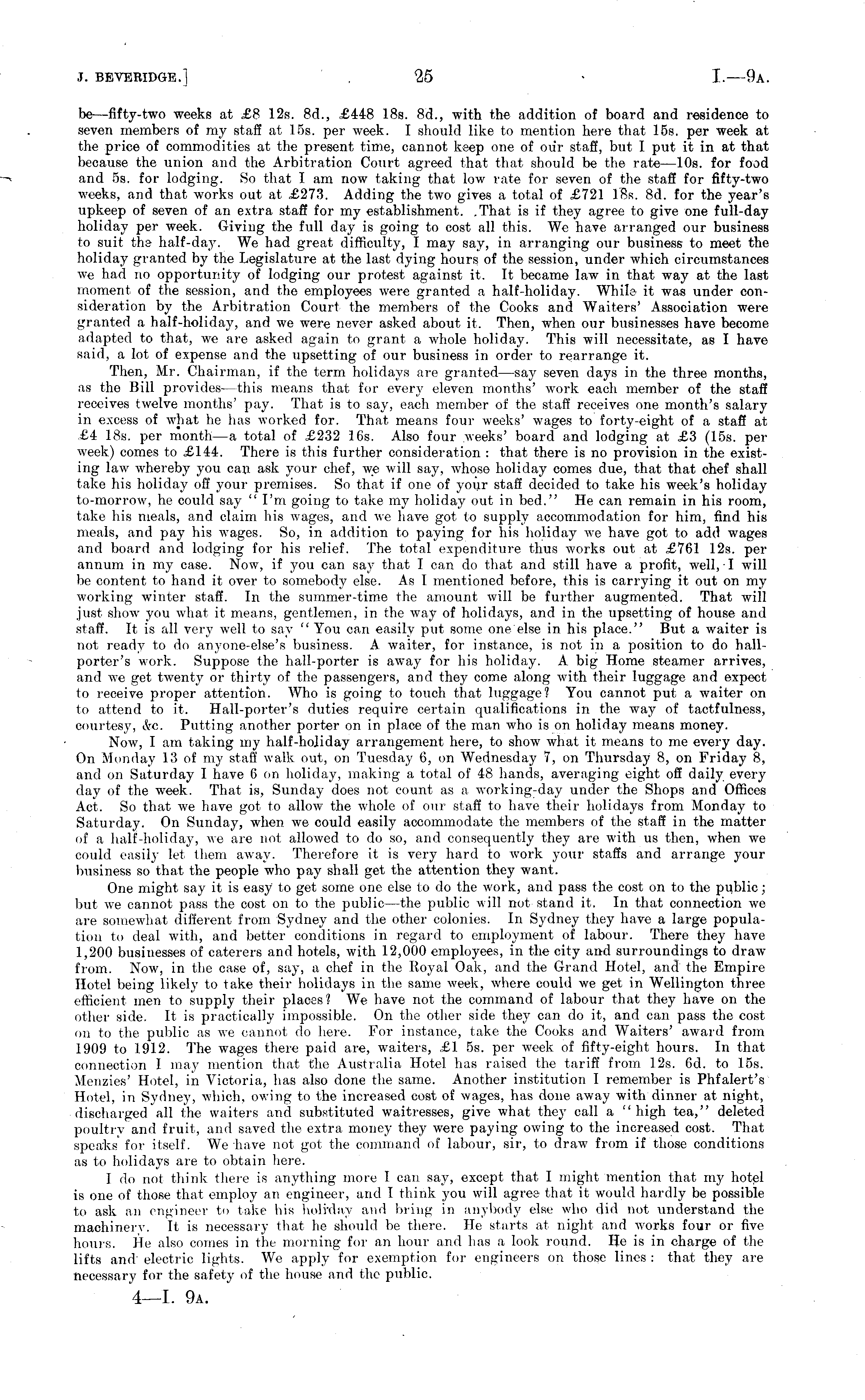 be —fifty-two weeks at £8 12s. Bd., £448 18s. Bd., with the addition of board and residence to seven members of my staff at 15s. per week. I should like to mention here that 15s. per week at the price of commodities at the present time, cannot keep one of our staff, but I put it in at that because the union and the Arbitration Court agreed that that should be the rate —10s. for food and ss. for lodging. So that I am now taking that low rate for seven of the staff for fifty-two weeks, and that works out at £273. Adding the two gives a total of £721 18s. Bd. for the year's upkeep of seven of an extra .staff for my establishment. That is if they agree to give one full-day holiday per week. Giving the full day is going to cost all this. We have arranged our business to suit the half-day. We had great difficulty, I may say, in arranging our business to meet the holiday granted by the Legislature at the last dying hours of the session, under yvhich circumstances we had no opportunity of lodging our protest against it. It became law in that way at the last moment of the session, and the employees were granted a half-holiday. While it was under consideration by the Arbitration Court the members of the Cooks and Waiters' Association were granted a half-holiday, and we were never asked about it. Then, when our businesses have become adapted to that, yve are asked again to grant a whole holiday. This will necessitate, as I have said, a lot of expense and the upsetting of our business in order to rearrange it. Then, Mr. Chairman, if the term holidays are granted—say seven days in the three months, as the Bill provides--this means that for every eleven months' work each member of the staff receives twelve months' pay. That is to say, each member of the staff receives one month's salary in excess of what he has worked for. That means four yveeks' wages to forty-eight of a staff at £4 18s. per month—a total of £232 16s. Also four weeks' board and lodging at £3 (15s. per week) comes to £144. There is this further consideration : that there is no provision in the existing law whereby you can ask your chef, we will say, whose holiday comes due, that that chef shall take his holiday off your premises. So that if one of your staff decided to take his week's holiday to-morrow, he could say " I'm going to take my holiday out in bed." He can remain in his room, take his meals, and claim his yvages, and yve have got to supply accommodation for him, find his meals, and pay his wages. So, in addition to paying for his holiday yve have got to add wages and board and lodging for his relief. The total expenditure thus works out at £761 12s. per annum in my case. Now, if you can say that I can do that and still have a profit, well, I will be content to hand it over to somebody else. As I mentioned before, this is carrying it out on my working winter staff. In the summer-time the amount will be further augmented. That will just show you what it means, gentlemen, in the way of holidays, and in the upsetting of house and staff. It is all very well to say " You can easily put some one else in his place." But a waiter is not ready to do anyone-else's business. A waiter, for instance, is not in a position to do hallporter's work. Suppose the hall-porter is away for his holiday. A big Home steamer arrives, and yve get twenty or thirty of the passengers, and they come along with their luggage and expect to receive proper attention. Who is going to touch that luggage? You cannot put a waiter on to attend to it. Hall-porter's duties require certain qualifications in the way of tactfulness, courtesy, il*e. Putting another porter on in place of the man who is on holiday means money. Now, I am taking my half-holiday arrangement here, to show what it means to me every day. On Monday 13 of my staff walk out, on Tuesday 6, on Wednesday 7, on Thursday 8, on Friday 8, and on Saturday I have 6 on holiday, making a total of 48 hands, averaging eight off daily every da\ r of the week. That is, Sunday does not count as a working-day under the Shops and Offices Act. So that we have got to allow the whole of our staff to have their holidays from Monday to Saturday. On Sunday, when we could easily accommodate the members of the staff in the matter of a half-holiday, we are not allowed to do so, and consequently they are with us then, when we could easily let them away. Therefore it is very hard to work your staffs and arrange your business so that the people who pay shall get the attention they want. One might say it is easy to get some one else to do the work, and pass the cost on to the public; but yve cannot pass the cost on to the public —the public will not stand it. In that connection we are somewhat different from Sydney and the other colonies. In Sydney they have a large population to deal with, and better conditions in regard to employment of labour. There they have 1,200 businesses of caterers and hotels, with 12,000 employees, in the city and surroundings to draw from. Now, in the case of, say, a chef in the Royal Oak, and the Grand Hotel, and the Empire Hotel being likely to take their holidays in the same week, where could we get in Wellington three efficient men to supply their places? We have not the command of labour that they have on the other side. It is practically impossible. On the other side they can do it, and can pass the cost on to the public as yve cannot do here. For instance, lake the Cooks and Waiters' award from 1909 to 1912. The yvages there paid are, waiters, £1 ss. per week of fifty-eight hours. In that connection I may mention that the Australia Hotel has raised the tariff from 12s. 6d. to 15s. Menzies' Hotel, in Victoria, has also done the same. Another institution I remember is Phfalert's Hotel, in Sydney, which, owing to the increased cost of yvages, has done away with dinner at night, discharged all the waiters and substituted waitresses, give what they call a " high tea," deleted pou
