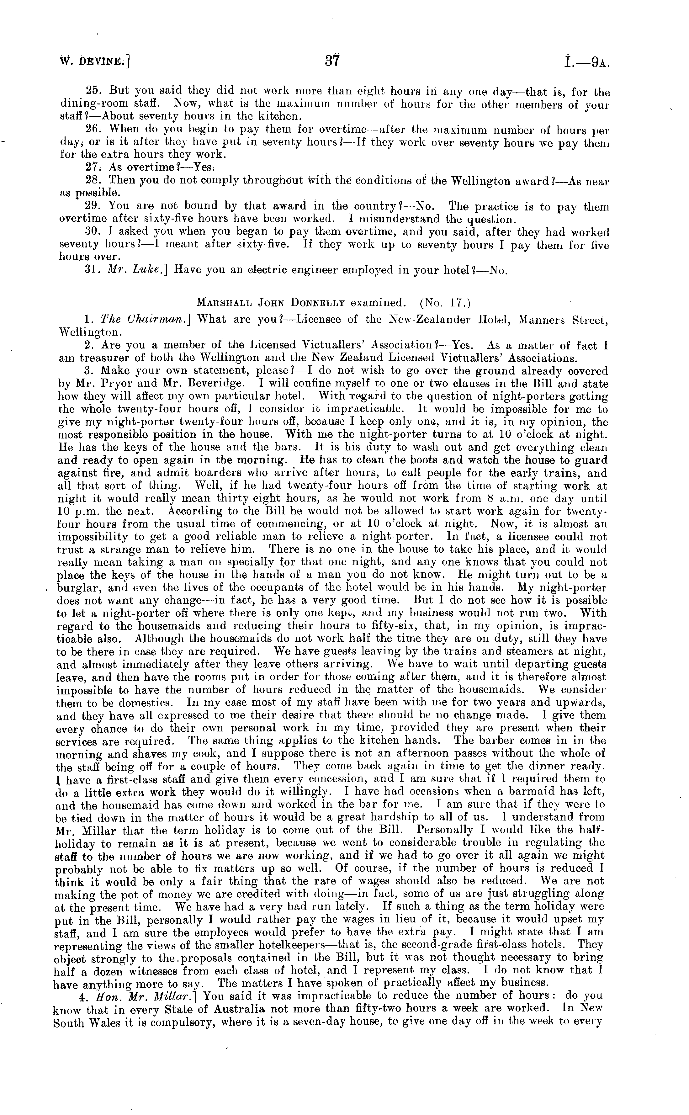 25. But you said they did not work more than eight hours in any one day—that is, for the dining-room staff. Now, what is the maximum number of hours for the other members of your staff? —About seventy hours in the kitchen. 26. When do you begin to pay them for overtime—after the maximum number of hours per day* or is it after they have put in seventy hours? —If they work over seventy hours we pay them for the extra hours they work. 27. As overtime?— Yes. 28. Then you do not comply throughout with the Conditions of the Wellington award?—As near as possible. 29. You are not bound by that award in the country?— No. The practice is to pay them overtime after sixty-five hours have been worked. I misunderstand the question. 30. I asked you when you began to pay them overtime, and you said, after they had worked seventy hours? —I meant after sixty-five. If they work up to seventy hours I pay them for five hours over. 31. Mr. Luke.] Have you an electric engineer employed in your hotel? —No. Marshall John Donnelly examined. (No. 17.) 1. The Chairman.] What are you? —.Licensee of the New-Zealander Hotel, Manners Street, Wellington. 2. Are you a member of the Licensed Victuallers' Association?— Yes. As a matter of fact I am treasurer of both the Wellington and the New Zealand Licensed Victuallers' Associations. 3. Make your own statement, please?—l do not wish to go over the ground already covered by Mr. Pryor and Mr. Beveridge. 1 will confine myself to one or two clauses in the Bill and state how they will affect my own particular hotel. With regard to the question of night-porters getting the whole twenty-four hours off, 1 consider it impracticable. It would be impossible for mc to give my night-porter tyventy-four hours off, because 1 keep only one, and it is, in my opinion, the most responsible position in the house. With me the night-porter turns to at 10 o'clock at night. He has the keys of the house and the bars. It is his duty to wash out and get everything clean and ready to open again in the morning. He has to clean the boots and watch the house to guard against fire, and admit boarders who arrive after hours, to call people for the early trains, and all that sort of thing. Well, if he had twenty-four hours off from the time of starting work at night it would really mean thirty-eight hours, as he would not work from 8 a.m. one day until 10 p.m. the next. According to the Bill he would not be allowed to start work again for twentyfour hours from the usual time of commencing, or at 10 o'clock at night. Now, it is almost an impossibility to get a good reliable man to relieve a night-porter. In fact, a licensee could not trust a strange man to relieve him. There is no one in the house to take his place, and it would really mean taking a man on specially for that one night, and any one knows that you could not place the keys of the house in the hands of a man you do not know. He might turn out to be a burglar, and even the lives of the occupants of the hotel would be in his hands. My night-porter does not want any change—in fact, he has a very good time. But Ido not .see how it is possible to let a night-porter off where there is only one kept, and my business would not run two. With regard to the housemaids and reducing their hours to fifty-six, that, in my opinion, is impracticable also. Although the housemaids do not work half the time they are on duty, still they have to be there in case they are required. We have guests leaving by the trains and steamers at night, and almost immediately after they leave others arriving. We have to wait until departing guests leave, and then have the rooms put in order for those coming after them, and it is therefore almost impossible to have the number of hours reduced in the matter of the housemaids. We consider them to be domestics. In my case most of my staff have been with me for two years and upwards, and they have all expressed to me their desire that there should be no change made. I give them every chance to do their own personal work in my time, provided they are present when their services are required. The same thing applies to the kitchen hands. The barber comes in in the morning and shaves my cook, and I suppose there is not an afternoon passes without the whole of the staff being off for a couple of hours. They come back again in time to get the dinner ready. I have a first-class staff and give them every concession, and I am sure that if I required them to do a little extra work they would do it willingly. I have had occasions when a barmaid has left, and the housemaid has come down and worked in the bar for me. lam sure that if they were to be tied down in the matter of hours it would be a great hardship to all of us. 1 understand from Mr. Millar that the term holiday is to come out of the Bill. Personally I yvould like the halfholiday to remain as it is at present, because we went to considerable trouble in regulating the staff to the number of hours we are now working, and if we had to go over it all again yve might probably not be able to fix matters up so well. Of course, if the number of hours is reduced I think it would be only a fair thing that the rate of wages should also be reduced. We are not making the pot of money we are credited yvith doing—in fact, some of us are just struggling along at the present time. We have had a very bad run lately. If such a thing as the term holiday were put in the Bill, personally I would rather pay the yvages in lieu of it, because it would upset my staff, and lam sure the employees would prefer to have the extra pay. I might state that I am representing the views of the smaller hotelkeepers- -that is, the second-grade first-class hotels. They object strongly to the.proposals contained in the Bill, but it was not thought necessary to bring half a dozen witnesses from each class of hotel, and I represent my class. I do not know that I have anything more to say. The matte