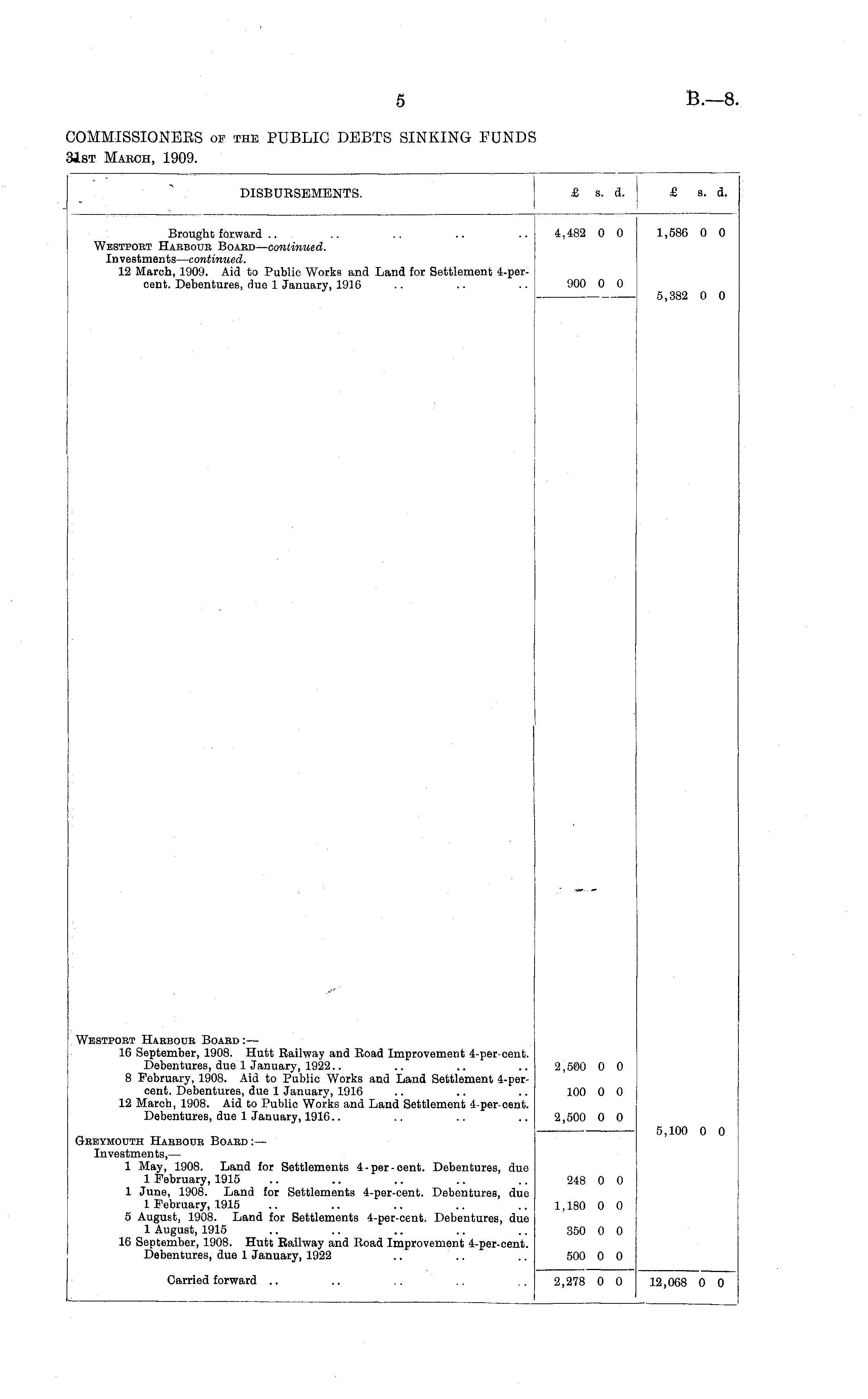 DISBURSEMENTS. £ s. d. £ s. d. Brought forward Westport Harbour Board— continued. Investments— continued. 12 March, 1909. Aid to Public Works and Land for Settlement 4-per-cent. Debentures, due 1 January, 1916 4,482 0 0 1,586 0 0 900 0 0 5,382 0 0 .. Westport Harbour Board :— 16 September, 1908. Hutt Railway and Road Improvement 4-per-cent. Debentures, due 1 January, 1922.. 8 February, 1908. Aid to Public Works and Land Settlement 4-per-cent. Debentures, due 1 January, 1916 12 March, 1908. Aid to Public Works and Land Settlement 4-per-cent. Debentures, due 1 January, 1916.. 2,500 0 0 100 0 0 2,500 0 0 Greymouth Harbour Board:— Investments, — 1 May, 1908. Land for Settlements 4-per-oent. Debentures, due 1 February, 1915 1 June, 1908. Land for Settlements 4-per-cent. Debentures, due 1 February, 1915 5 August, 1908. Land for Settlements 4-per-cent. Debentures, due 1 August, 1915 16 September, 1908. Hutt Railway and Road Improvement 4-per-cent. Debentures, due 1 January, 1922 .. 5,100 0 0 248 0 0 1,180 0 0 350 0 0 500 0 0 Carried forward 2,278 0 0 12,068 0 0