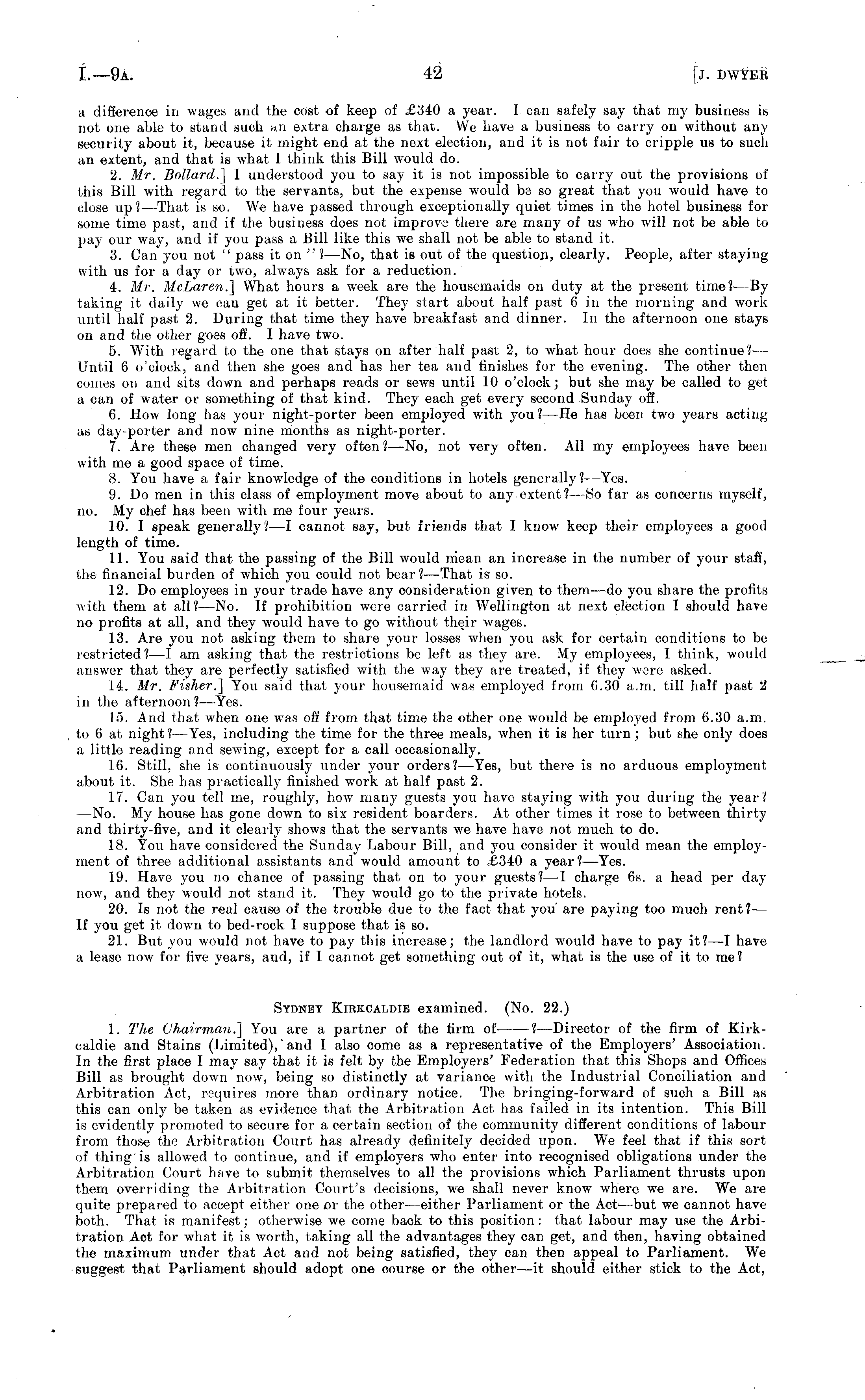 a difference in wages and the cost of keep of £340 a year. 1 can safely say that my business is not one able to stand such w.n extra charge as that. We have a business to carry on without any security about it, because it might end at the next election, and it is not fair to cripple us to such an extent, and that is what I think this Bill would do. 2. Mr. Bollard.] I understood you to say it is not impossible to carry out the provisions of this Bill with regard to the servants, but the expense would be so great that you yvould have to close up?— That is so. We have passed through exceptionally quiet times in the hotel business for some time past, and if the business does not improve there are many of us who will not be able to pay our way, and if you pass a Bill like this we shall not be able to stand it. 3. Can you not " pass it on " ?—No, that is out of the question, clearly. People, after staying with us for a day or two, always ask for a reduction. 4. Mr. McLaren.] What hours a week are the housemaids on duty at the present time? —By taking it daily we can get at it better. They start about half past 6 in the morning and work until half past 2. During that time they have breakfast and dinner. In the afternoon one stays on and the other goes off. I have two. 5. With regard to the one that stays on after half past 2, to what hour does she continue? — Until 6 o'clock, and then she goes and has her tea and finishes for the evening. The other then conies on and sits down and perhaps reads or seyvs until 10 o'clock; but she may be called to get a can of water or something of that kind. They each get every second Sunday off. 6. How long has your night-porter been employed with you?—He has been two years acting as day-porter and now nine months as night-porter. 7. Are these men changed very often? —No, not very often. All my employees have been with me a good space of time. 8. You have a fair knowledge of the conditions in hotels generally? —Yes. 9. Do men in this class of employment move about to'any extent? —So far as concerns myself, no. My chef has been with me four years. 10. I speak generally?—l cannot say, hut friends that I know keep their employees a good length of time. 11. You said that the passing of the Bill would mean an increase in the number of your staff, the financial burden of which you could not bear? —That is so. 12. Do employees in your trade have any consideration given to them—do you share the profits with them at all?— No. If prohibition were carried in Wellington at next election I should have no profits at all, and they would have to go without their yvages. 13. Are you not asking them to share your losses when you ask for certain conditions to be restricted? —I am asking that the restrictions be left as they are. My employees, 1 think, would answer that they are perfectly satisfied with the way they are treated, if they were asked. 14. Mr. Fisher.] You said that your housemaid was employed from 6.30 a.m. till half past 2 in the afternoon?— Yes. 15. And that when one was off from that time the other one would be employed from 6.30 a.m. to 6at night?— Yes, including the time for the three meals, when it is her turn; but she only does a little reading and sewing, except for a call occasionally. 16. Still, she is continuously under your orders?— Yes, but there is no arduous employment about it. She has practically finished work at half past 2. 17. Can you tell me, roughly, how many guests you have staying with you during the year/ —No. My house has gone down to six resident boarders. At other times it rose to between thirty and thirty-five, and it clearly shows that the servants we have have not much to do. 18. You have considered the Sunday Labour Bill, and you consider it would mean the employment of three additional assistants and would amount to £340 a year?— Yes. 19. Have you no chance of passing that on to your guests?—l charge 6s. a head per day now, and they would not stand it. They would go to the private hotels. 20. Is not the real cause of the trouble due to the fact that you' are paying too much rent?— If you get it down to bed-rock I suppose that is so. 21. But you would not have to pay this increase; the landlord yvould have to pay it?—l have a lease now for five years, and, if I cannot get something out of it, what is the use of it to me? Sydney Kirkcaldie examined. (No. 22.) 1. The Chairman.] You are a partner of the firm of ?—Director of the firm of Kirkcaldie and Stains (Limited),' and I also come as a representative of the Employers' Association. In the first place 1 may say that it is felt by the Employers' Federation that this Shops and Offices Bill as brought down now, being so distinctly at variance with the Industrial Conciliation and Arbitration Act, requires more than ordinary notice. The bringing-forward of such a Bill as this can only be taken as evidence that the Arbitration Act has failed in its intention. This Bill is evidently promoted to secure for a certain section of the community different conditions of labour from those the Arbitration Court has already definitely decided upon. We feel that if this sort of thing'is allowed to continue, and if employers who enter into recognised obligations under the Arbitration Court have to submit themselves to all the provisions which Parliament thrusts upon them overriding the Arbitration Court's decisions, we shall never know yvhere we are. We are quite prepared to accept either one or the other—either Parliament or the Act- —but we cannot have both. That is manifest; otherwise we come back to this position: that labour may use the Arbitration Act for what it is worth, taking all the advantages they can get, and then, having obtained the maximum under that Act and not being satisfied, they can then appeal to Parliament. We suggest that Parliament should adopt one course or the other—it should either stick to the Act,