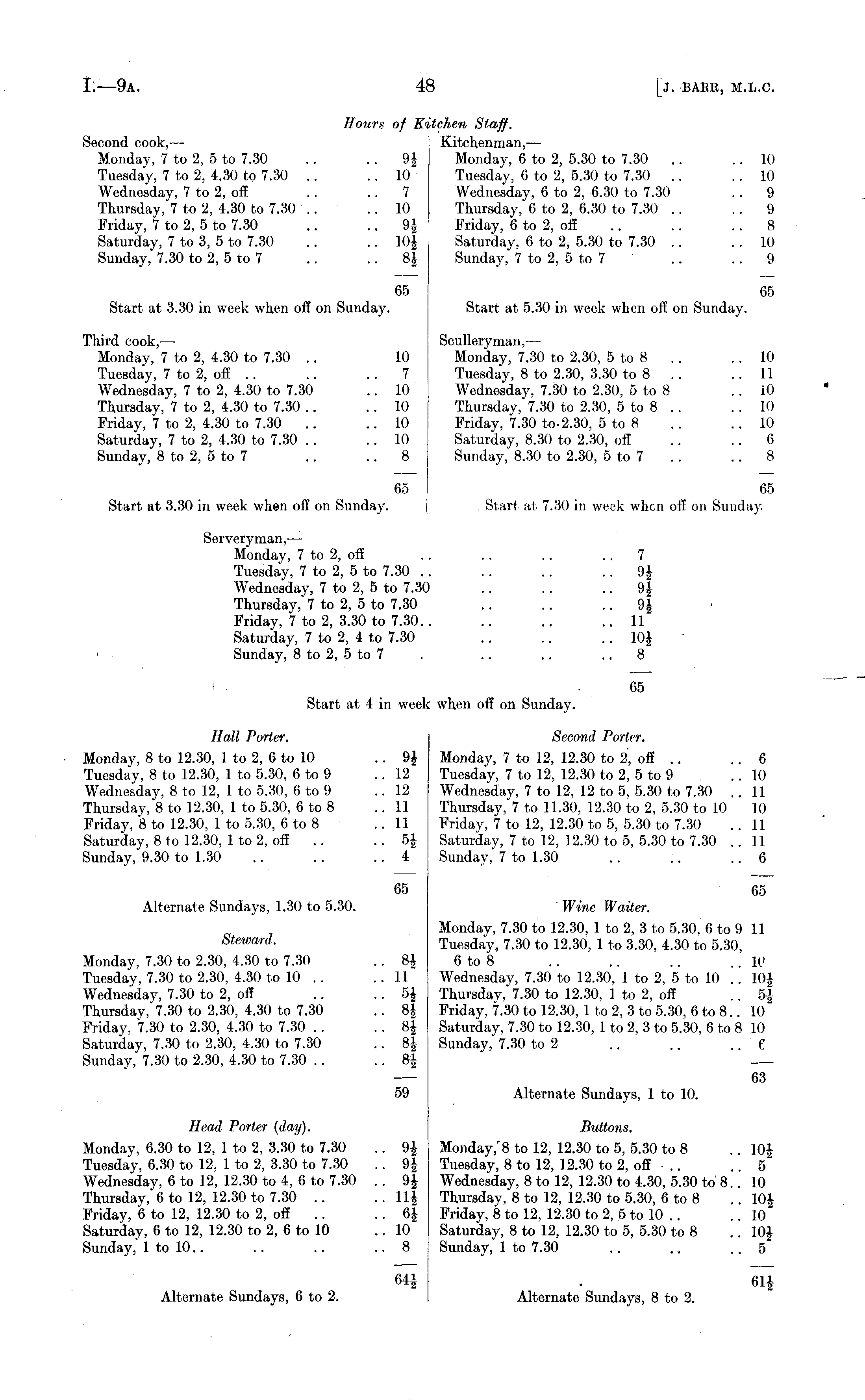 Hours of Kitchen Staff. Second cook, — Kitchenman, — Monday, 7t02, 5 to 7.30 .. .. 9$ Monday, 6to 2, 5.30 to 7.30 .. .. 10 Tuesday, 7to 2, 4.30 to 7.30 . . .. 10 Tuesday, 6to 2, 5.30 to 7.30 .. .. 10 Wednesday, 7to 2, off .. .. 7 Wednesday, 6to 2, 6.30 to 7.30 .. 9 Thursday, 7to 2, 4.30 to 7.30 .. .. 10 Thursday, 6to 2, 6.30 to 7.30 .. .. 9 Friday, 7t02, 5 to 7.30 .. .. 9$ Friday, 6to 2, off .. .. .. 8 Saturday, 7t03, 5 to 7.30 .. .. 10$ Saturday, 6to 2, 5.30 to 7.30 .. .. 10 Sunday, 7.30 to 2, sto 7 .. .. 8$ Sunday, 7t02,5 to 7 .. .. 9 65 65 Start at 3.30 in week when off on Sunday. Start at 5.30 in week when off on Sunday. Third cook, — Sculleryman,— Monday, 7to 2, 4.30 to 7.30 .. 10 Monday, 7.30 to 2.30, sto 8 .. .. 10 Tuesday, 7to 2, off .. .. .. 7 Tuesday, Bto 2.30, 3.30 to 8 .. .. 11 Wednesday, 7to 2, 4.30 to 7.30 .. 10 Wednesday, 7.30 to 2.30, sto 8 .. 10 Thursday, 7to 2, 4.30 to 7.30 .. .. 10 Thursday, 7.30 to 2.30, sto 8 .. .. 10 Friday, 7to 2, 4.30 to 7.30 .. .. 10 Friday, 7.30 to-2.30, sto 8 .. .. 10 Saturday, 7to 2, 4.30 to 7.30 .. .. 10 Saturday, 8.30 to 2.30, off .. .. 6 Sunday, 8t02,5 to 7 .. .. 8 Sunday, 8.30 to 2.30, sto 7 .. .. 8 65 65 Start at 3.30 in week when off on Sunday. Start at 7.30 in week when off on Sunday Serveryman, — Monday, 7to 2, off .. .. .. .. 7 Tuesday, 7t02, 5 to 7.30 .. .. .. ~ ,9$ Wednesday, 7t02, 5 to 7.30 .. . . 9$ Thursday, 7t02, 5 to 7.30 .. .. .. 9$ Friday, 7to 2, 3.30 to 7.30.. .. .. .. 11 Saturday, 7t02, 4 to 7.30 .. .. .. 10$ Sunday, 8t02,5 to 7 . .. .. .. 8 i . .65 Start at 4 in week when off on Sunday. Hall Porter. Second Porter. Monday, Bto 12.30, 1t02,6 to 10 .. 9$ Monday, 7to 12, 12.30 to 2, off .. .. 6 Tuesday, Bto 12.30, Ito 5.30, 6to 9 ..12 Tuesday, 7to 12, 12.30 to 2, sto 9 ..10 Wednesday, Bto 12, Ito 5.30, 6to 9 .. 12 Wednesday, 7to 12, 12 to 5, 5.30 to 7.30 .. 11 Thursday, Bto 12.30, Ito 5.30, 6to 8 ..11 Thursday, 7to 11.30, 12.30 to 2, 5.30 to 10 10 Friday, Bto 12.30, Ito 5.30, 6to 8 ..11 Friday, 7to 12, 12.30 to 5, 5.30 to 7.30 ..11 Saturday, Bto 12.30, Ito 2, off .. .. 5$ Saturday, 7to 12, 12..30 to 5, 5.30 to 7.30 .. 11 Sunday, 9.30 to 1.30 .. .. .. 4 Sunday, 7to 1.30 .. .. .. 6 65 65 Alternate Sundays, 1.30 to 5.30. Wine Waiter. Monday, 7.30 to 12.30, 1 to 2, 3 to 5.30, 6 to 9 11 Steward. Tuesday, 7.30 to 12.30, 1 to 3.30, 4.30 to 5.30, Monday, 7.30 to 2.30, 4.30 to 7.30 .. 8$ 6to 8 .. .. .. .. 1(> Tuesday, 7.30 to 2.30, 4.30 to 10 .. .. 11 Wednesday, 7.30 to 12.30, 1t02,5t0 10 .. 10$ Wednesday, 7.30 to 2, off .. .. 5$ Thursday, 7.30 to 12.30, Ito 2, off . . 5$ Thursday," 7.30 to 2.30, 4.30 to 7.30 .. 8$ Friday, 7.30 to 12.30, Ito2, 3 to 5.30, 6to 8.. 10 Friday, 7.30 to 2.30, 4.30 to 7.30 .. .. 8$ Saturday, 7.30 to 12.30, Ito2, 3 to 5.30, 6toB 10 Saturday, 7.30 to 2.30, 4.30 to 7.30 .. 8$ Sunday, 7.30 to 2 .. .. .. c Sunday, 7.30 to 2.30, 4.30 to 7.30 .. .. 8$ 63 59 Alternate Sundays, 1 to 10. Head Porter (day). Buttons. Monday, 6.30 to 12, Ito 2, 3.30 to 7.30 .. 9$ Monday/8 to 12, 12.30 to 5, 5.30 to 8 .. 10$ Tuesday, 6.30 to 12, Ito 2, 3.30 to 7.30 .. 9$ Tuesday, Bto 12, 12.30 to 2, off -.. .. 5 Wednesday, 6to 12, 12.30 to 4, 6to 7.30 .. 9$ Wednesday, Bto 12, 12.30 to 4.30, 5.30 to 8.. 10 Thursday, 6to 12, 12.30 to 7.30 .. .. 11$ Thursday, Bto 12, 12.30 to 5.30, 6to 8 .. 10$ Friday, 6to 12, 12.30 to 2, off .. .. 6$ Friday, Bto 12, 12.30 to 2, stolo .. .. 10 Saturday, 6to 12, 12.30 to 2, 6to 10 .. 10 Saturday, Bto 12, 12.30 to 5, 5.30 to 8.. 10$ Sunday, Ito 10.. .. .. ..8 Sunday, Ito 7.30 .. .. ..5 64$ . 61$ Alternate Sundays, 6 to 2. Alternate Sundays, 8 to 2.