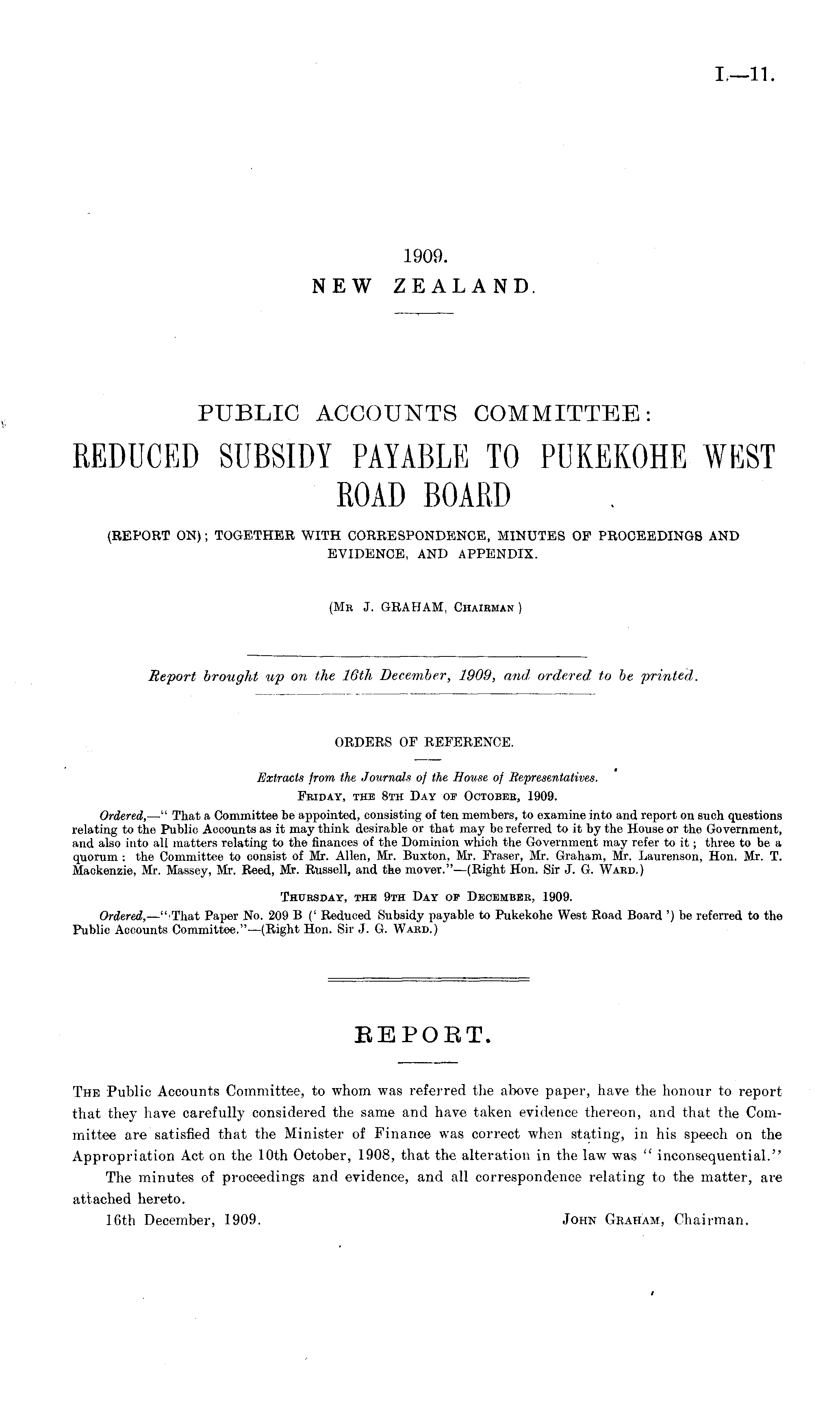 ORDERS OF REFERENCE. Extracts from the Journals of the House of Representatives. Friday, the Bth Day of October, 1909. Ordered, —" That a Committee be appointed, consisting of ten members, to examine into and report on such questions relating to the Public Accounts as it may think desirable or that may be referred to it by the House or the Government, and also into all matters relating to the finances of the Dominion which the Government may refer to it; three to be a quorum : the Committee to consist of Mr. Allen, Mr. Buxton, Mr. Fraser, Mr. Graham, Mr. Laurenson, Hon. Mr. T. Mackenzie, Mr. Massey, Mr. Reed, Mr. Russell, and the mover."—(Right Hon. Sir J. G. Ward.) Thursday, the 9th Day op December, 1909. Ordered, —"'That Paper No. 209 B (' Reduced Subsidy payable to Pukekohe West Road Board ') be referred to the Public Accounts Committee." —(Right Hon. Sir J. G. Ward.)