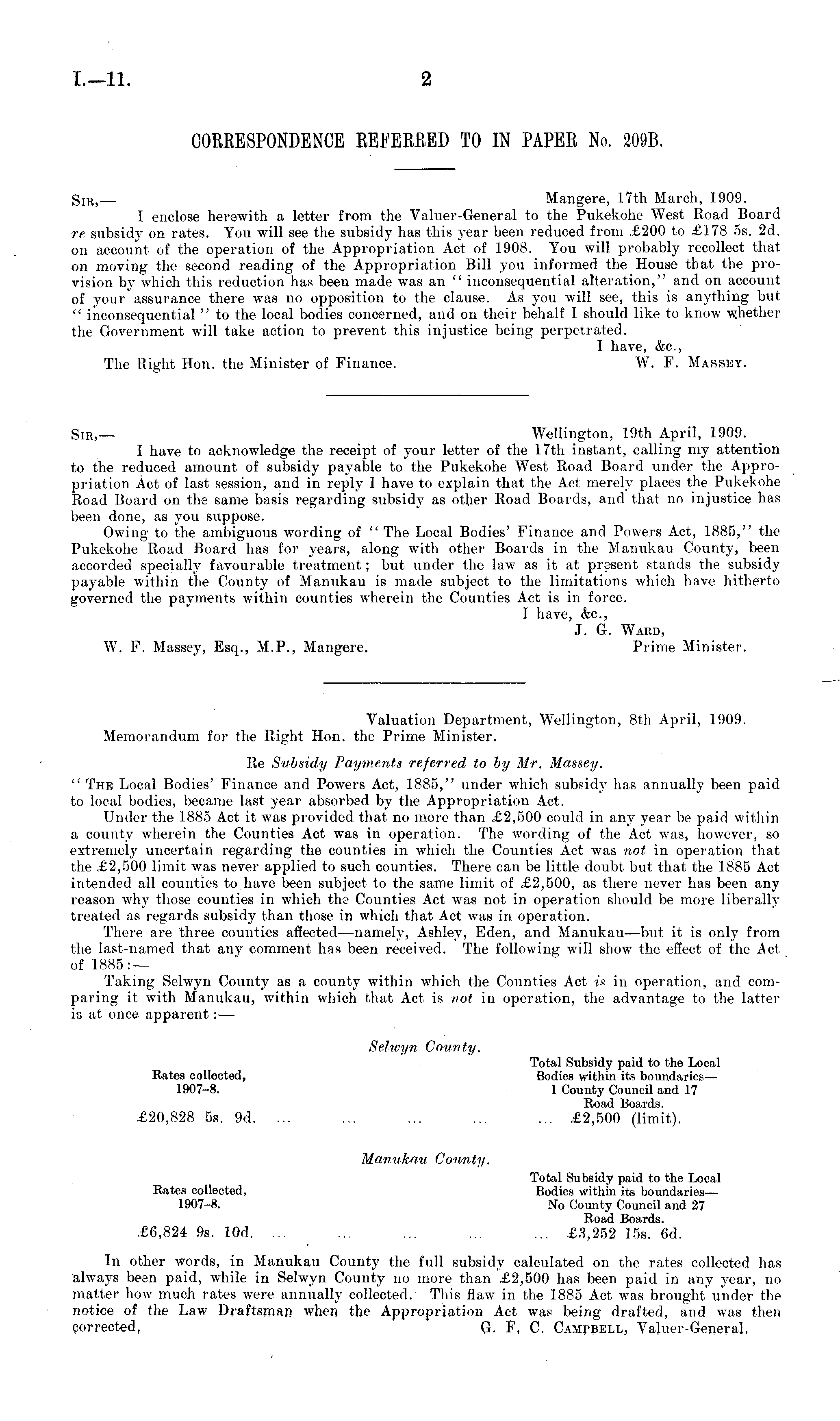 CORRESPONDENCE REEERRED TO IN PAPER No. 2098. Sir, — Mangere, 17th March, 1909. I enclose herewith a letter from the Valuer-General to the Pukekohe West Road Board re subsidy on rates. You will see the subsidy has this year been reduced from £200 to £178 ss. 2d. on account of the operation of the Appropriation Act of 1908. You will probably recollect that on moving the second reading of the Appropriation Bill you informed the House that the provision by which this reduction has been made was an " inconsequential alteration," and on account of your assurance there was no opposition to the clause. As you will see, this is anything but " inconsequential " to the local bodies concerned, and on their behalf I should like to know whether the Government will take action to prevent this injustice being perpetrated. I have, &c, The Right Hon. the Minister of Finance. W. F. Massey. Sir,— Wellington, 19th April, 1909. I have to acknowledge the receipt of your letter of the 17th instant, calling my attention to the reduced amount of subsidy payable to the Pukekohe West Road Board under the Appropriation Act of last session, and in reply I have to explain that the Act merely places the Pukekohe Road Board on the same basis regarding subsidy as other Road Boards, and that no injustice has been done, as you suppose. Owing to the ambiguous wording of " The Local Bodies' Finance and Powers Act, 1885," the Pukekohe Road Board has for years, along with other Boards in the Manukau County, been accorded specially favourable treatment; but under the law as it at present stands the subsidy payable within the Cotinty of Manukau is made subject to the limitations which have hitherto governed the payments within counties wherein the Counties Act is in force. I have, &c, J. G. Ward, W. F. Massey, Esq., M.P., Mangere. Prime Minister. Valuation Department, Wellington, Bth April, 1909. Memorandum for the Right Hon. the Prime Minister. Re Subsidy Payments referred to by Mr. Massey. " The Local Bodies' Finance and Powers Act, 1885," under which subsidy has annually been paid to local bodies, became last year absorbed by the Appropriation Act. Under the 1885 Act it was provided that no more than £2,500 could in any year be paid within a county wherein the Counties Act was in operation. The wording of the Act was, however, so extremely uncertain regarding the counties in which the Counties Act was not in operation that the £2,500 limit was never applied to such counties. There can be little doubt but that the 1885 Act intended all counties to have been subject to the same limit of £2,500, as there never has been any reason why those counties in which the Counties Act was not in operation should be more liberally treated as regards subsidy than those in which that Act was in operation. There are three counties affected—namely, Ashley, Eden, and Manukau—but it is only from the last-named that any comment has been received. The following will show the effect of the Act of 1885: — Taking Selwyn County as a county within which the Counties Act is in operation, and comparing it with Manukau, within which that Act is not in operation, the advantage to the latter is at once apparent:— Selwyn County. Total Subsidy paid to the Local Rates collected, Bodies within its boundaries — 1907-8. 1 County Council and 17 Road Boards. £20,828 ss. 9d. ... ... ... ... ... £2,500 (limit). Maniikan County. Total Subsidy paid to the Local Rates collected, Bodies within its boundaries— 1907-8. No County Council and 27 Road Boards. £0,824 9s. lOd. ... ... ... ... ... £3,252 15s. Gd. In other words, in Manukau County the full subsidy calculated on the rates collected has always been paid, while in Selwyn County no more than £2,500 has been paid in any year, no matter how much rates were annually collected. This flaw in the 1885 Act was brought under the notice of the Law Draftsman when the Appropriation Act was being drafted, and was then corrected, G. F, C. Campbell, Valuer-General.