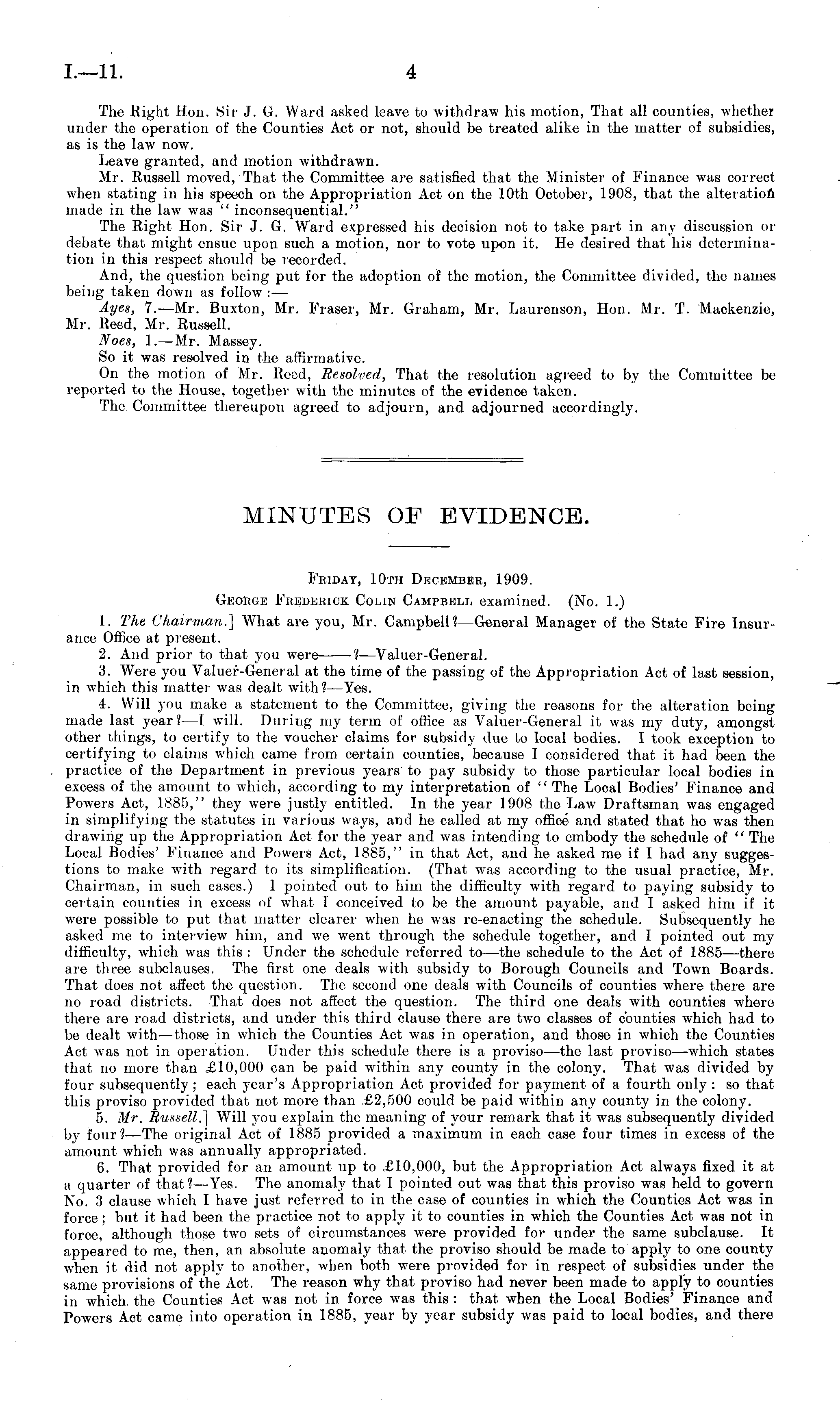 The Right Hon. Sir J. G. Ward asked leave to withdraw his motion, That all counties, whether under the operation of the Counties Act or not, should be treated alike in the matter of subsidies, as is the law now. Leave granted, and motion withdrawn. Mr. Russell moved, That the Committee are satisfied that the Minister of Finance was correct when stating in his speech on the Appropriation Act on the 10th October, 1908, that the alteration made in the law was " inconsequential." The Right Hon. Sir J. G. Ward expressed his decision not to take part in any discussion or debate that might ensue upon such a motion, nor to vote upon it. He desired that his determination in this respect should be recorded. And, the question being put for the adoption of the motion, the Committee divided, the names being taken down as follow : — Ayes, 7.—Mr. Buxton, Mr. Eraser, Mr. Graham, Mr. Laurenson, Hon. Mr. T. Mackenzie, Mr. Reed, Mr. Russell. Noes, I.—Mr. Massey. So it was resolved in the affirmative. On the motion of Mr. Reed, Resolved, That the resolution agreed to by the Committee be reported to the House, together with the minutes of the evidence taken. The Committee thereupon agreed to adjourn, and adjourned accordingly. MINUTES OF EVIDENCE. Friday, 10th December, 1909. George Frederick Colin Campbell examined. (No. 1.) 1. The Chairman.] What are you, Mr. Campbell?—General Manager of the State Fire Insurance Office at present. 2. And prior to that you were I —Valuer-General. 3. Were you Valuer-General at the time of the passing of the Appropriation Act of last session, in which this matter was dealt with? —Yes. 4. Will you make a statement to the Committee, giving the reasons for the alteration being made last year?—l will. During my term of office as Valuer-General it was my duty, amongst other things, to certify to the voucher claims for subsidy due to local bodies. I took exception to certifying to claims which came from certain counties, because I considered that it had been the practice of the Department in previous years to pay subsidy to those particular local bodies in excess of the amount to which, according to my interpretation of " The hocal Bodies' Finance and Powers Act, 1885," they were justly entitled. In the year 1908 the haw Draftsman was engaged in simplifying the statutes in various ways, and he called at my office and stated that he was then drawing up the Appropriation Act for the year and was intending to embody the schedule of " The Local Bodies' Finance and Powers Act, 1885," in that Act, and he asked me if I had any suggestions to make with regard to its simplification. (That was according to the usual practice, Mr. Chairman, in such cases.) I pointed out to him the difficulty with regard to paying subsidy to certain counties in excess of what I conceived to be the amount payable, and I asked him if it were possible to put that matter clearer when he was re-enacting the schedule. Subsequently he asked me to interview him, and we went through the schedule together, and I pointed out my difficulty, which was this : Under the schedule referred to —the schedule to the Act of 1885 —there are three subclauses. The first one deals with subsidy to Borough Councils and Town Boards. That does not affect the question. The second one deals with Councils of counties where there are no road districts. That does not affect the question. The third one deals with counties where there are road districts, and under this third clause there are two classes of counties which had to be dealt with —those in which the Counties Act was in operation, and those in which the Counties Act was not in operation. Under this schedule there is a proviso—the last proviso—which states that no more than £10,000 can be paid within any county in the colony. That was divided by four subsequently; each year's Appropriation Act provided for payment of a fourth only : so that this proviso provided that not more than £2,500 could be paid within any county in the colony. 5. Mr. Russell.] Will you explain the meaning of your remark that it was subsequently divided by four? —The original Act of 1885 provided a maximum in each case four times in excess of the amount which was annually appropriated. 6. That provided for an amount up to £10,000, but the Appropriation Act always fixed it at a quarter of that?— Yes. The anomaly that I pointed out was that this proviso was held to govern No. 3 clause which I have just referred to in the case of counties in which the Counties Act was in force; but it had been the practice not to apply it to counties in which the Counties Act was not in force, although those two sets of circumstances were provided for under the same subclause. It appeared to me, then, an absolute anomaly that the proviso should be made to apply to one county when it did not apply to another, when both were provided for in respect of subsidies under the same provisions of the Act. The reason why that proviso had never been made to apply to counties in which, the Counties Act was not in force was this : that when the Local Bodies' Finance and Powers Act came into operation in 1885, year by year subsidy was paid to local bodies, and there