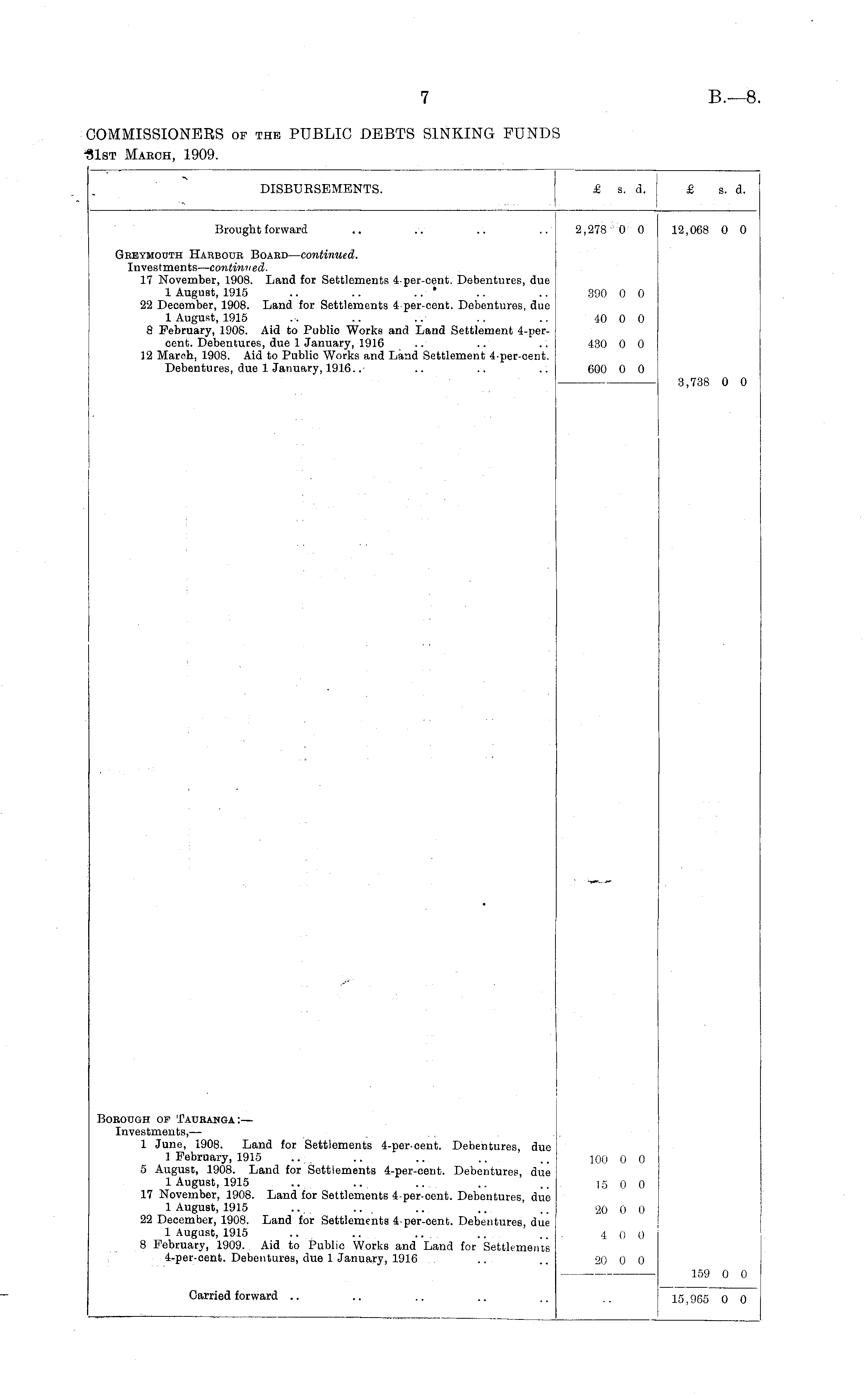 DISBURSEMENTS. £ s. d. £ s. d. Brought forward 2,278 0 0 12,068 0 0 Greymouth Harbour Board— continued. Investments— continued. 17 November, 1908. Land for Settlements 4-per-cent. Debentures, due 1 August, 1915 .. .. .. ' 22 December, 1908. Land for Settlements 4 per-cent. Debentures, due 1 August, 1915 8 February, 1908. Aid to Publio Works and Land Settlement 4-per-cent. Debentures, due 1 January, 1916 12 March, 1908. Aid to Public Works and Land Settlement 4-per-cent. Debentures, due 1 January, 1916.. 390 0 0 40 0 0 430 0 0 600 0 0 3,738 0 0 Borough of Tauranga:— Investments, — 1 June, 1908. Land for Settlements 4-per-cent. Debentures, due 1 February, 1915 5 August, 1908. Land for Settlements 4-per-cent. Debentures, due 1 August, 1915 17 November, 1908. Land for Settlements 4-per-eent. Debentures, due 1 August, 1915 22 December, 1908. Land for Settlements 4-per-cent. Debentures, due 1 August, 1915 8 February, 1909. Aid to Public Works and Land for Settlements 4-per-oent. Debentures, due 1 January, 1916 100 0 0 15 0 0 20 0 0 4 0 0 20 0 0 159 0 0 Carried forward 15,965 0 0