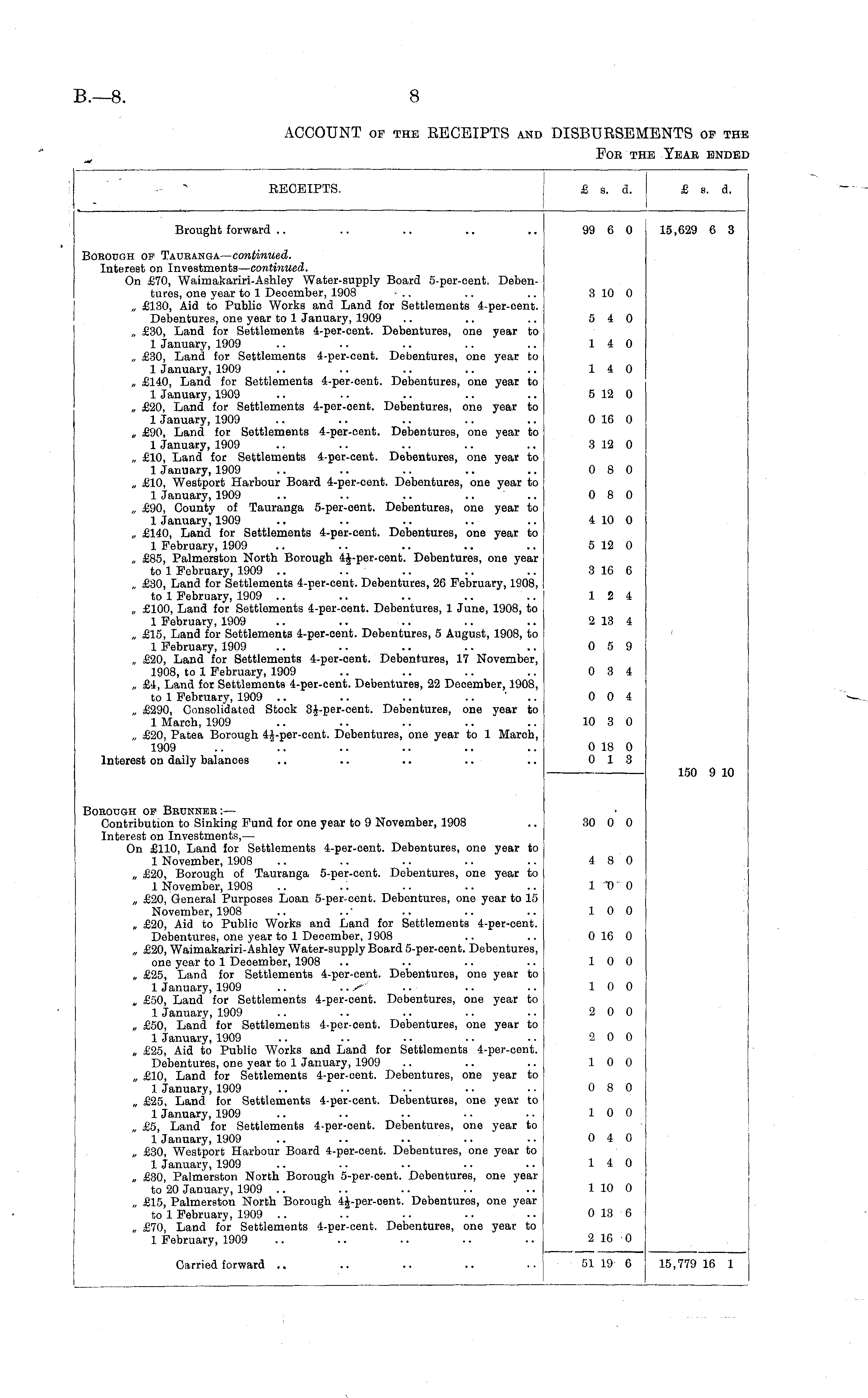 RECEIPTS. £ s. d. £ s. d. Brought forward 99 6 0 15,629 6 3 Borough op Tauranga— continued. Interest on Investments— continued. On £70, Waimakariri-Ashley Water-supply Board 5-per-cent. Debentures, one year to 1 December, 1908 .. .. „ £130, Aid to Public Works and Land for Settlements 4-per-cent. Debentures, one year to 1 January, 1909 „ £30, Land for Settlements 4-per-cent. Debentures, one year to 1 January, 1909 „ £30, Land for Settlements 4-per-cent. Debentures, one year to 1 January, 1909 „ £140, Land for Settlements 4-per-cent. Debentures, one year to 1 January, 1909 „ £20, Land for Settlements 4-per-oent. Debentures, one year to 1 January, 1909 „ £90, Land for Settlements 4-per-cent. Debentures, one year to 1 January, 1909 „ £10, Land for Settlements 4-per-cent. Debentures, one year to 1 January, 1909 „ £10, Westport Harbour Board 4-per-cent. Debentures, one year to 1 January, 1909 „ £90, County of Tauranga 5-per-cent. Debentures, one year to 1 January, 1909 „ £140, Land for Settlements 4-per-cent. Debentures, one year to 1 February, 1909 „ £85, Palmerston North Borough 4J-per-cent. Debentures, one year to 1 February, 1909 .. „ £30, Land for Settlements 4-per-cent. Debentures, 26 February, 1908, to 1 February, 1909 .. „ £100, Land for Settlements 4-per-cent. Debentures, 1 June, 1908, to 1 February, 1909 „ £15, Land for Settlements 4-per-cent. Debentures, 5 August, 1908, to 1 February, 1909 „ £20, Land for Settlements 4-per-cent. Debentures, 17 November, 1908, to 1 February, 1909 „ £4, Land for Settlements 4-per-cent. Debentures, 22 December, 1908, to 1 February, 1909 .. .. .. .. ' „ £290, Consolidated Stock 3J-per-cent. Debentures, one year to 1 March, 1909 „ £20, Patea Borough Debentures, one year to 1 March, 1909 Interest on daily balances 3 10 0 5 4 0 14 0 14 0 5 12 0 0 16 0 3 12 0 0 8 0 0 8 0 4 10 0 5 12 0 3 16 6 12 4 2 13 4 0 5 9 0 3 4 0 0 4 10 3 0 0 18 0 0 13 150 9 10 Borough op Brunner :— Contribution to Sinking Fund for one year to 9 November, 1908 Interest on Investments, — On £110, Land for Settlements 4-per-cent. Debentures, one year to 1 November, 1908 „ £20, Borough of Tauranga 5-per-cent. Debentures, one year to 1 November, 1908 „ £20, General Purposes Loan 5-per-cent. Debentures, one year to 15 November, 1908 „ £20, Aid to Public Works and Land for Settlements 4-per-cent. Debentures, one year to 1 December, 1908 „ £20, Waimakariri-Ashley Water-supply Board 5-per-cent. Debentures, one year to 1 December, 1908 „ £25, Land for Settlements 4-per-cent. Debentures, one year to 1 January, 1909 .. .. s~ „ £50, Land for Settlements 4-per-cent. Debentures, one year to 1 January, 1909 „ £50, Land for Settlements 4-per-cent. Debentures, one year to 1 January, 1909 „ £25, Aid to Public Works and Land for Settlements 4-per-cent. Debentures, one year to 1 January, 1909 „ £10, Land for Settlements 4-per-cent. Debentures, one year to 1 January, 1909 „ £25, Land for Settlements 4-per-cent. Debentures, one year to 1 January, 1909 „ £5, Land for Settlements 4-per-cent. Debentures, one year to 1 January, 1909 „ £30, Westport Harbour Board 4-per-cent. Debentures, one year to 1 January, 1909 „ £30, Palmerston North Borough 5-per-cent. Debentures, one year to 20 January, 1909 .. „ £15, Palmerston North Borough 4fj-per-oent. Debentures, one year to 1 February, 1909 .. „ £70, Land for Settlements 4-per-cent. Debentures, one year to 1 February, 1909 30 0 0 4 8 0 10 0 10 0 0 16 0 10 0 10 0 2 0 0 2 0 0 10 0 0 8 0 10 0 0 4 0 14 0 1 10 0 0 13 6 2 16 0 Carried forward 51 19 6 15,779 16 1