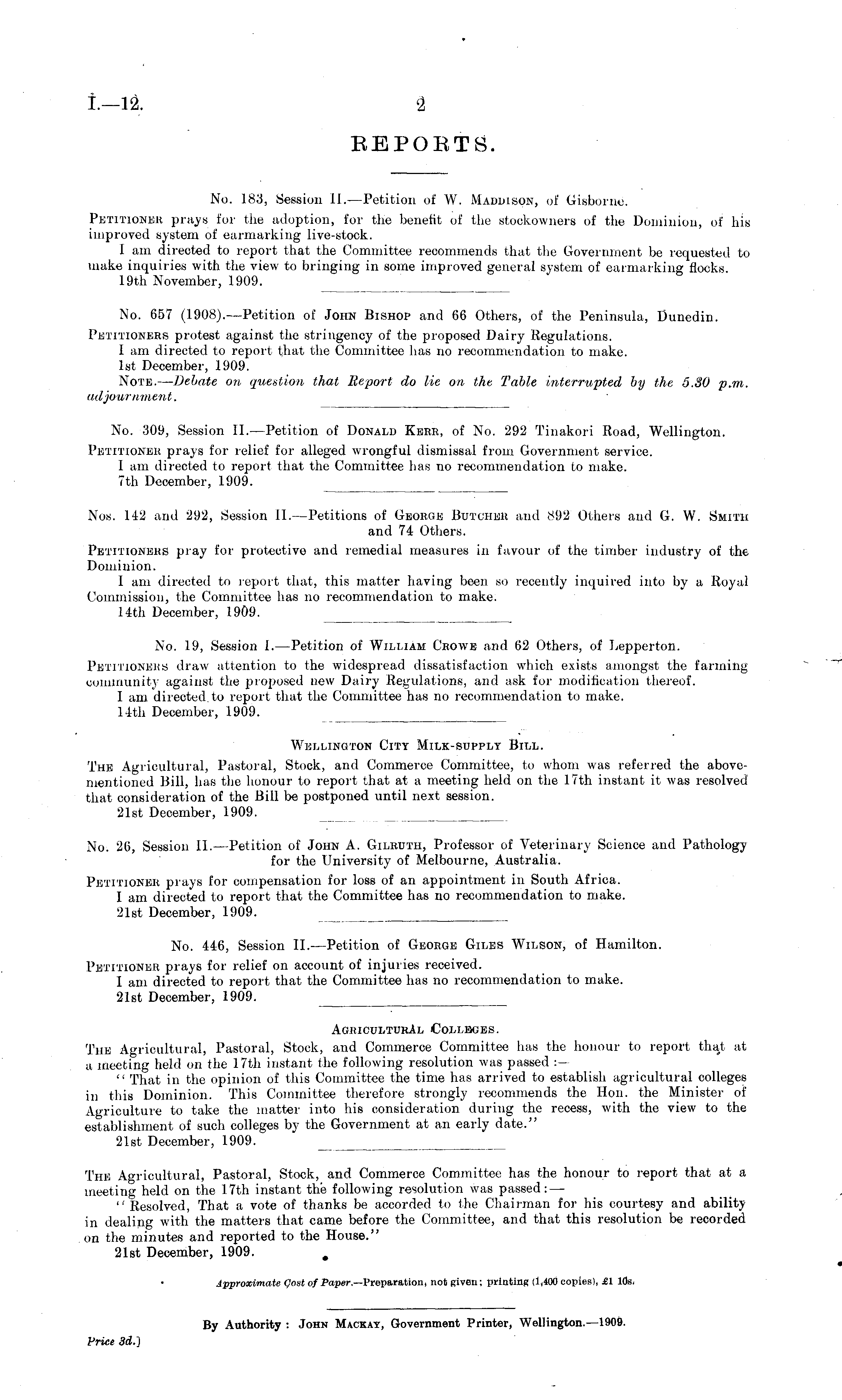 No. 19, Session I.—Petition of William Crowe and 62 Others, of Lepperton. Petitioners draw attention to the widespread dissatisfaction which exists amongst the farming community against the proposed new Dairy Regulations, and ask for modification thereof. 1 am directed, to report that the Committee has no recommendation to make. 14th December, 1909.
