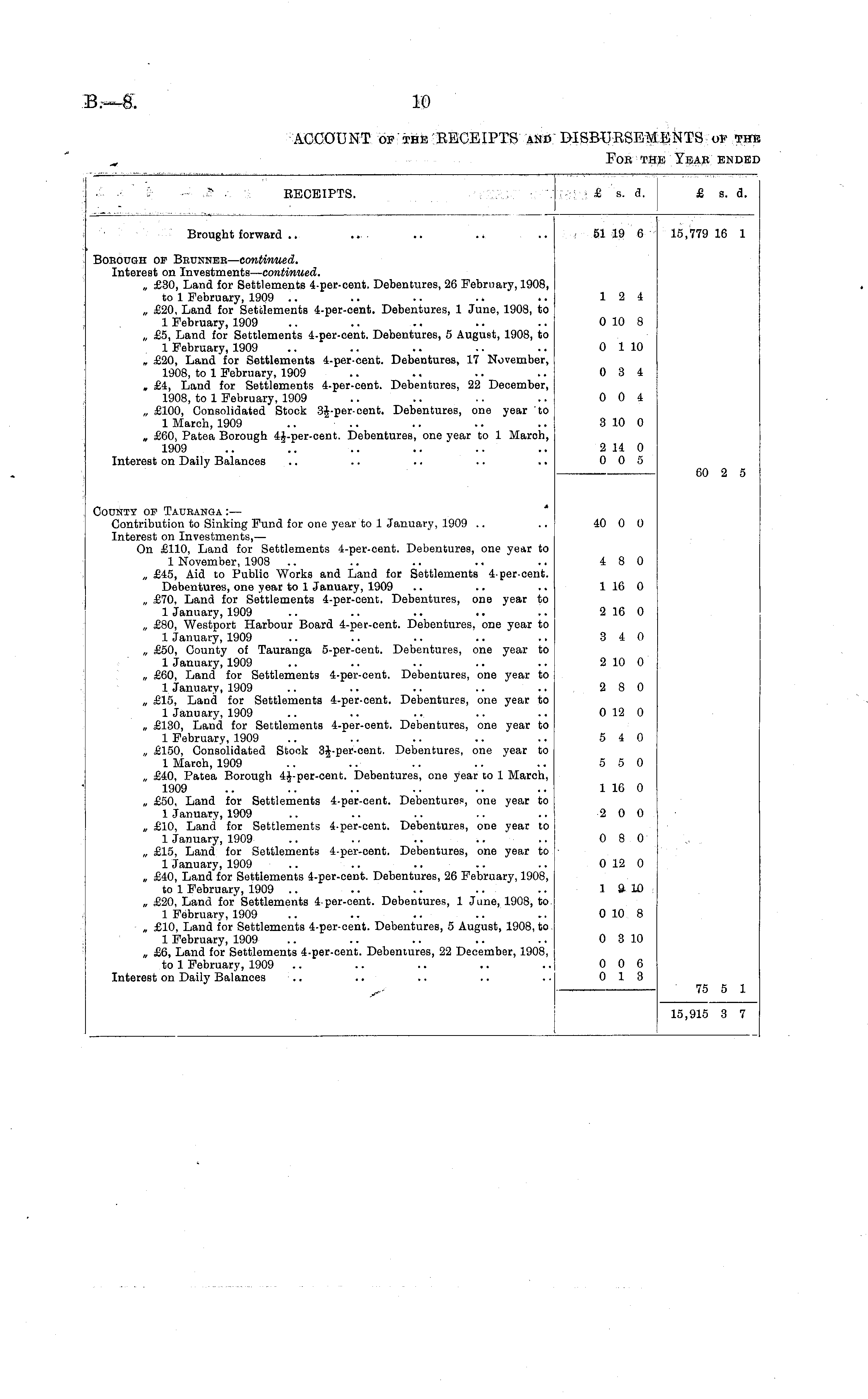 RECEIPTS. - ■ £ s. d. £ s. a. Brought forward .. 51 19 6 15,779 16 1 Borough op Brunner— continued. Interest on Investments— continued. „ £30, Land for Settlements 4-per-cent. Debentures, 26 February, 1908, to 1 February, 1909 .. „ £20, Land for Settlements 4-per-cent. Debentures, 1 June, 1908, to 1 February, 1909 „ £5, Land for Settlements 4-per-cent. Debentures, 5 August, 1908, to 1 February, 1909 „ £20, Land for Settlements 4-per-cent. Debentures, 17 November, 1908, to 1 February, 1909 , £4, Land for Settlements 4-per-cent. Debentures, 22 December, 1908, to 1 February, 1909 .. „ £100, Consolidated Stock 3J-per-cent. Debentures, one year to 1 March, 1909 „ £60, Patea Borough 4n>-per-cent. Debentures, one year to 1 Maroh, 1909 Interest on Daily Balances 12 4 0 10 8 0 1 10 0 3 4 0 0 4 3 10 0 2 14 0 0 0 5 60 2 5 County op Tauranga :— Contribution to Sinking Fund for one year to 1 January, 1909 Interest on Investments, — On £110, Land for Settlements 4-per-cent. Debentures, one year to 1 November, 1908 .. „ £45, Aid to Public Works and Land for Settlements 4-per-cent. Debentures, one year to 1 January, 1909 „ £70, Land for Settlements 4-per-cent. Debentures, one year to 1 January, 1909 „ £80, Westport Harbour Board 4-per-cent. Debentures, one year to 1 January, 1909 „ £50, County of Tauranga 5-per-cent. Debentures, one year to 1 January, 1909 .. ' .. „ £60, Land for Settlements 4-per-cent. Debentures, one year to 1 January, 1909 „ £15, Land for Settlements 4-per-cent. Debentures, one year to 1 January, 1909 „ £130, Land for Settlements 4-per-cent. Debentures, one year to 1 February, 1909 „ £150, Consolidated Stock 3J-per-cent. Debentures, one year to 1 March, 1909 „ £40, Patea Borough 4J-per-cent. Debentures, one year to 1 March, 1909 „ £50, Land for Settlements 4-per-cent. Debentures, one year to 1 January, 1909 „ £10, Land for Settlements 4-per-cent. Debentures, one year to 1 January, 1909 „ £15, Land for Settlements 4-per-cent. Debentures, one year to 1 January, 1909 „ £40, Land for Settlements 4-per-oent. Debentures, 26 February, 1908, to 1 February, 1909 .. ,, £20, Land for Settlements 4-per-cent. Debentures, 1 June, 1908, to. 1 February, 1909 „ £10, Land for Settlements 4-per-cent. Debentures, 5 August, 1908, to 1 February, 1909 „ £6, Land for Settlements 4-per-cent. Debentures, 22 December, 1908, to 1 February, 1909 Interest on Daily Balances 40 0 0 4 8 0 1 16 0 2 16 0 3 4 0 2 10 0 2 8 0 0 12 0 5 4 0 5 5 0 1 16 0 2 0 0 0 8 0 0 12 0 1 9 30 0 10 8 0 3 10 0 0 6 0 13 V' 75 5 1 15,915 3 7