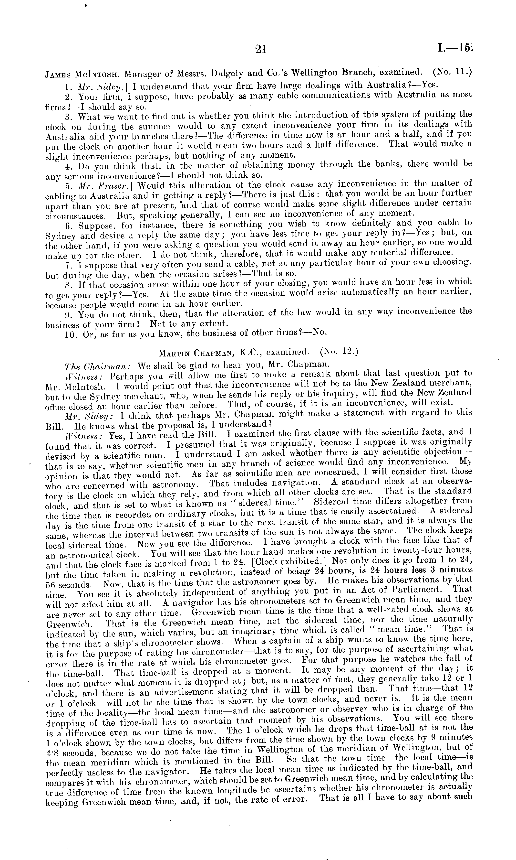 James Mclntosh, Manager of Messrs. Dalgety and Co.'s Wellington Branch, examined. (No. 11.) 1. Mr. Sidey,] I understand that your firm have large dealings with Australia? —Yes. 2. Your firm, 1 suppose, have probably as many cable communications with Australia as most firms? —I should say so: 3. What we want to find out is whether you think the introduction of this system of putting the clock on during the summer would to any extent inconvenience your firm in its dealings with Australia and your brandies there I—The1 —The difference in time now is an hour and a half, and if you put the clods on another hour it would mean two hours and a half difference. That would make a slight inconvenience perhaps, but nothing of any moment. I. Do you think that, in the matter of obtaining money through the banks, there would be any serious inconvenience? —I should not think so. 5. Mr. Eraser.] Would this alteration of the clock cause any inconvenience in the matter of cabling to Australia and in getting a reply ?—There is just this : that you would be an hour further apart than yon are at present, and that of course would make some slight difference under certain ciroumstanoes. But, speaking generally, I can see no inconvenience of any moment. 6. Suppose, for instance, there is something you wish to know definitely and you cable to Sydney and desire a reply the same day; you have less time to get your reply in?— Yes; but, on the other hand, if you were asking a question you would send it away an hour earlier, so one would make up for the other. Ido not think, therefore, that it would make any material difference. 7. I suppose that very often you send a cable, not at any particular hour of your own choosing, but during the day, when the occasion arises? —That is so. 8. If that occasion arose within one hour of your closing, you would have an hour less in which to get your reply?— Yes. At the same time the occasion would arise automatically an hour earlier, because people would come in an hour earlier. . i). You do not think, then, that the alteration of the law would in any way inconvenience the business of your firm?— Not to any extent. 10. Or," as far as you know, the business of other firms?— No. Martin Chapman, K.C., examined. (No. 12.) The Chairman : We shall be glad to hear you, Mr. Chapman. Witness: Perhaps you will allow me first to make a remark about that last question put to Mr Molntosh I would point out that the inconvenience will not bo to the New Zealand merchant, but to the Sydney merchant, who, when he sends his reply or his inquiry, will find the New Zealand oilice closed an hour earlier than before. That, of course, if it is an inconvenience, will exist. Mr. Sidey: I think that perhaps Mr. Chapman might make a statement with regard to this Bill He knows what the proposal is, I understand? Witness : Yes, I have read the Bill. I examined the first clause with the scientific tacts, and 1 found that it was correct, 1 presumed that it was originally, because 1 suppose it was originally devised by a scientific man. I understand I am asked whether there is any scientific objection— that is to say, whether scientific men in any branch of science would find any inconvenience. My opinion is that they would not. As far as scientific men are concerned, 1 will consider first those who are concerned'with astronomy. That includes navigation. A standard clock at an observatory is the clock (1 n which they rely, and from which all other clocks are set. That is the standard clock and that is set to what is known as " sidereal time." Sidereal time differs altogether from the time that is recorded on ordinary clocks, but it is a time that is easily ascertained. A sidereal day is the time from one transit of a star to the next transit of the same star, and it is always the same, whereas the interval between two transits of the sun is not always the same. The clock keeps local sidereal time. Now you see the difference. 1 have brought a clock with the face like that of an astronomical clock. You will see that the hour hand makes one revolution in twenty-tour hours, and that the clock face is marked from 1 to 24. [Clock exhibited.] Not only does it go from 1 to 24, but the time taken in making a revolution, instead of being 24 hours, is 24 hours less 3 minutes 56 seconds Now, that is the time that the astronomer goes by. He makes his observations by that time You see it is absolutely independent of anything you put man Act of Parliament, lnut will not affect him at all. A navigator has his chronometers set to Greenwich mean time and they are never set to any other time. Greenwich mean time is the time that a well-rated clock shows at Greenwich. That is the Greenwich mean time, not the sidereal time nor the time naturally indicated by the sun, which varies, but an imaginary time which is called mean time. lhat is the time that a ship's chronometer shows. When a captain of a ship wants to know the time here it is for the purpose of rating his chronometer—that is to say, for the purpose of ascertaining what error there is in the rate at which his chronometer goes. For that purpose he watches the tall of the time-ball. That time-ball is dropped at a moment. It may be any moment of the day; it does not matter what moment it is dropped at; but, as a matter of tact they generally take 12 or 1 o'clock, and there is an advertisement stating that it will be dropped then, lhat time-that 12 or 1 o'clock—will not be the time that is shown by the town clocks, and never is. _It is the mean time of the locality-the local mean time—and the astronomer or observer who is in charge of the dropping of the time-ball has to ascertain that moment by his observations You will see there is a difference even as our time is now. The 1 o'clock which he drops that time-ball at is not the o'cock shown by the town clocks, but differs from the time shown by the town ? docks by 9 minutes 4-8 seconds, because we d