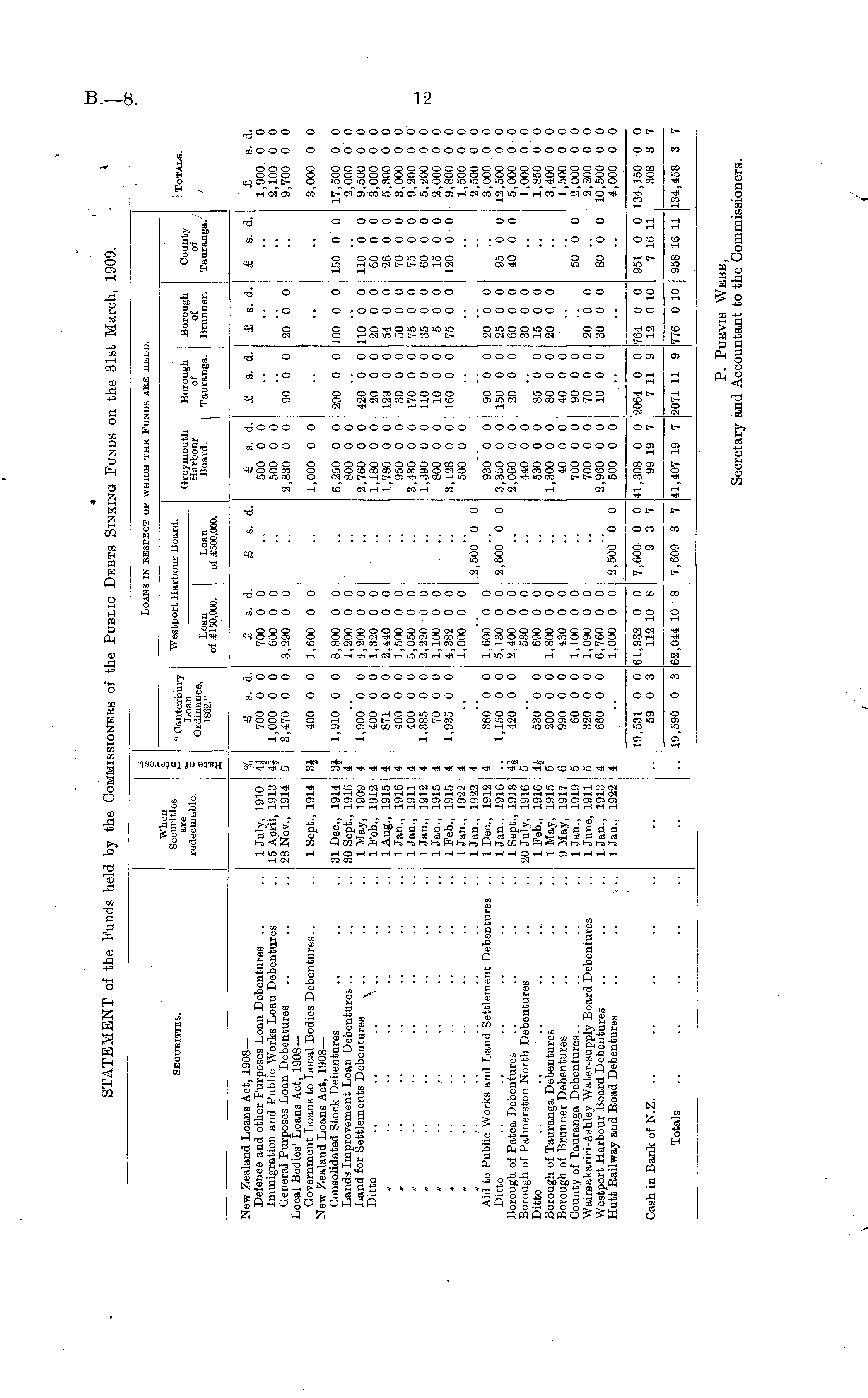 s. Loans in bespect of which the Funds abe held. When Securities are redeemable. O fi Westport Harbour Board. rreymouth Borough Borough Harbour of of Board. Tauranga. Brunner. Totals. Secubities. " Canterbury Loan Ordinance, 1862." Gre; County of Tauranga. Loan of £150,000. Loan of £500,000. New Zealand Loans Act, 1908 — Defence and other-Purposes Loan Debentures .. Immigration and Public Works Loan Debentures General Purposes Loan Debentures Local Bodies' Loans Act, 1908 — Government Loans to Local Bodies Debentures.. New Zealand Loans Act, 1908 — Consolidated Stock Debentures Lands Improvement Loan Debentures Land for Settlements Debentures ... Ditto .. .. .. \.. Uuly, 1910 15 April, 1913 28 Nov., 1914 % 5 £ s. d. 700 0 0 1,000 0 0 3,470 0 0 £ s. d. 700 0 0 600 0 0 3,290 0 0 £ s. d. £ s. d. 500 0 0 500 0 0 2,830 0 0 £ s. d. £ s. d. £ s. d. £ s. d. 1,900 0 0 2,100 0 0 9,700 0 0 90 0 0 20 6 0 1 Sept., 1914 3* 400 0 0 1,600 0 0 1,000 0 0 3,000 0 0 Aid to Public Works and Land Settlement Debentures Ditto Borough of Patea Debentures Borough of Palmerston North Debentures Ditto Borough of Tauranga Debentures Borough of Brunner Debentures County of Tauranga Debentures.. Waimakariri-Ashley Water-supply Board Debentures Westport Harbour Board Debentures Hutt Railway and Road Debentures 31 Dec, 1914 30 Sept., 1915 1 May, 1909 1 Feb., 1912 lAug., 1915 1 Jan., 1916 1 Jan., 1911 1 Jan., 1912 1 Jan., 1915 1 Feb., 1915 1 Jan., 1922 1 Jan., 1922 1 Dec, 1912 1 Jan., 1916 1 Sept., 1913 20 July, 1916 1 Feb., 1916 1 May, 1915 9 May, 1917 1 Jan., 1919 1 June, 1911 1 Jan., 1913 1 Jan., 1922 4 4 4 4 4 4 4 4 4 4 4 4 1,910 0 0 1,900 0 0 400 0 0 871 0 0 400 0 0 400 0 0 1,385 0 0 70 0 0 1,935 0 0 360 0 0 1,150 0 0 420 0 0 8,800 0 0 1,200 0 0 4,200 0 0 1,320 0 0 2.440 0 0 1,500 0 0 5,050 0 0 2,220 0 0 1,100 0 0 4,382 0 0 1,000 0 0 1,600 0 0 5,130 0 0 2,400 0 0 530 0 0 690 0 0 1,800 0 0 430 0 0 1,100 0 0 1,090 0 0 6,760 0 0 1,000 0 0 2,50o"o 0 6,250 0 0 800 0 0 2,760 0 0 1,180 0 0 1,780 0 0 950 0 0 3,430 0 0 1,390 0 0 800 0 0 3,128 0 0 500 0 0 930 0 0 3,350 0 0 2,060 0 0 440 0 0 530 0 0 1,300 0 0 40 0 0 700 0 0 700 0 0 2,960 0 0 500 0 0 290 0 0 420 0 0 20 0 0 129 0 0 30 0 0 170 0 0 110 0 0 10 0 0 160 0 0 90 6 0 150 0 0 20 0 0 100 0 0 110 0 0 20 0 0 54 0 0 50 0 0 75 0 0 35 0 0 5 0 0 75 0 0 20 0 0 25 0 0 60 0 0 30 0 0 15 0 0 20 0 0 150 0 0 110 0 0 60 0 0 26 0 0 70 0 0 75 0 0 60 0 0 15 0 0 120 0 0 17,500 0 0 2,000 0 0 9,500 0 0 3,000 0 0 5,300 0 0 3,000 0 0 9,200 0 0 5,200 0 0 2,000 0 0 9,800 0 0 1,500 0 0 2,500 0 0 3,000 0 0 12,500 0 0 5,000 0 0 1,000 0 0 1,850 0 0 3,400 0 0 1,500 0 0 2,000 0 0 2,200 0 0 10,500 0 0 4,000 0 0 5 5 6 5 5 4 4 2,600"0 0 95 0 0 40 0 0 530 0 0 200 0 0 990 0 0 60 0 0 320 0 0 660 0 0 85 0 0 80 0 0 40 0 0 90 0 0 70 0 0 10 0 0 50 0 0 20 6 0 30 0 0 80 0 0 2,500 0 0 Cash in Bank of N.Z. 19,531 0 0 59 0 3 61,932 0 0 112 10 8 7,600 0 0 9 3 7 41,308 0 0 99 19 7 2064 0 0 7 11 9 764 0 0 12 0 10 951 0 0 7 16 11 134,150 0 308 3 Totals 41,407 19 7 2071 11 9 776 0 10 958 16 11 134,458 3 19,590 0 3 2,044 10 8 7,609 3 7 P. Purvis Webb, Secretary and Accountant to the Commissioners.
