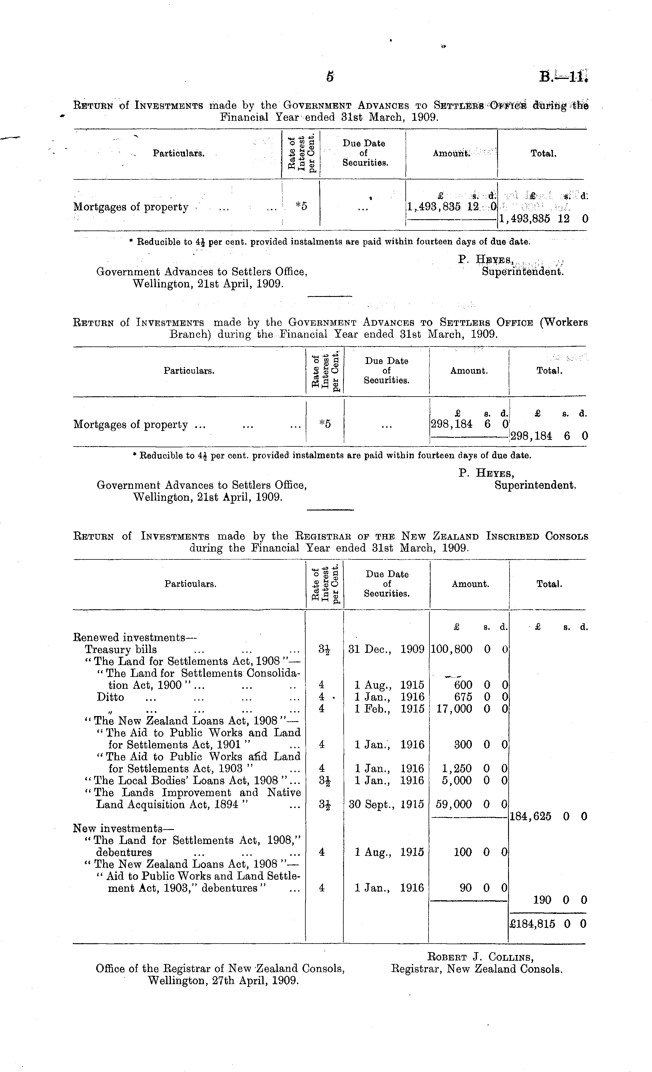 Return of Investments made by the Registrar of the New Zealand Inscribed Consols during the Financial Year ended 31st March, 1909.