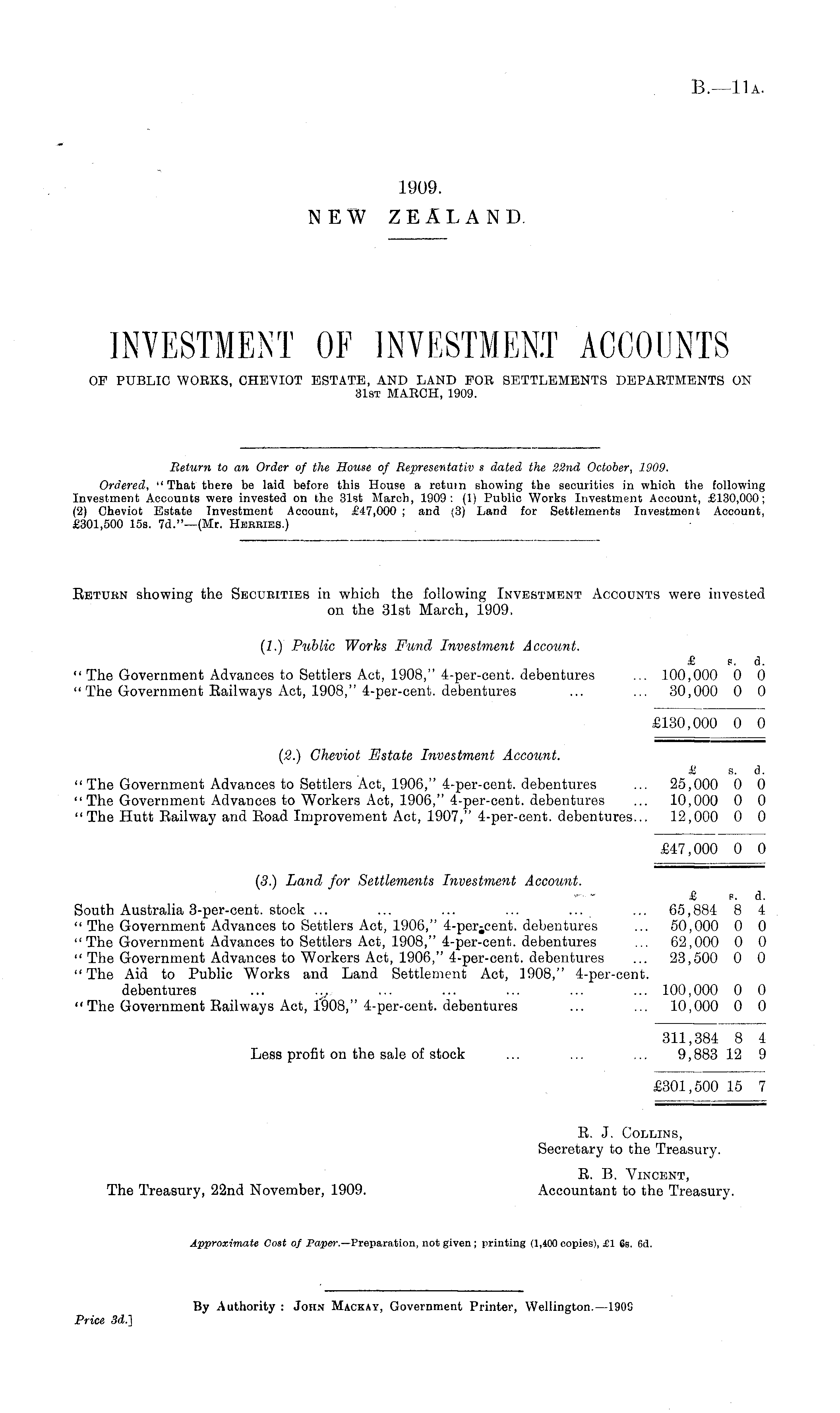 Return to an Order of the House of Representativ s dated the 22nd October, 1909. Ordered, "That there be laid before this House a return showing the securities in which the following Investment Accounts were invested on the 31st March, 1909: (1) Public Works Investment Account, £130,000; (2) Cheviot Estate Investment Account, £47,000 ; and (3) Land for Settlements Investment Account, £301,500 15s. 7d."—(Mr. Hebbies.)