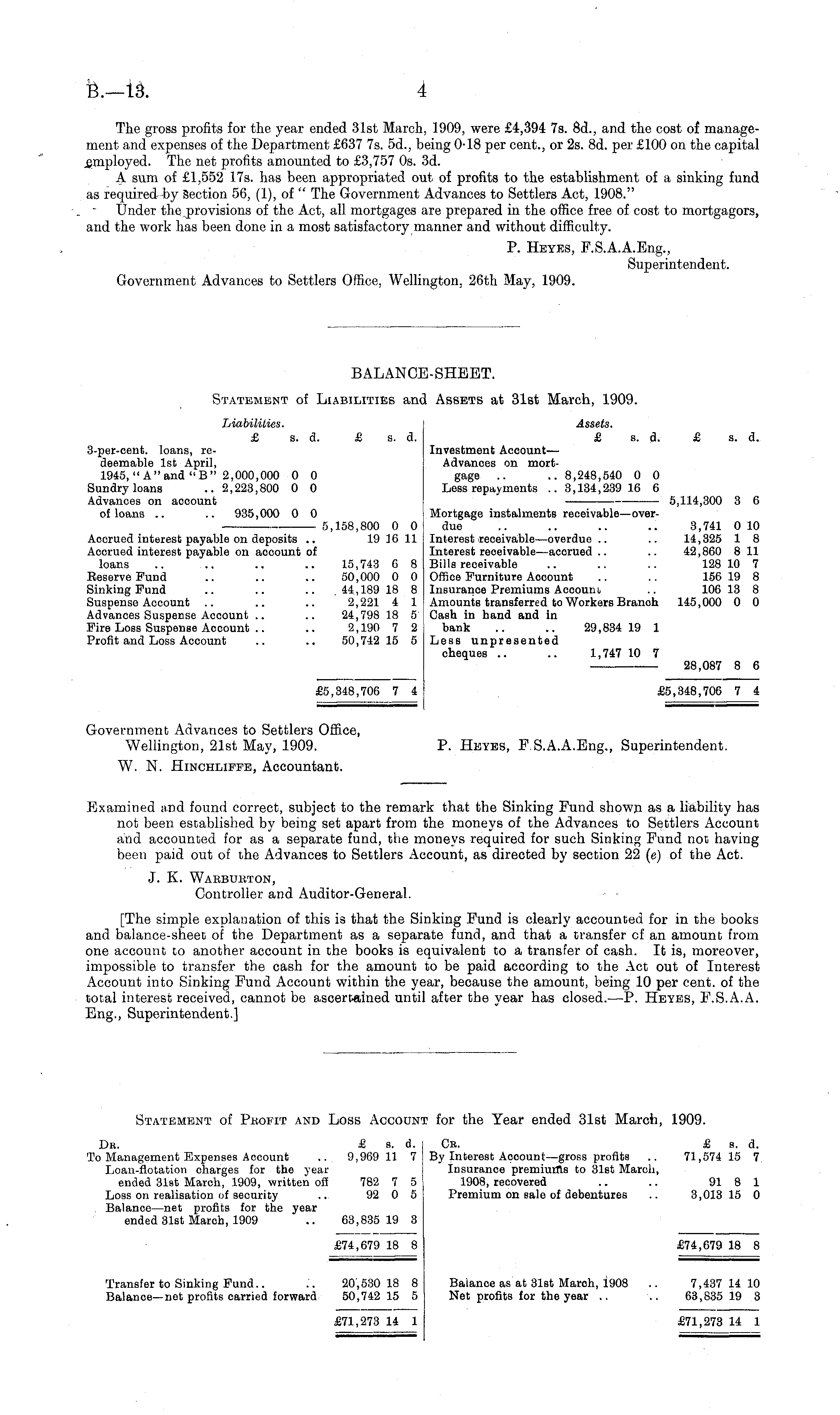 Government Advances to Settlers Office, Wellington, 21st May, 1909. P. Heyes, F.S.A.A.Eng., Superintendent. W. N. Hinohliffe, Accountant. Examined and found correct, subject to the remark that the Sinking Fund shown as a liability has not been established by being set apart from the moneys of the Advances to Settlers Account and accounted for as a separate fund, the moneys required for such Sinking Fund not having been paid out of the Advances to Settlers Account, as directed by section 22 (c) of the Act. J. K. Wabbubton, Controller and Auditor-General. [The simple explanation of this is that the Sinking Fund is clearly accounted for in the books and balance-sheet of the Department as a separate fund, and that a transfer cf an amount from one account to another account in the books is equivalent to a transfer of cash. It is, moreover, impossible to transfer the cash for the amount to be paid according to the Act out of Interest Account into Sinking Fund Account within the year, because the amount, being 10 per cent, of the total interest received, cannot be ascertained until after the year has closed. —P. Heyes, F.S.A.A. Eng., Superintendent.]