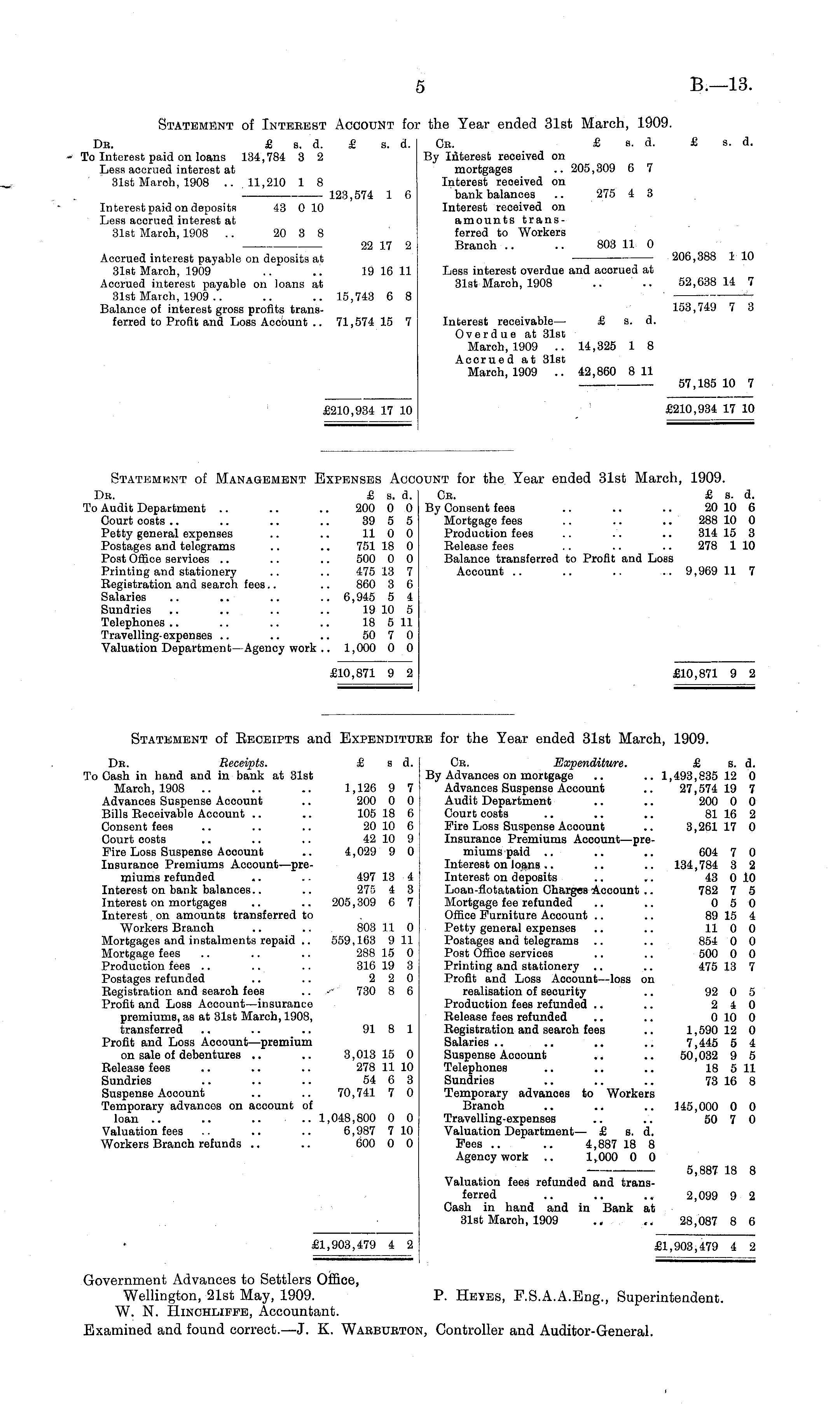 Dβ. Receipts. £ ad. Oβ. Expenditure. £ s. d. 'o Cash in hand and in bank at 31st By Advances on mortgage .. .. 1,493,835 12 0 March, 1908 .. .. .. 1,126 9 7 Advances Suspense Account .. 27,574 19 7 Advances Suspense Account .. 200 0 0 Audit Department .. .. 200 0 0 Bills Eeceivable Account .. .. 105 18 6 Court costs .. .. .. 81 16 2 Consent fees .. .. .. 20 10 6 Fire Loss Suspense Account .. 3,261 17 0 Court costs .. .. .. 42 10 9 Insurance Premiums Account—prePire Loss Suspense Acoount .. 4,029 9 0 miums paid .. .. .. 604 7 0 Insurance Premiums Account—pre- Interest on loans.. .. .. 134,784 3 2 miums refunded .. .. 497 13 4 Interest on deposits .. .. 43 0 10 Interest on bank balances.. .. 275 4 3 Loan-flotatation Charges Account .. 782 7 5 Interest on mortgages .. .. 205,309 6 7 Mortgage fee refunded .. .. 0 5 0 Interest. on amounts transferred to Office Furniture Account .. .. 89 15 4 Workers Branoh .. .. 803 11 0 Petty general expenses .. .. 11 0 0 Mortgages and instalments repaid .. 559,163 9 11 Postages and telegrams .. .. 854 0 0 Mortgage fees .. .. .. 288 15 0 Post Office services .. .. 500 0 0 Production fees .. .. .. 316 19 3 Printing and stationery .. .. 475 13 7 Postages refunded .. .. 2 2 0 Profit and Loss Account—loss on Registration and search fees .. •• 730 8 6 realisation of seourity .. 92 0 5 Profit and Loss Account—insurance Production fees refunded .. .. 2 4 0 premiums, as at 31st March, 1908, Release fees refunded .. .. 0 10 0 transferred .. .. .. 91 8 1 Registration and search fees .. 1,590 12 0 Profit and Loss Account —premium Salaries .. .. .. .. 7,445 5 4 on sale of debentures .. .. 3,013 15 0 Suspense Acoount .. .. 50,032 9 5 Release fees .. .. .. 278 11 10 Telephones .. .. .. 18 5 11 Sundries .. .. .. 54 6 3 Sundries .. .. .. 73 16 8 Suspense Account .. .. 70,741 7 0 Temporary advances to Workers Temporary advances on account of Branch .. .. .. 145,000 0 0 loan .. .. .. .. 1,048,800 0 0 Travelling-expenses .. .. 50 7 0 Valuation fees .. .. .. 6,987 7 10 Valuation Department— £ s. d. Workers Branch refunds .. .. 600 0 0 Fees .. .. 4,887 18 8 Agency work .. 1,000 0 0 5,887 18 8 Valuation fees refunded and transferred .. .. .. 2,099 9 2 Cash in hand and in Bank at 31st March, 1909 ., .. 28,087 8 6 £1,903,479 4 2 £1,903,479 4 2 Government Advances to Settlers Office, Wellington, 21st May, 1909. P. Hekes, F.S.A.A.Eng., Superintendent. W. N. HiNCHLiFFB, Accountant. Examined and found correct.— J. K. Wabbueton, Controller and Auditor-General.