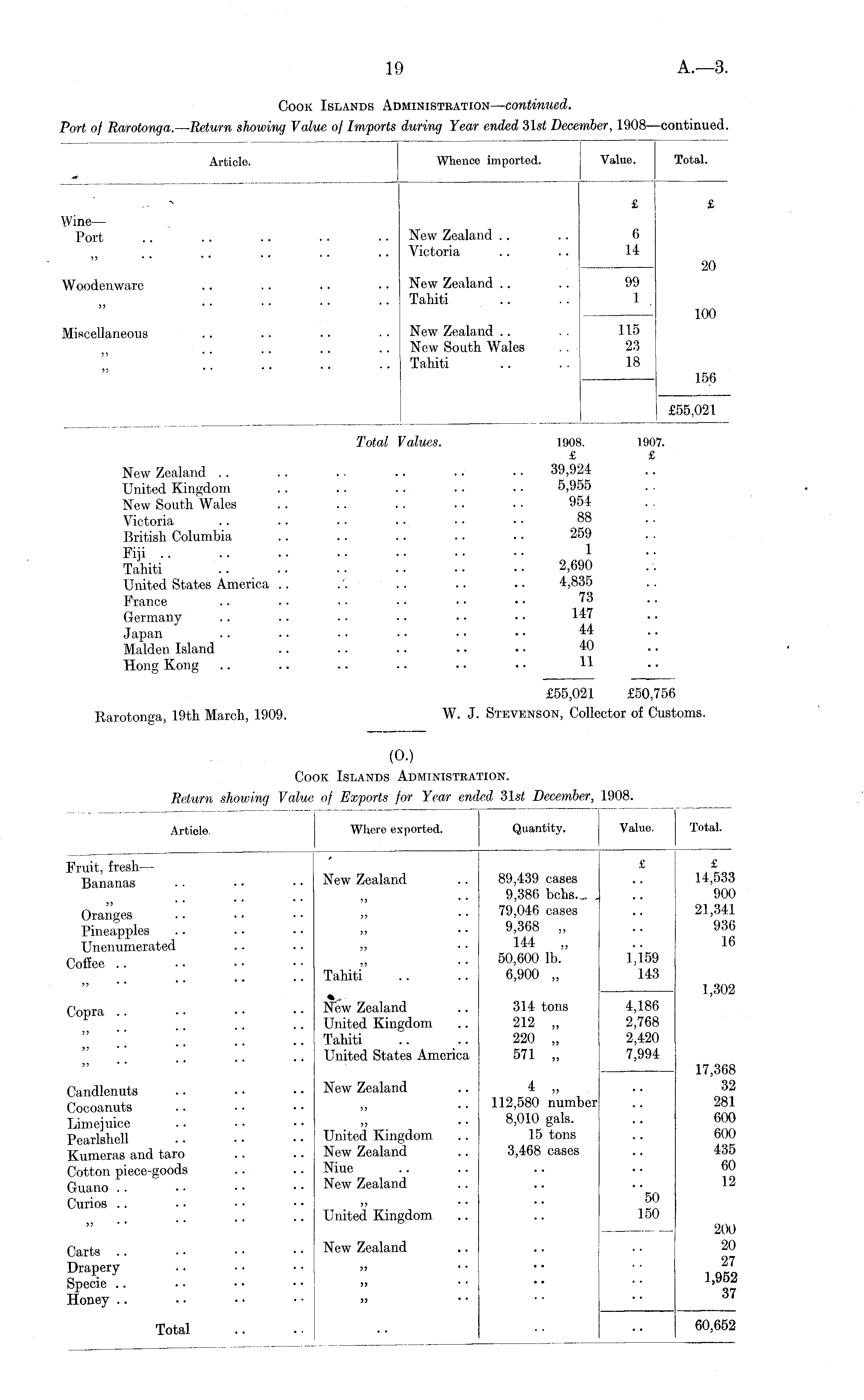 (O.) Cook Islands Administration. Return showing Value of Exports for Year ended 31st December, 1908.