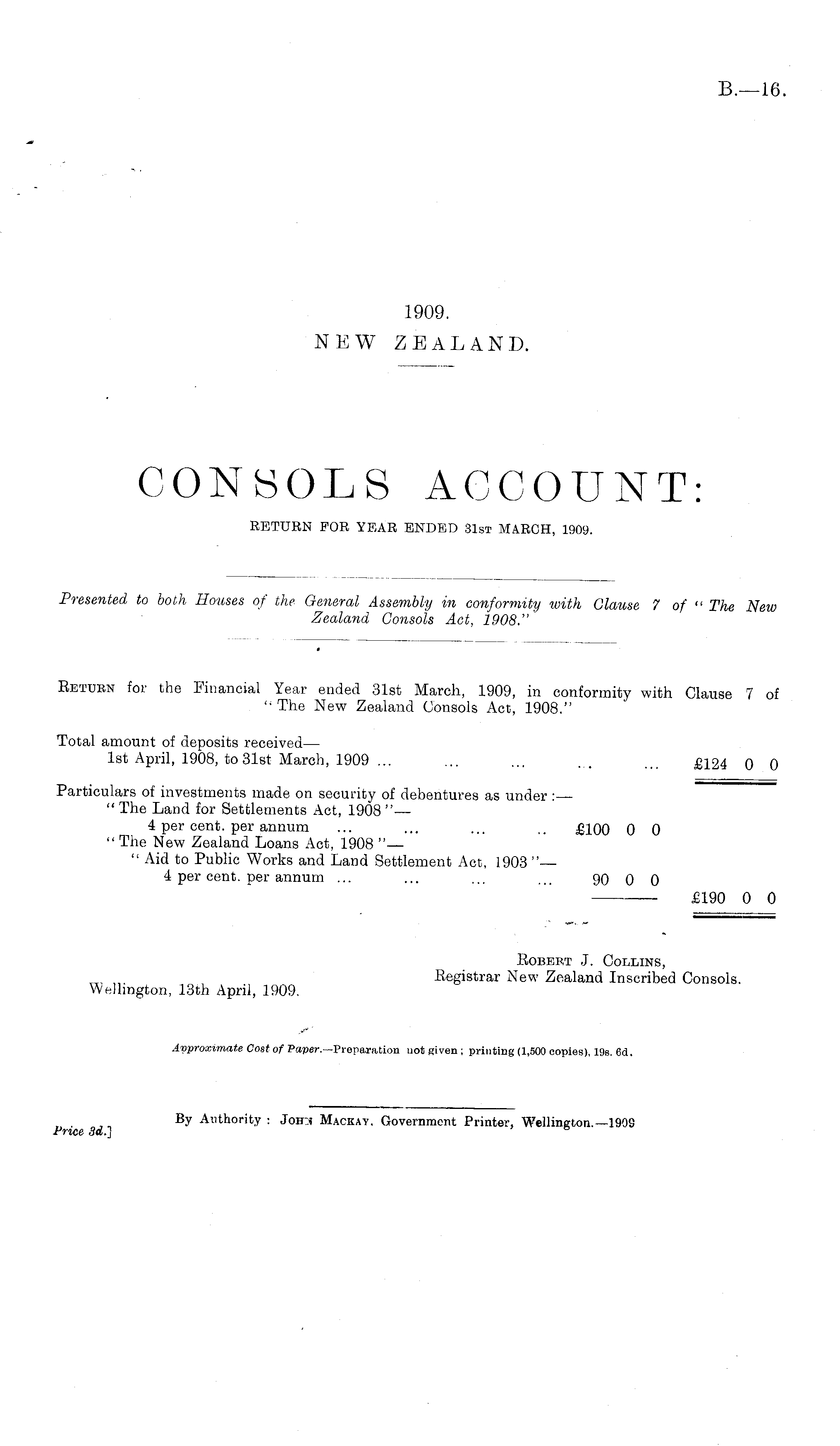 Presented to both Houses of the General Assembly in conformity with Clause 7 of " The New Zealand Consols Act, 1908." Eeturn for the Financial Year ended 31st March, 1909, in conformity with Clause 7 of "The New Zealand Consols Act, 1908." Total amount of deposits received— Ist April, 1908, to 31st March, 1909 ... ... ... ... ... £ 124 q q Particulars of investments made on security of debentures as under :— " The Land for Settlements Act, 1908 "— 4 per cent, per annum ... ... ... .. £100 0 0 " The New Zealand Loans Act, 1908 "— " Aid to Public Works and Land Settlement Act, 1903 " — 4 per cent, per annum ... ... ... ... 90 0 0 £190 0 0