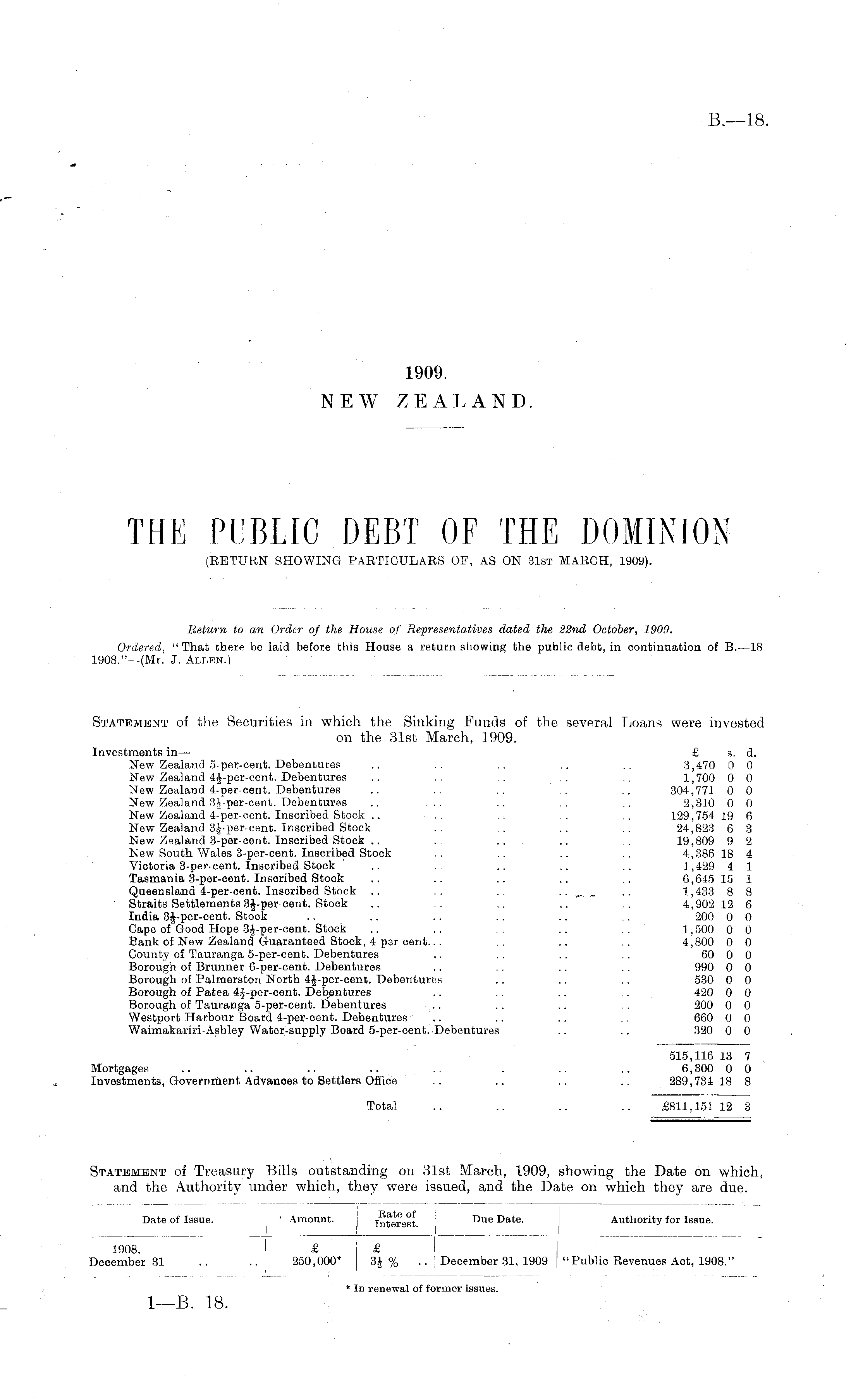 Return to an Order of the House of Representatives dated the 22nd October, 1909. Ordered, "That there be laid before this House a return showing the public debt, in continuation of B.—lB 1908."—(Mr. J. Allen.) Statement of the Securities in which the Sinking Funds of the several Loans were invested on the 31st March, 1909. Investments in— & s. d. New Zealand 5-per-cent. Debentures .. .. .. .. .. 3,470 0 0 New Zealand 4J-per-cent. Debentures .. .. .. .. .. 1,700 0 0 New Zealand 4-per-cent. Debentures .. .. .. 304,771 0 0 New Zealand 3J-per-cent. Debentures .. ... .. .. .. 2,310 0 0 New Zealand 4-per-cent. Inscribed Stock .. .. ~ .. .. 129,754 19 6 New Zealand 3J-per-eent. Inscribed Stock .. .. .. .. 24,823 6 3 New Zealand 3-per-oent. Inscribed Stock .. .. .. .. .. 19,809 9 2 New South Wales 3-per-cent. Inscribed Stock .. .. .. .. 4,386 18 4 Victoria 3-per-cent. Inscribed Stock .. .. .. .. 1,429 4 1 Tasmania 3-per-cent. Inscribed Stock .. .. .. .. .. G,645 15 1 Queensland 4-per-cent. Inscribed Stock .. .. .. .. .. 1,433 8 8 Straits Settlements 3J-per-cent. Stock .. .. .. .. ~ 4,902 12 6 India 3J-per-cent. Stock .. .. .. .. .. .. 200 0 0 Cape of Good Hope 3J-per-cent. Stock .. . . .. .. .. 1,500 0 0 Bank of New Zealand Guaranteed Stock, 4 per cent... .. .. .. 4,800 0 0 County of Tauranga 5-per-cent. Debentures .. .. .. .. 60 0 0 Borough of Brunner 6-per-cent. Debentures .. .. .. .. 990 0 0 Borough of Palmerston North 4J-per-cent. Debentures .. .. .. 530 0 0 Borough of Patea 4J-per-cent. Debentures .. .. .. .. 420 0 0 Borough of Tauranga 5-per-cent. Debentures .. .. .. .. 200 0 0 Westport Harbour Board 4-per-cent. Debentures .. .. .. .. 660 0 0 Waimakariri-Ashley Water-supply Board 5-per-cent. Debentures .. .. 320 0 0 515,116 13 7 Mortgages .. .. .. .. .. . .. .. 6,300 0 0 Investments, Government Advanoes to Settlers Office .. .. .. .. 289,734 18 8 Total .. .. .. .. £811,151 12 3