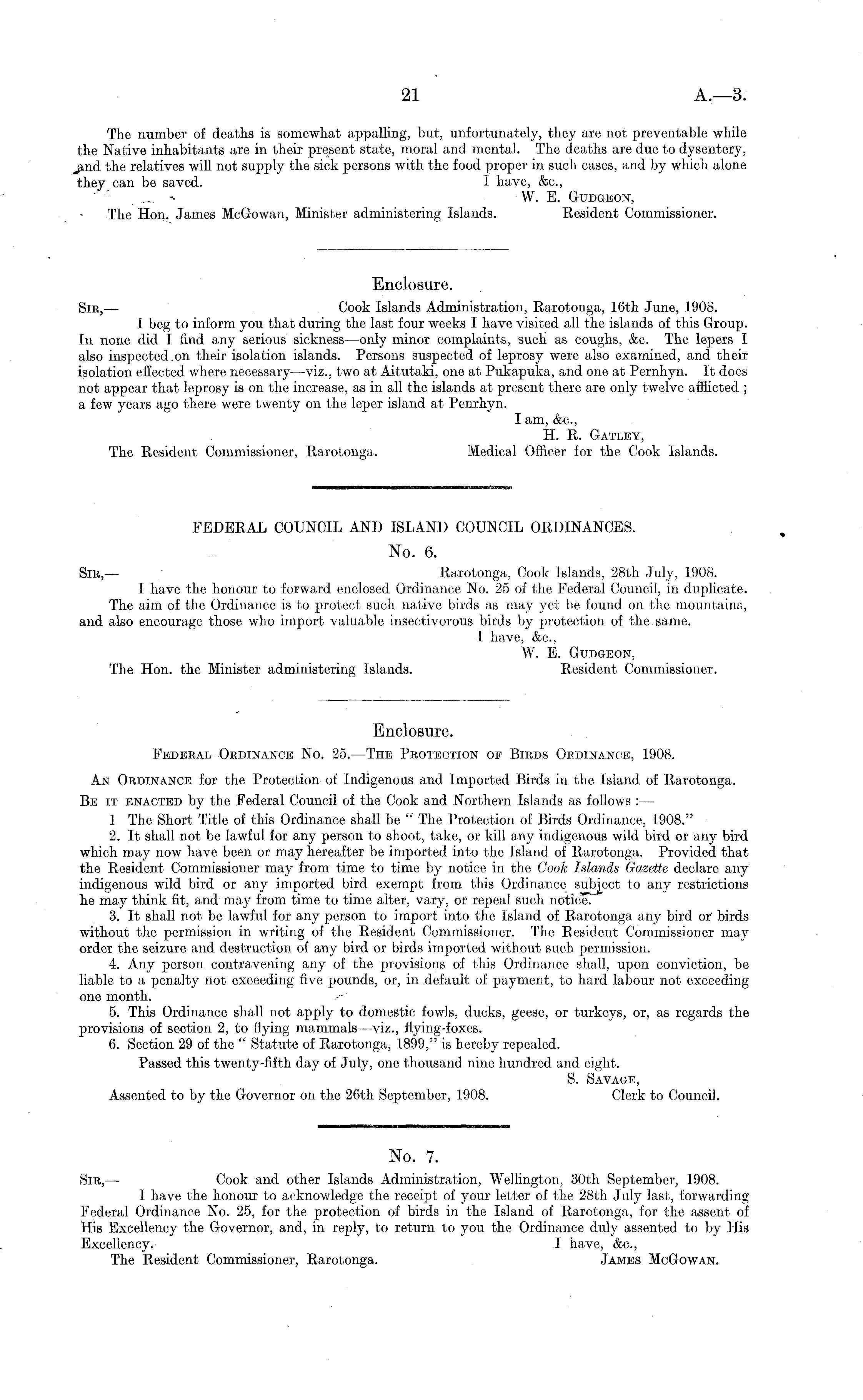 FEDERAL COUNCIL AND ISLAND COUNCIL ORDINANCES. No. 6. Sir, — Rarotonga, Cook Islands, 28th July, 1908. I have the honour to forward enclosed Ordinance No. 25 of the Federal Council, in duplicate. The aim of the Ordinance is to protect such native birds as may yet be found on the mountains, and also encourage those who import valuable insectivorous birds by protection of the same. I have, &c, W. E. Gudgeon, The Hon. the Minister administering Islands. Resident Commissioner.
