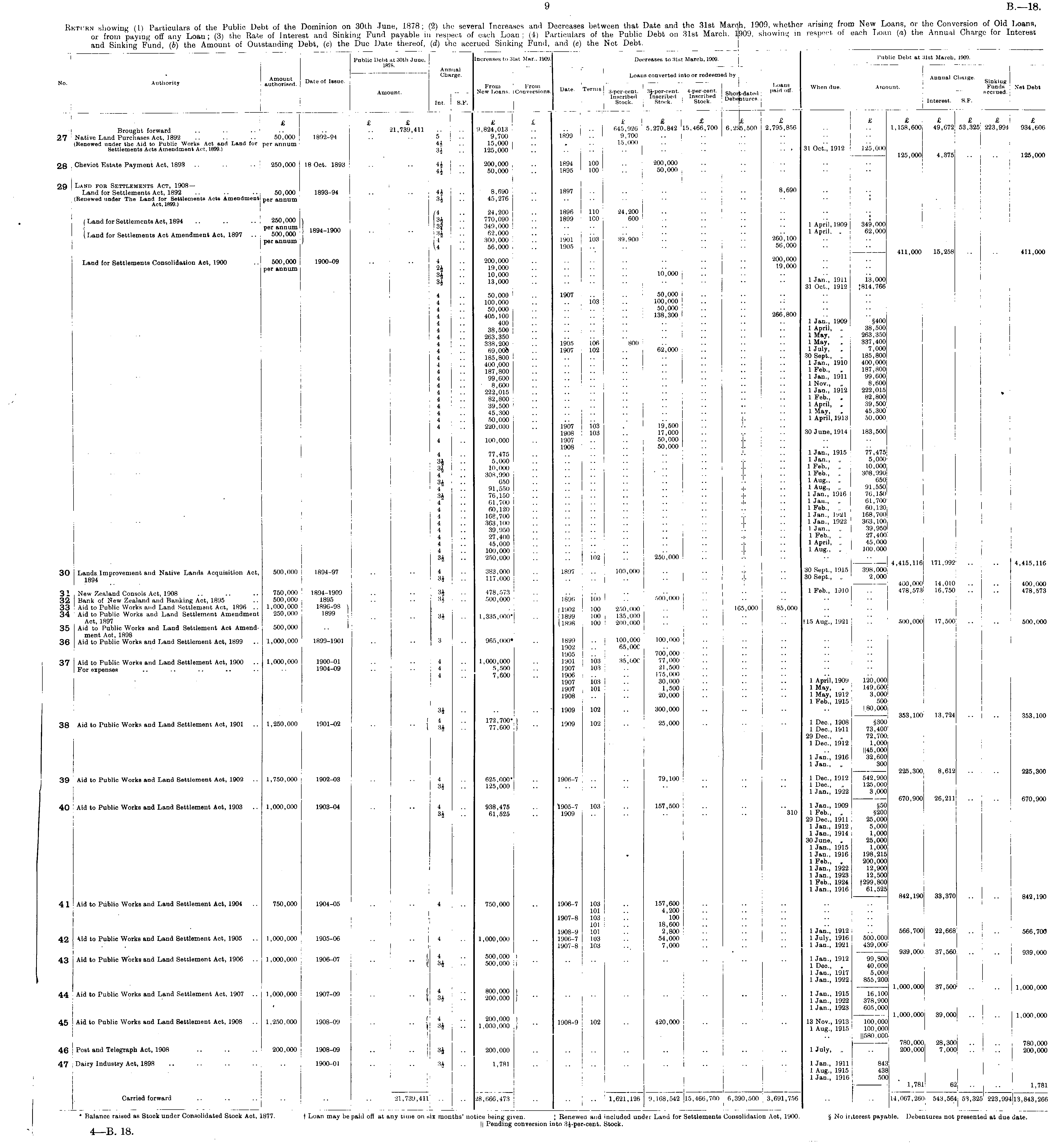 Return showing (1) Particulars of the Public Debt of the Dominion on 30th June, 1878; (2) the several Increases and Decreases between that Date and the 31st March, 1909, whether arising from New Loans, or the Conversion of Old Loans, or from paying off any Loan; (3) the Rate of Interest and Sinking Fund payable in respect of each Loan; (4) Particulars of the Public Debt on 31st March, 1909, showing in respect of each Loan (a) the Annual Charge for Interest and Sinking Fund, (b) the Amount of Outstanding Debt, (c) the Due Date thereof, (d) the accrued Sinking Fund, and (e) the Net Debt.