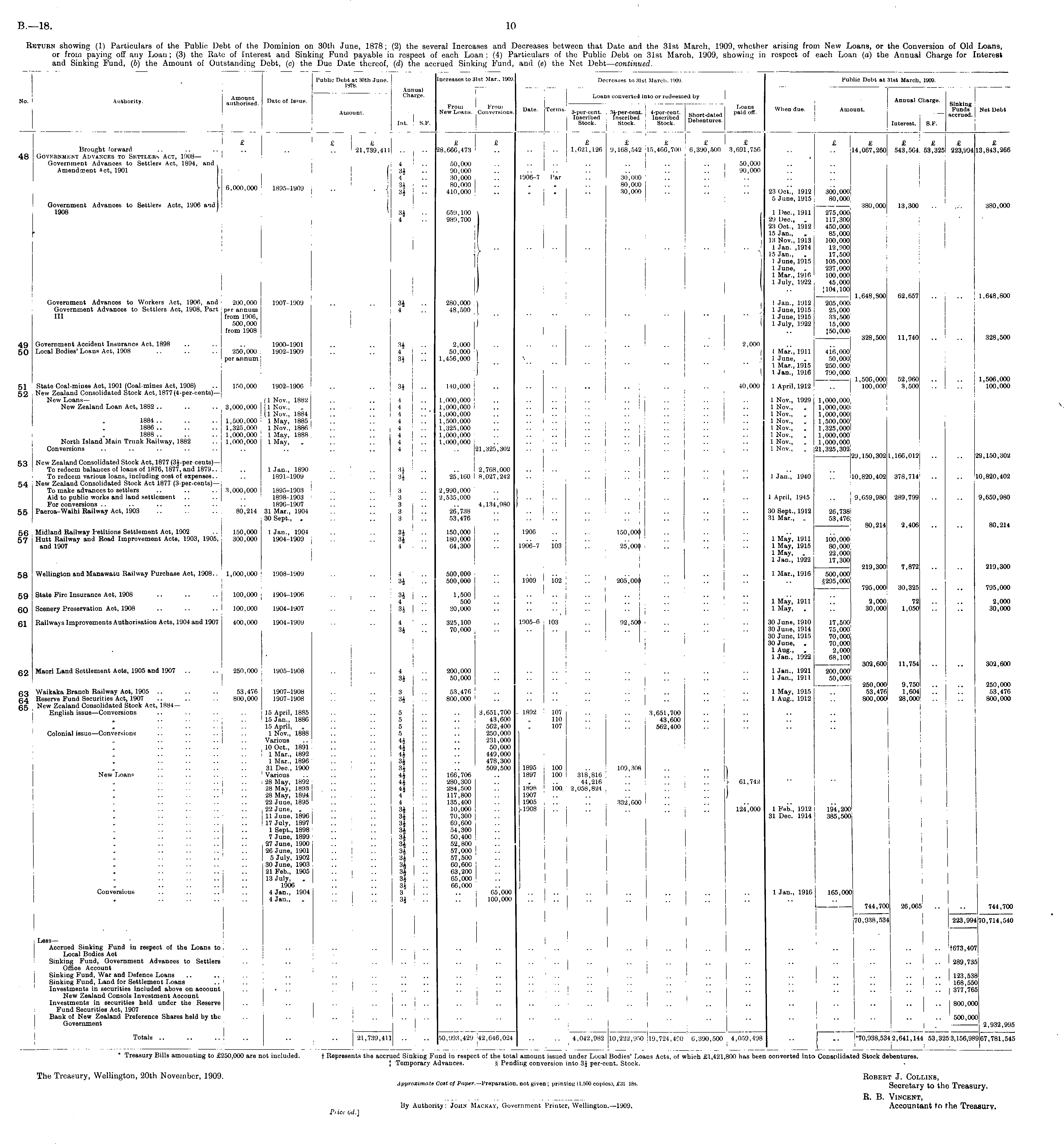 Return showing (1) Particulars of the Public Debt of the Dominion on 30th June, 1878; (2) the several Increases and Decreases between that Date and the 31st March, 1909, whether arising from New Loans, or the Conversion of Old Loans, or from paying off any Loan; (3) the Rate of Interest and Sinking Fund payable in respect of each Loan; (4) Particulars of the Public Debt on 31st March, 1909, showing in respect of each Loan (a) the Annual Charge for Interest and Sinking Fund, (b) the Amount of Outstanding Debt, (c) the Due Date thereof, (d) the accrued Sinking Fund, and (e) the Net Debt— continued.