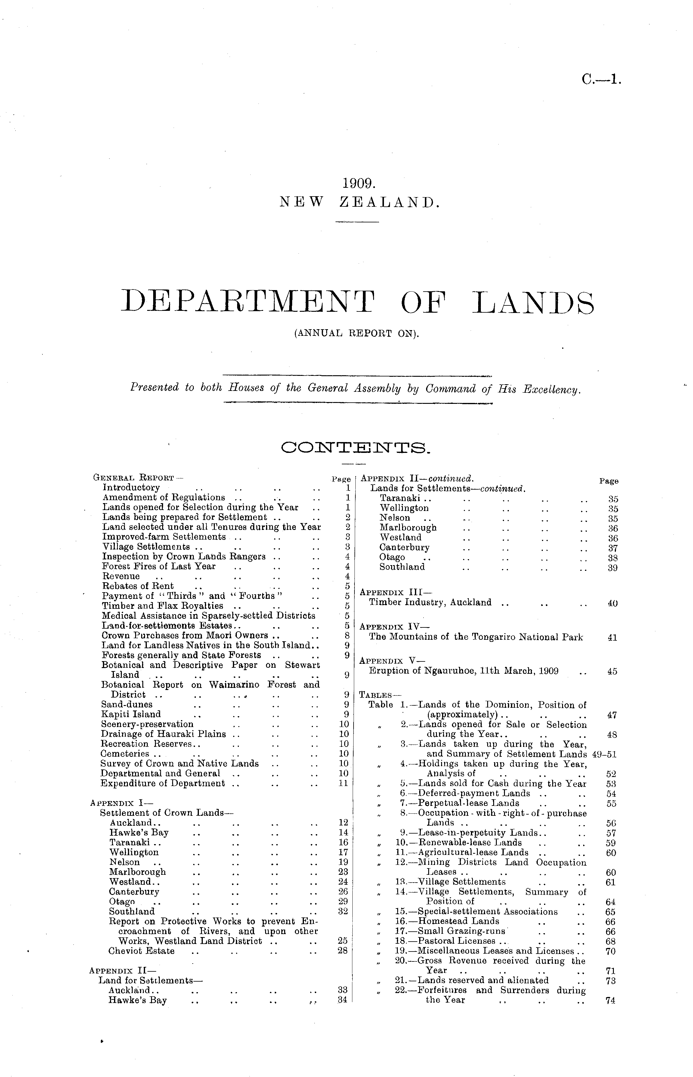 General Repoet — p age Introductory .. .. .. .. 1 Amendment of Regulations .. .. .. 1 Lands opened for Selection during the Year .. 1 Lands being prepared for Settlement .. .. 2 Land selected under all Tenures during the Year 2 Improved-farm Settlements .. .. .. 3 Village Settlements .. .. .. .. 3 Inspection by Crown Lands Rangers .. .. 4 Forest Fires of Last Year .. .. .. 4 Revenue .. .. .. .. .. 4 Rebates of Rent .. .. ... .. 5 Payment of " Thirds " and " Fourths " .. 5 Timber and Flax Royalties 5 Medical Assistance in Sparsely-settled Distriots 5 Land-for-settlements Estates.. .. .. 5 Crown Purchases from Maori Owners .. .. 8 Land for Landless Natives in the South Island.. 9 Forests generally and State Forests .. .. 9 Botanical and Descriptive Paper on Stewart Island 9 Botanical Report on Waimarino Forest and District .. .. ... .. .. 9 Sand-dunes .. .. .. .. 9 Kapiti Island .. .. .. .. 9 Scenery-preservation .. .. .. 10 Drainage of Hauraki Plains .. .. .. 10 Recreation Reserves.. .. .. .. 10 Cemeteries .. .. .. .. .. 10 Survey of Crown and Native Lands .. .. 10 Departmental and General .. .. .. 10 Expenditure of Department .. .. .. 11 Appendix I— Settlement of Crown Lands— Auckland.. .. .. .. .. 12 Hawke's Bay .. .. .. .. 14 Taranaki.. .. .. .. .. 16 Wellington .. .. .. .. 17 Nelson .. .. .. .. .. 19 Marlborough .. .. .. .. 23 Westland.. .. .. .. .. 24 Canterbury .. .. .. .. 26 Otago .. .. .. .. .. 29 Southland .. .. .. .. 32 Report on Protective Works to prevent Encroachment of Rivers, and upon other Works, Westland Land District .. .. 25 Cheviot Estate .. .. .. .. 28 Appendix ll— Land for Settlements — Auckland.. .. .. .. .. 33 Hawke's Bay .. .. ~ ~ 34 »