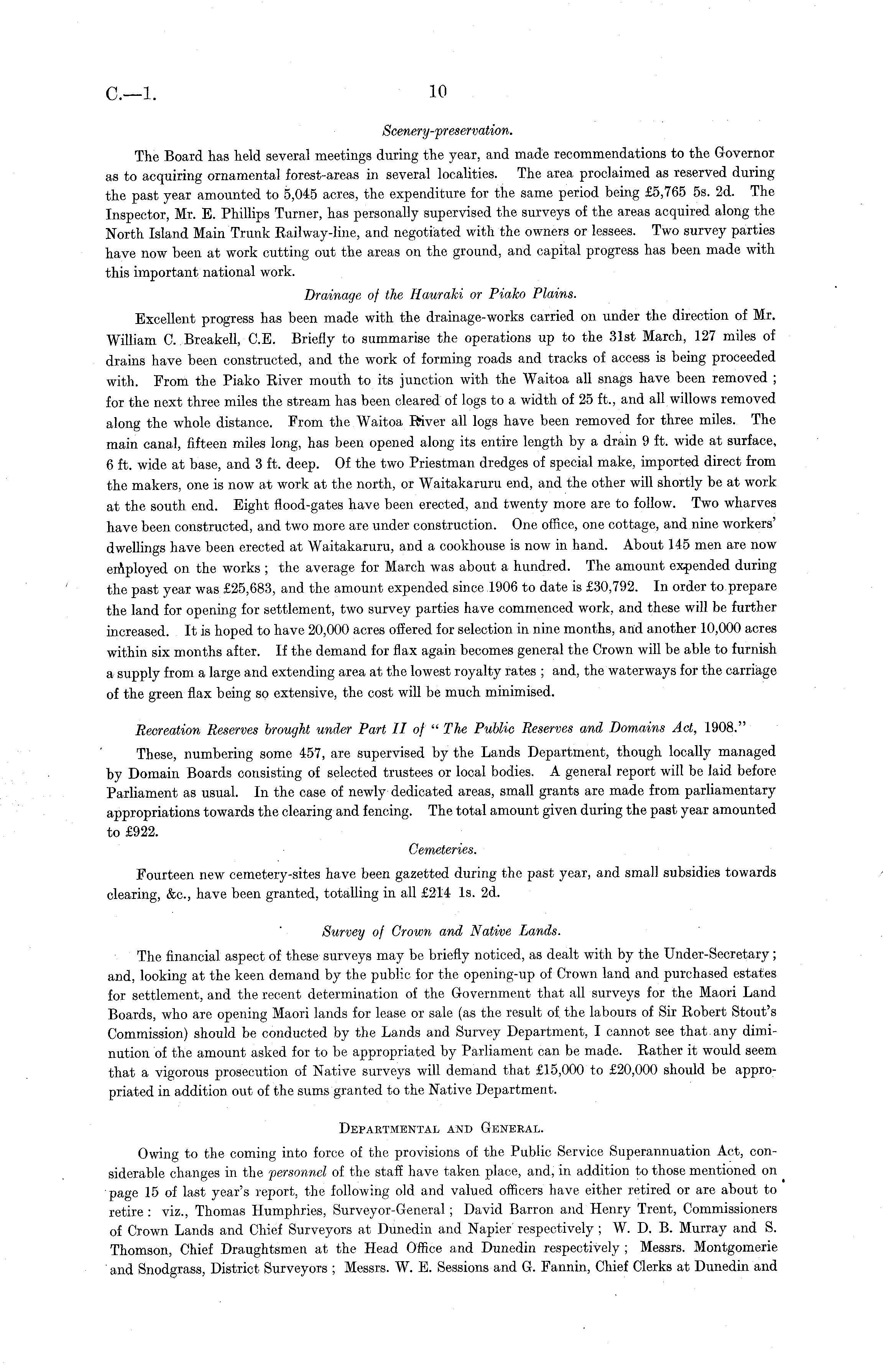 Scenery-preservation. The Board has held several meetings during the year, and made recommendations to the Governor as to acquiring ornamental forest-areas in several localities. The area proclaimed as reserved during the past year amounted to 5,045 acres, the expenditure for the same period being £5,765 ss. 2d. The Inspector, Mr. E. Phillips Turner, has personally supervised the surveys of the areas acquired along the North Island Main Trunk Railway-line, and negotiated with the owners or lessees. Two survey parties have now been at work cutting out the areas on the ground, and capital progress has been made with this important national work. Drainage of the Hauraki or Piako Plains. Excellent progress has been made with the drainage-works carried on under the direction of Mr. William C. Breakell, C.E. Briefly to summarise the operations up to the 31st March, 127 miles of drains have been constructed, and the work of forming roads and tracks of access is being proceeded with. From the Piako River mouth to its junction with the Waitoa all snags have been removed ; for the next three miles the stream has been cleared of logs to a width of 25 ft., and all willows removed along the whole distance. From the Waitoa River all logs have been removed for three miles. The main canal, fifteen miles long, has been opened along its entire length by a drain 9 ft. wide at surface, 6 ft. wide at base, and 3 ft. deep. Of the two Priestman dredges of special make, imported direct from the makers, one is now at work at the north, or Waitakaruru end, and the other will shortly be at work at the south end. Eight flood-gates have been erected, and twenty more are to follow. Two wharves have been constructed, and two more are under construction. One office, one cottage, and nine workers' dwellings have been erected at Waitakaruru, and a cookhouse is now in hand. About 145 men are now employed on the works ; the average for March was about a hundred. The amount expended during the past year was £25,683, and the amount expended since 1906 to date is £30,792. In order to prepare the land for opening for settlement, two survey parties have commenced work, and these will be further increased. It is hoped to have 20,000 acres offered for selection in nine months, and another 10,000 acres within six months after. If the demand for flax again becomes general the Crown will be able to furnish a supply from a large and extending area at the lowest royalty rates ; and, the waterways for the carriage of the green flax being so extensive, the cost will be much minimised. Recreation Reserves brought under Part II of " The Public Reserves and Domains Act, 1908." These, numbering some 457, are supervised by the Lands Department, though locally managed by Domain Boards consisting of selected trustees or local bodies. A general report will be laid before Parliament as usual. In the case of newly dedicated areas, small grants are made from parliamentary appropriations towards the clearing and fencing. The total amount given during the past year amounted to £922. Cemeteries. Fourteen new cemetery-sites have been gazetted during the past year, and small subsidies towards clearing, &c, have been granted, totalling in all £214 Is. 2d. Survey of Crown and Native Lands. The financial aspect of these surveys may be briefly noticed, as dealt with by the Under-Secretary; and, looking at the keen demand by the public for the opening-up of Crown land and purchased estates for settlement, and the recent determination of the Government that all surveys for the Maori Land Boards, who are opening Maori lands for lease or sale (as the result of. the labours of Sir Robert Stout's Commission) should be conducted by the Lands and Survey Department, I cannot see that any diminution of the amount asked for to be appropriated by Parliament can be made. Rather it would seem that a vigorous prosecution of Native surveys will demand that £15,000 to £20,000 should be appropriated in addition out of the sums granted to the Native Department. Departmental and General. Owing to the coming into force of the provisions of the Public Service Superannuation Act, considerable changes in the personnel of the staff have taken place, and, in addition to those mentioned on page 15 of last year's report, the following old and valued officers have either retired or are about to retire : viz., Thomas Humphries, Surveyor-General; David Barron and Henry Trent, Commissioners of Crown Lands and Chief Surveyors at Dunedin and Napier respectively ; W. D. B. Murray and S. Thomson, Chief Draughtsmen at the Head Office and Dunedin respectively ; Messrs. Montgomerie and Snodgrass, District Surveyors ; Messrs. W. E. Sessions and G. Fannin, Chief Clerks at Dunedin and