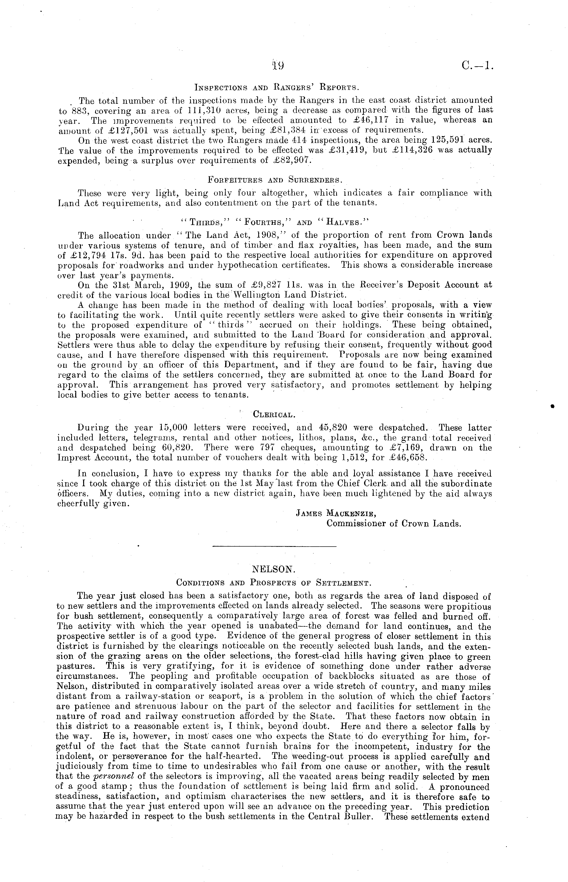 Inspections and Rangers' Reports. The total number of the inspections made by the Rangers in the east coast district amounted to 883, covering an area of 111,310 acres, being a decrease as compared with the figures of last year. The improvements required to be effected amounted to £46,117 in value, whereas an amount of £127,501 was actually spent, being £81,384 in excess of requirements. On the west coast district the two Rangers made 414 inspections, the area being 125,591 acres. The value of the improvements required to be effected was £31,419, but £114,326 was actually expended, being a surplus over requirements of £82,907. Forfeitures and Surrenders. These were very light, being only four altogether, which indicates a fair compliance with Land Act requirements, and also contentment on the part of the tenants. "Thirds," "Fourths," and "Halves." The allocation under "The Land Act, 1908," of the proportion of rent from Crown lands under various systems of tenure, and of timber and flax royalties, has been made, and the sum of £12,794 17s. 9d. has been paid to the respective local authorities for expenditure on approved proposals for roadworks and under hypothecation certificates. This shows a considerable increase over last year's payments. On the 31st March, 1909, the sum of £9,827 lis. was in the Receiver's Deposit Account at credit of the various local bodies in the Wellington Land District. A change has been made in the method of dealing with local bodies' proposals, with a view to facilitating the work. Until quite recently settlers were asked to give their consents in writing to the proposed expenditure of " thirds " accrued on their holdings. These being obtained, the proposals were examined, and submitted to the Land 'Board for consideration and approval. Settlers were thus able to delay the expenditure by refusing their consent, frequently without good cause, and 1 have therefore dispensed with this requirement. Proposals are now being examined on the ground by an officer of this Department, and if they are found to be fair, having due regard to the claims of the settlers concerned, they are submitted at once to the Land Board for approval. This arrangement has proved very satisfactory, and promotes settlement by helpinglocal bodies to give better access to tenants. Clerical. During the year 15,000 letters were received, and 45,820 were despatched. These latter included letters, telegrams, rental and other notices, lithos, plans, fee, the grand total received and despatched being 60,820. There were 797 cheques, amounting to £7,169, drawn on the Imprest Account, the total number of vouchers dealt with being 1,512, for £46,658. In conclusion, I have to express my thanks for the able and loyal assistance I have received since I took charge of this district on the Ist May last from the Chief Clerk and all the subordinate officers. My duties, coming into a new district again, have been much lightened by the aid always cheerfully given. James Mackenzie, Commissioner of Crown Lands.