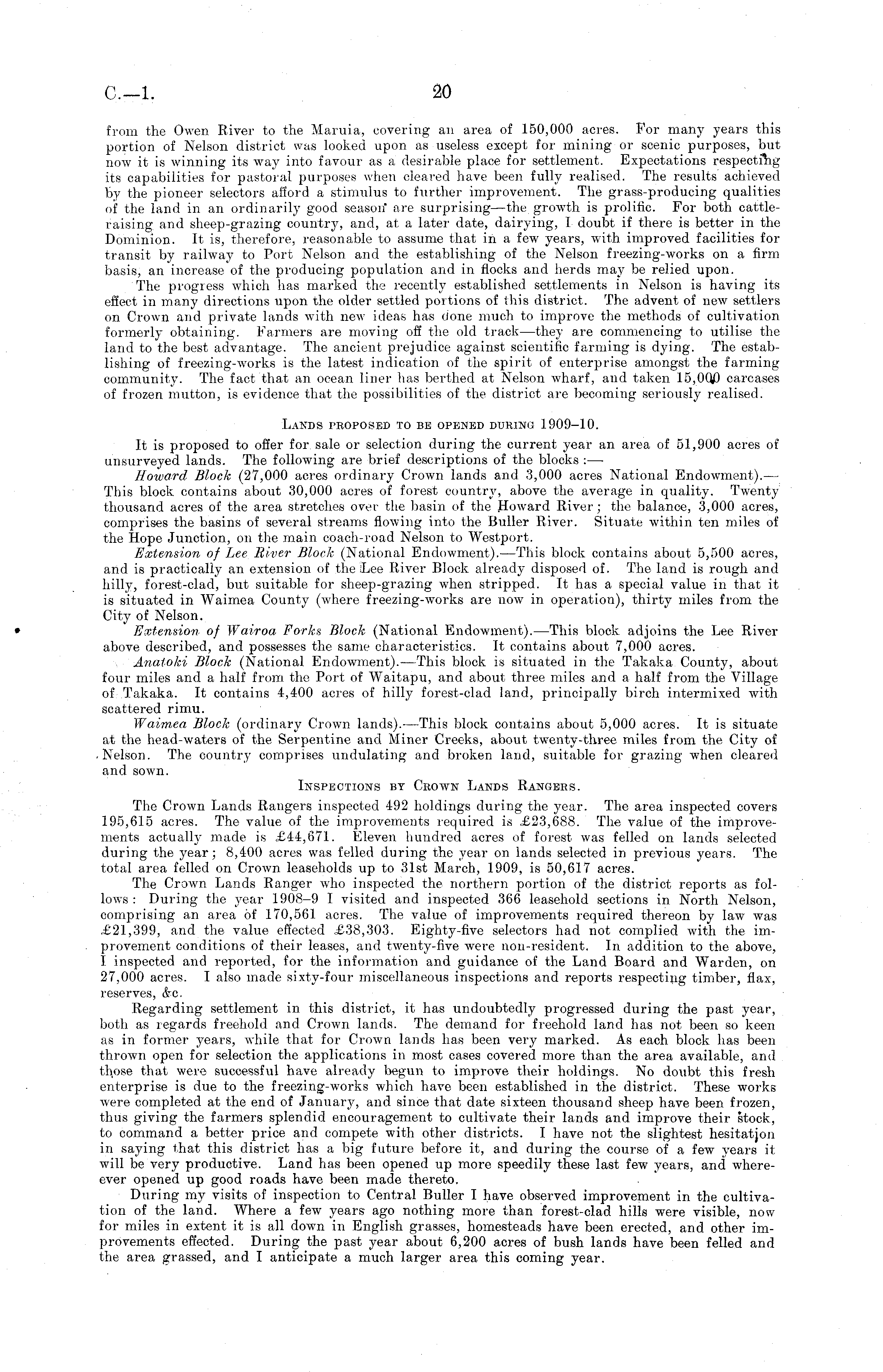 from the Owen River to the Maruia, covering an area of 150,000 acres. For many years this portion of Nelson district was looked upon as useless except for mining or scenic purposes, but now it is winning its way into favour as a desirable place for settlement. Expectations respecting its capabilities for pastoral purposes when cleared have been fully realised. The results achieved by the pioneer selectors afford a stimulus to further improvement. The grass-producing qualities of the land in an ordinarily good season* are surprising—the growth is prolific. For both cattleraising and sheep-grazing countrj', and, at a later date, dairying, I doubt if there is better in the Dominion. It is, therefore, reasonable to assume that in a few years, with improved facilities for transit by railway to Port Nelson and the establishing of the Nelson freezing-works on a firm basis, an increase of the producing population and in flocks and herds may be relied upon. The progress which has marked the recently established settlements in Nelson is having its effect in many directions upon the older settled portions of this district. The advent of new settlers on Crown and private lands with new ideas has done much to improve the methods of cultivation formerly obtaining. Farmers are moving off the old track—they are commencing to utilise the land to the best advantage. The ancient prejudice against scientific farming is dying. The establishing of freezing-yvorks is the latest indication of the spirit of enterprise amongst the farming community. The fact that an ocean liner has berthed at Nelson wharf, and taken 15,0Q0 carcases of frozen mutton, is evidence that the possibilities of the district are becoming seriously realised. Lands proposed to be opened during 1909-10. It is proposed to offer for sale or selection during the current year an area of 51,900 acres of unsurveyed lands. The following are brief descriptions of the blocks : — Howard Block (27,000 acres ordinary Crown lands and 3,000 acres National Endowment). — This block contains about 30,000 acres of forest country, above the average in quality. Twenty thousand acres of the area stretches over the basin of the Howard River ; the balance, 3,000 acres, comprises the basins of several streams flowing into the Buller River. Situate within ten miles of the Hope Junction, on the main coach-road Nelson to Westport. Extension of Lee River Block (National Endowment). —This block contains about 5,500 acres, and is practically an extension of the Lee River Block already disposed of. The land is rough and hilly, forest-clad, but suitable for sheep-grazing when stripped. It has a special value in that it is situated in Waimea County (where freezing-works are now in operation), thirty miles from the City of Nelson. Extension of Wairoa Forks Block (National Endowment). —This block adjoins the Lee River above described, and possesses the same characteristics. It contains about 7,000 acres. Anatoki Block (National Endowment). —This block is situated in the Takaka County, about four miles and a half from the Port of Waitapu, and about three miles and a half from the Village of Takaka. It contains 4,400 acres of hilly forest-clad land, principally birch intermixed with scattered rimu. Waimea Block (ordinary Crown lands). —This block contains about 5,000 acres. It is situate at the head-waters of the Serpentine and Miner Creeks, about twenty-three miles from the City of Nelson. The country comprises undulating and broken land, suitable for grazing when cleared and sown. Inspections by Crown Lands Rangers. The Crown Lands Rangers inspected 492 holdings during the year. The area inspected covers 195,615 acres. The value of the improvements required is £23,688. The value of the improvements actually made is £44,671. Eleven hundred acres of forest was felled on lands selected during the year; 8,400 acres was felled during the year on lands selected in previous years. The total area felled on Crown leaseholds up to 31st March, 1909, is 50,617 acres. The Crown Lands Ranger who inspected the northern portion of the district reports as follows : During the year 1908-9 I visited and inspected 366 leasehold sections in North Nelson, comprising an area of 170,561 acres. The value of improvements required thereon by law was £21,399, and the value effected £38,303. Eighty-five selectors had not complied with the improvement conditions of their leases, and twenty-five were non-resident. In addition to the above, I inspected and reported, for the information and guidance of the Land Board and Warden, on 27,000 acres. I also made sixty-four miscellaneous inspections and reports respecting timber, flax, reserves, fee. Regarding settlement in this district, it has undoubtedly progressed during the past year, both as regards freehold and Crown lands. The demand for freehold land has not been so keen as in former years, while that for Crown lands has been very marked. As each, block has been thrown open for selection the applications in most cases covered more than the area available, and those that were successful have already begun to improve their holdings. No doubt this fresh enterprise is due to the freezing-works which have been established in the district. These works were completed at the end of January, and since that date sixteen thousand sheep have been frozen, thus giving the farmers splendid encouragement to cultivate their lands and improve their stock, to command a better price and compete with other districts. I have not the slightest hesitatjon in saying that this district has a big future before it, and during the course of a few years it will be very productive. Land has been opened up more speedily these last few years, and whereever opened up good roads have been made thereto. During my visits of inspection to Central Buller I have observed improvement in the cultivation of the land. Where a few years ago nothing more than forest-clad hills wer